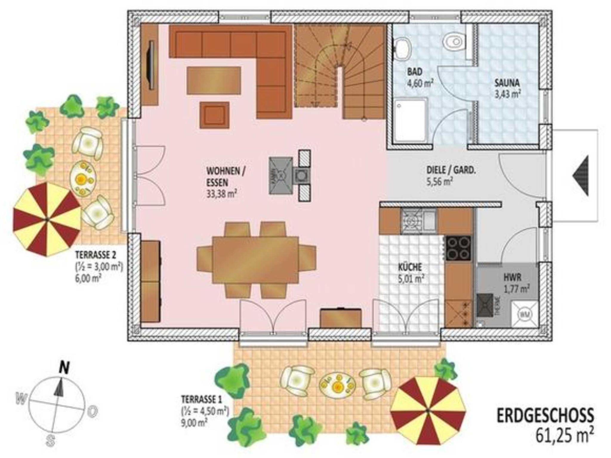 Ein gemütlicher Kaminofen und die geschmackvolle Einrichtung des lichtdurchfluteten Wohnbereichs mit offener Küche und Essbereich im Erdgeschoss heißt Sie herzlich willkommen. Zur hochwertigen Ausstattung gehören selbstverständlich auch eine Stereoanlage, LCD Fernseher, DVD Player und kostenloser Internetzugang per WLAN. Bücher und Spiele für Groß und Klein sorgen für Abwechslung, selbst wenn das Wetter einmal nicht so schön sein sollte. Im Erdgeschoß befindet sich auch ein Duschbad mit angrenzender Sauna und im Hauswirtschaftsraum eine Waschmaschine. Das Obergeschoss verfügt über drei Schlafzimmer mit insgesamt sechs Betten - 1 Doppelbett 180x200 cm, 1 Doppelbett 160x200cm, 2 Einzelbetten 90x200cm - für Erwachsene und eine zusätzliche Aufbettung für ein Kleinkind (Reisekinderbett, Kinderhochstuhl vorhanden). Ergänzt wird der Bereich durch ein großzügiges Bad mit Badewanne, Doppelwaschtisch und reichlich Ablagemöglichkeiten.