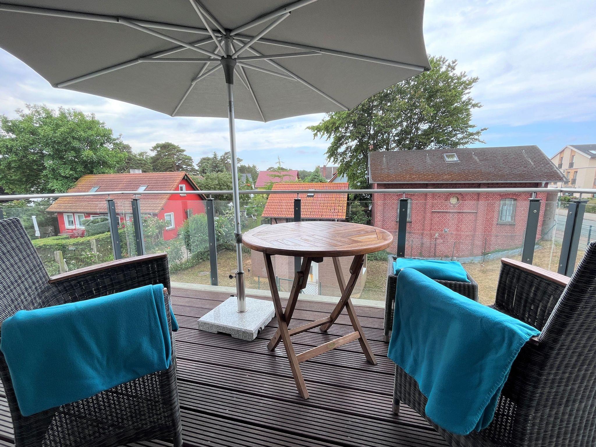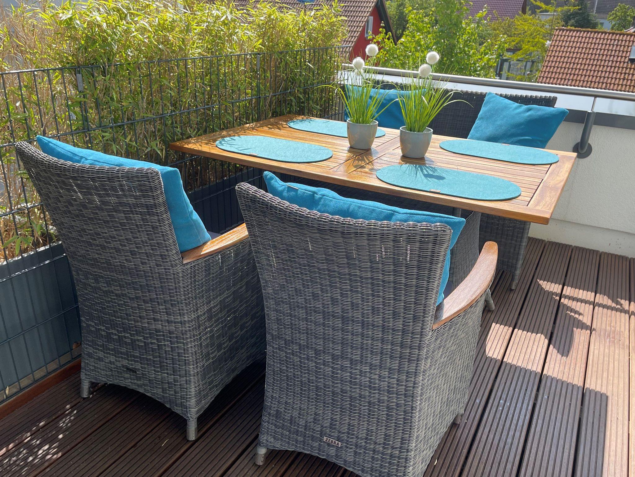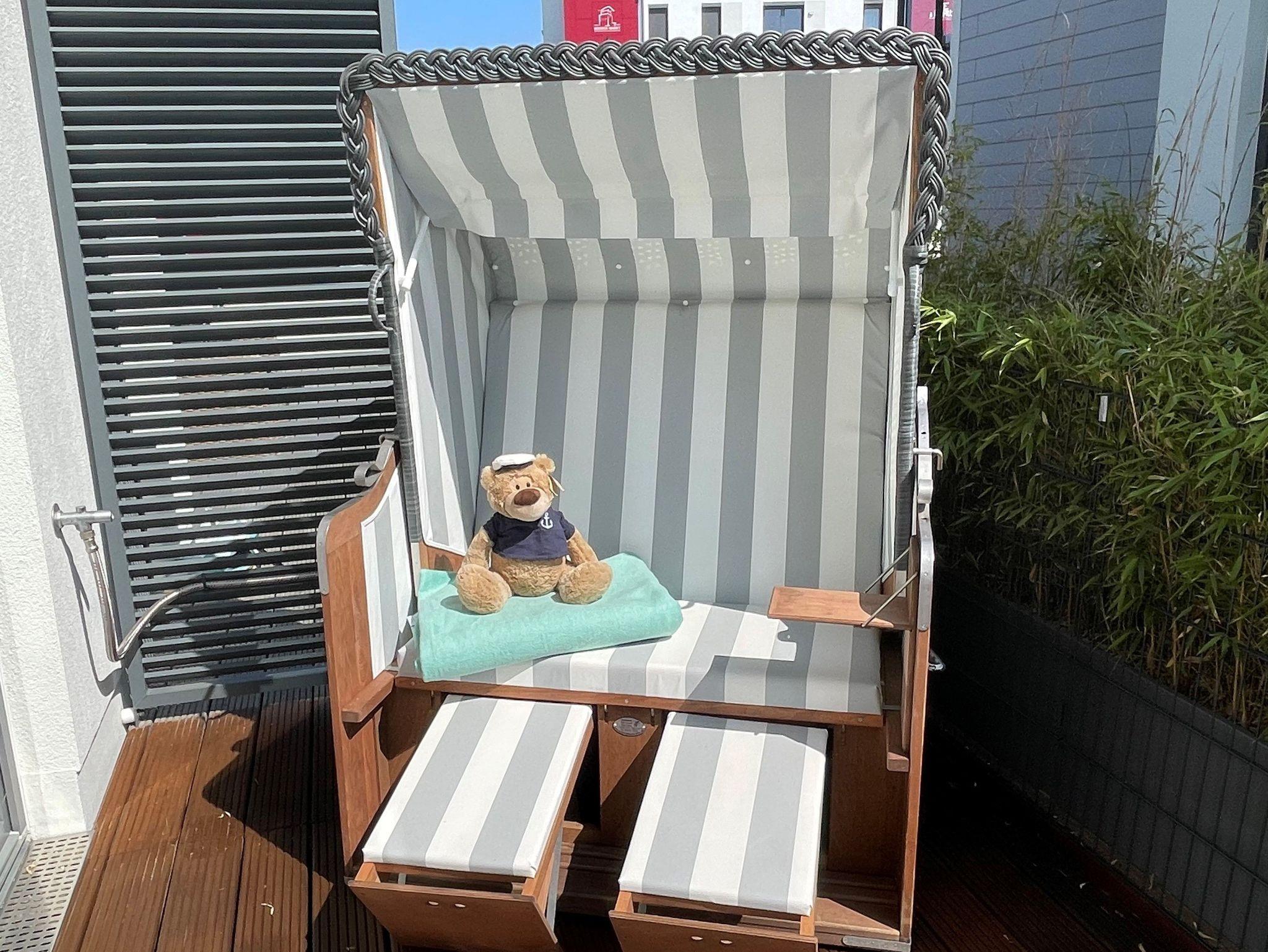Die Wohnung verfügt über eine große Dachterrasse mit Strandkorb und einen Balkon mit Gartenmöbeln. Hier darf auch der Lotus-Grill zum Einsatz gebracht werden.