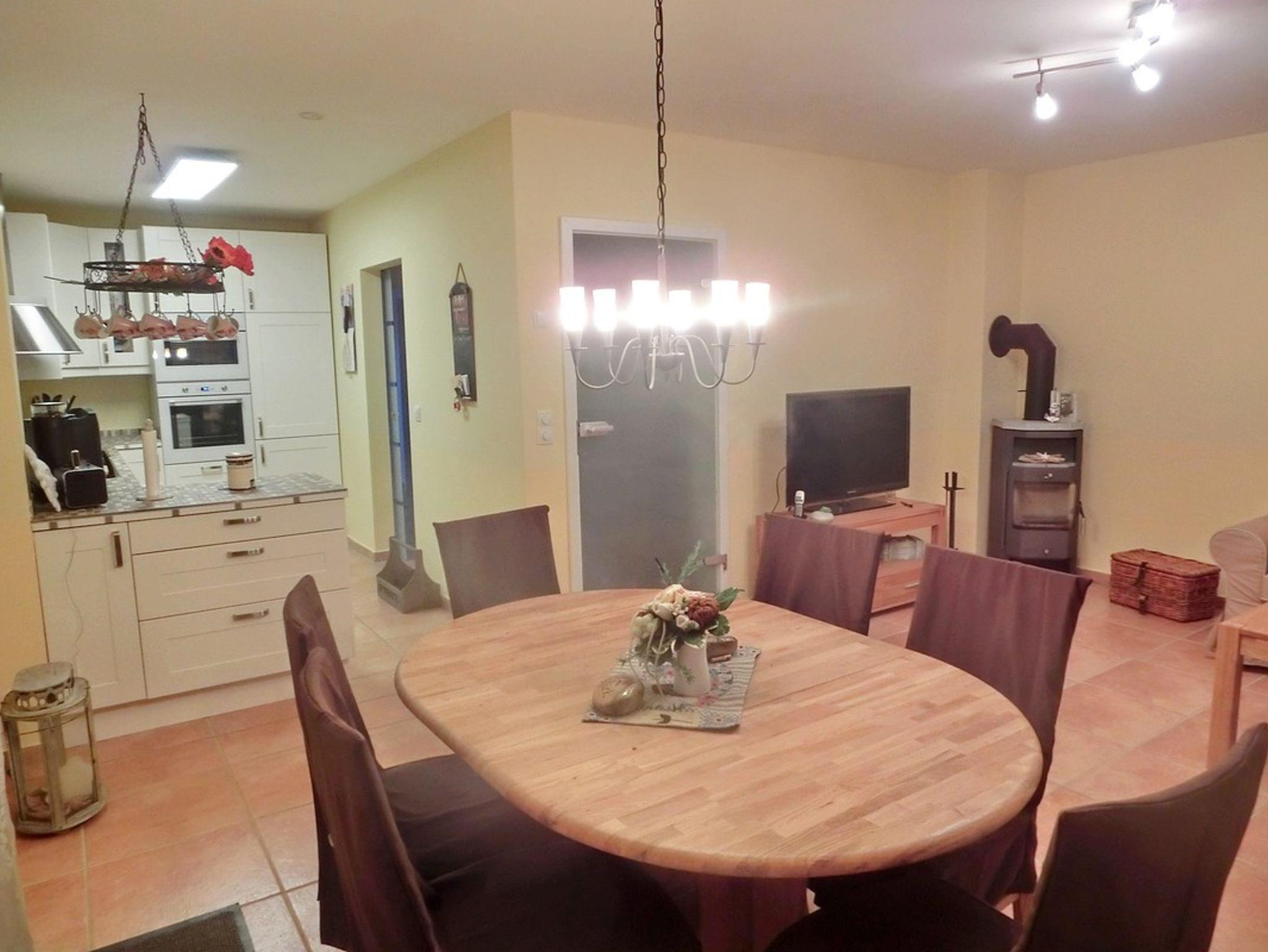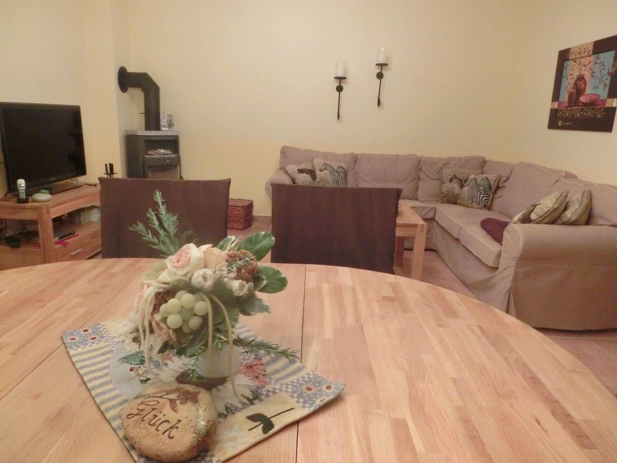 - Wohnzimmer mit großer Couch, Flachbild-TV, Kaminofen, Eßtisch