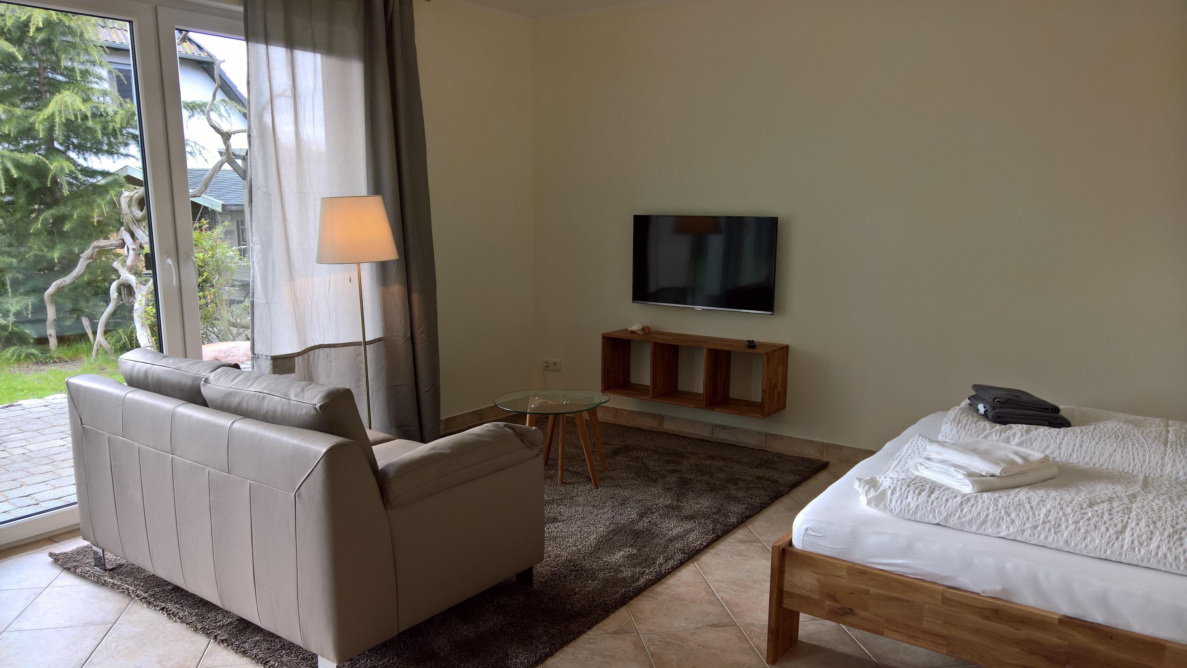 Der geflieste Wohn- Schlafraum ist 30 qm groß und verfügt über eine neue Einbauküche inkl. Geschirrspüler. Ein Essplatz mit einem geölten Eichentisch, zwei Lederswingersessel und ein Wohnbereich mit Ledercouch, Teppich und großem Flat-TV mit Sat-Empfang runden das gemütliche Ambiente ab.