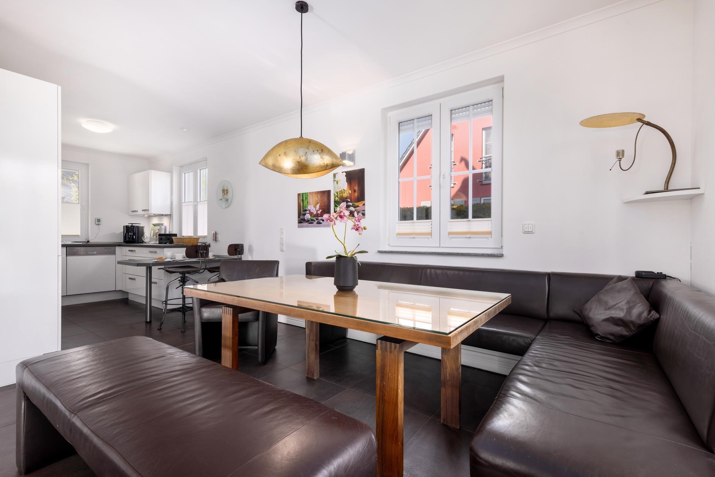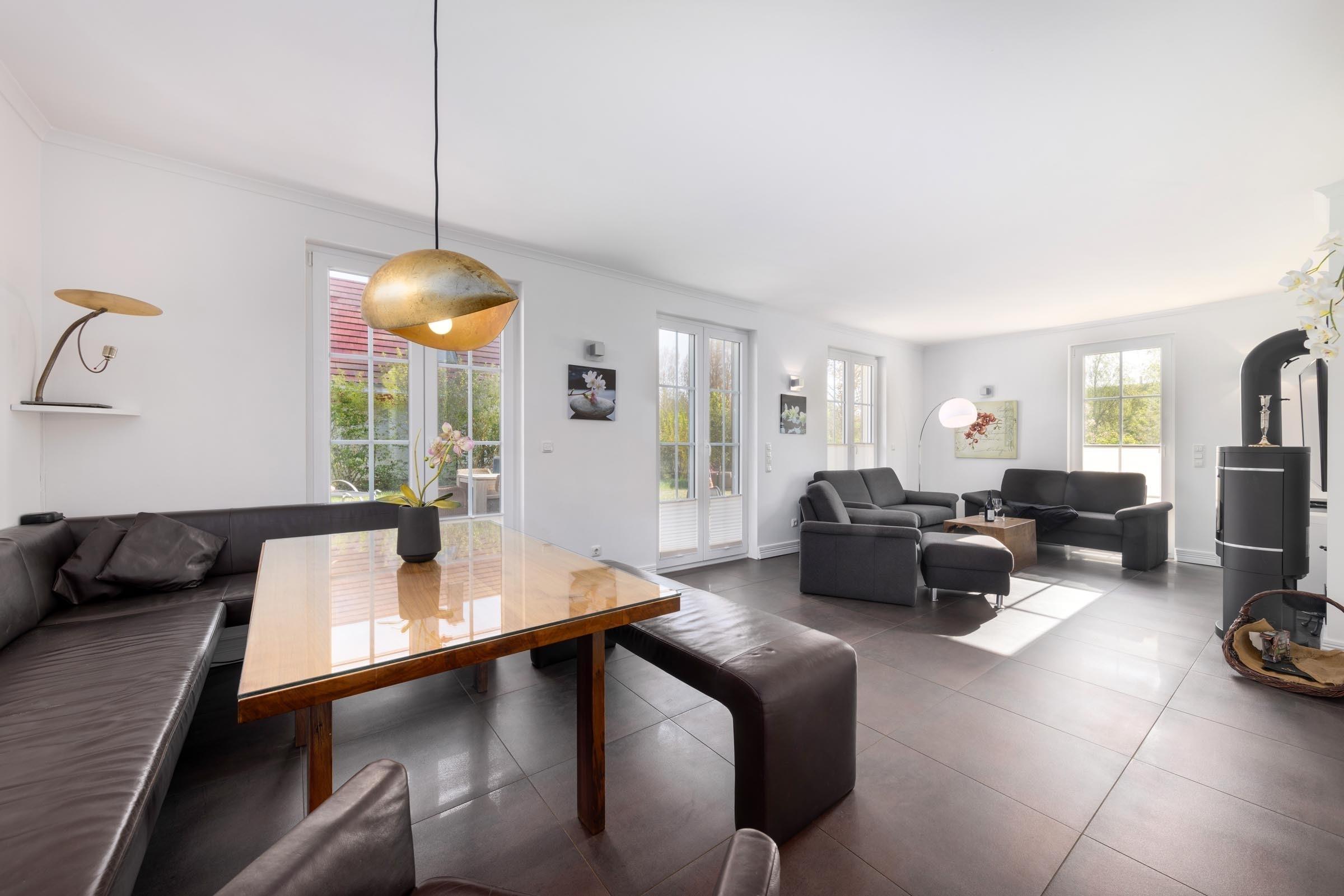 Das Haus zeichnet sich durch seine exklusiven Details aus, darunter eine gekalkte Eichenholztreppe mit integriertem dämmerungsgeschaltetem Nachtlicht, elektrische Rolläden und Fliegengitter vor den Fenstern. Der großzügige Wohn-Essbereich mit Kaminofen und integrierter Küche öffnet sich zur angrenzenden Süd-West-Terrasse, wo Sie in eleganten Gartenmöbeln entspannen können.