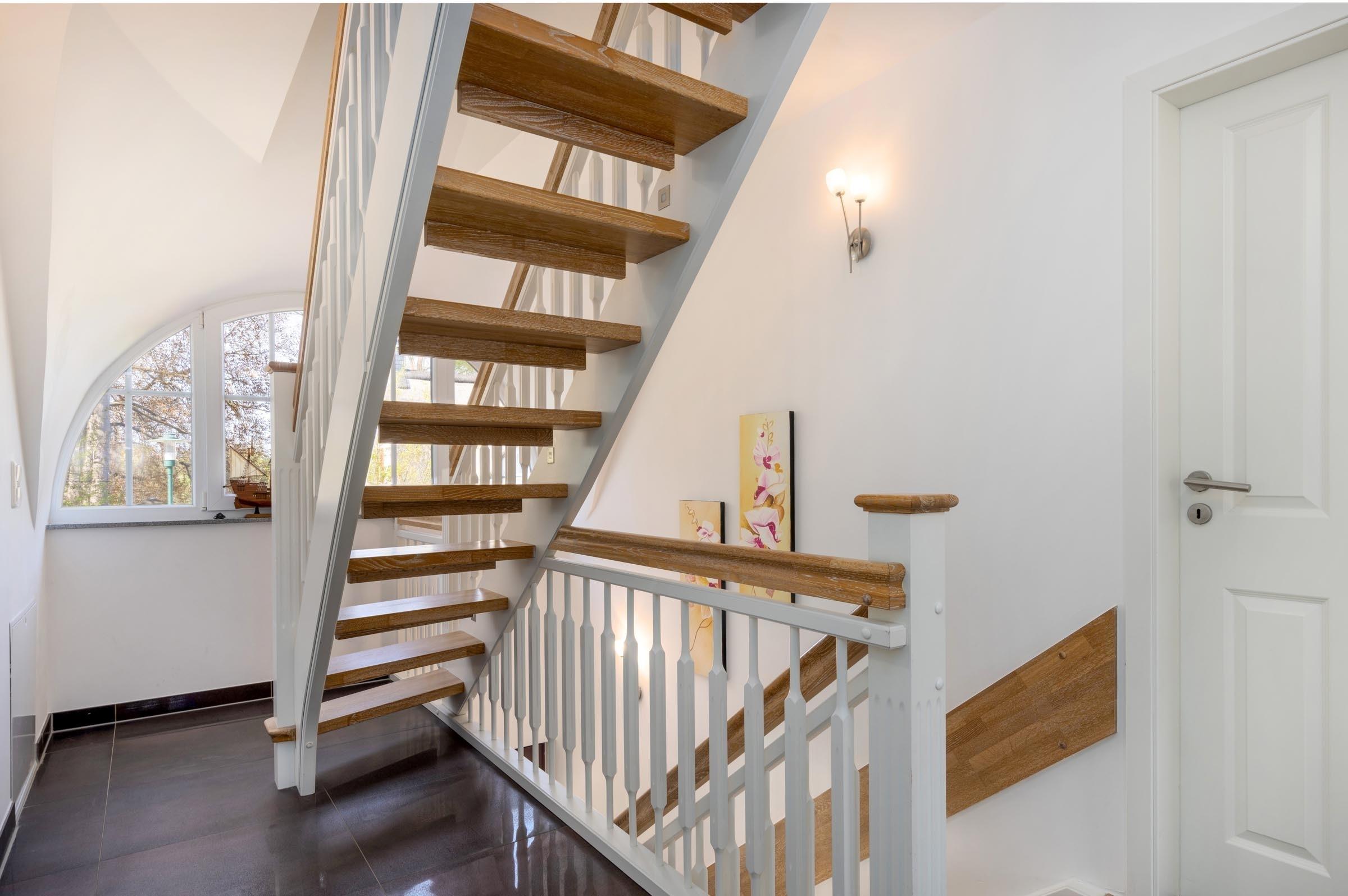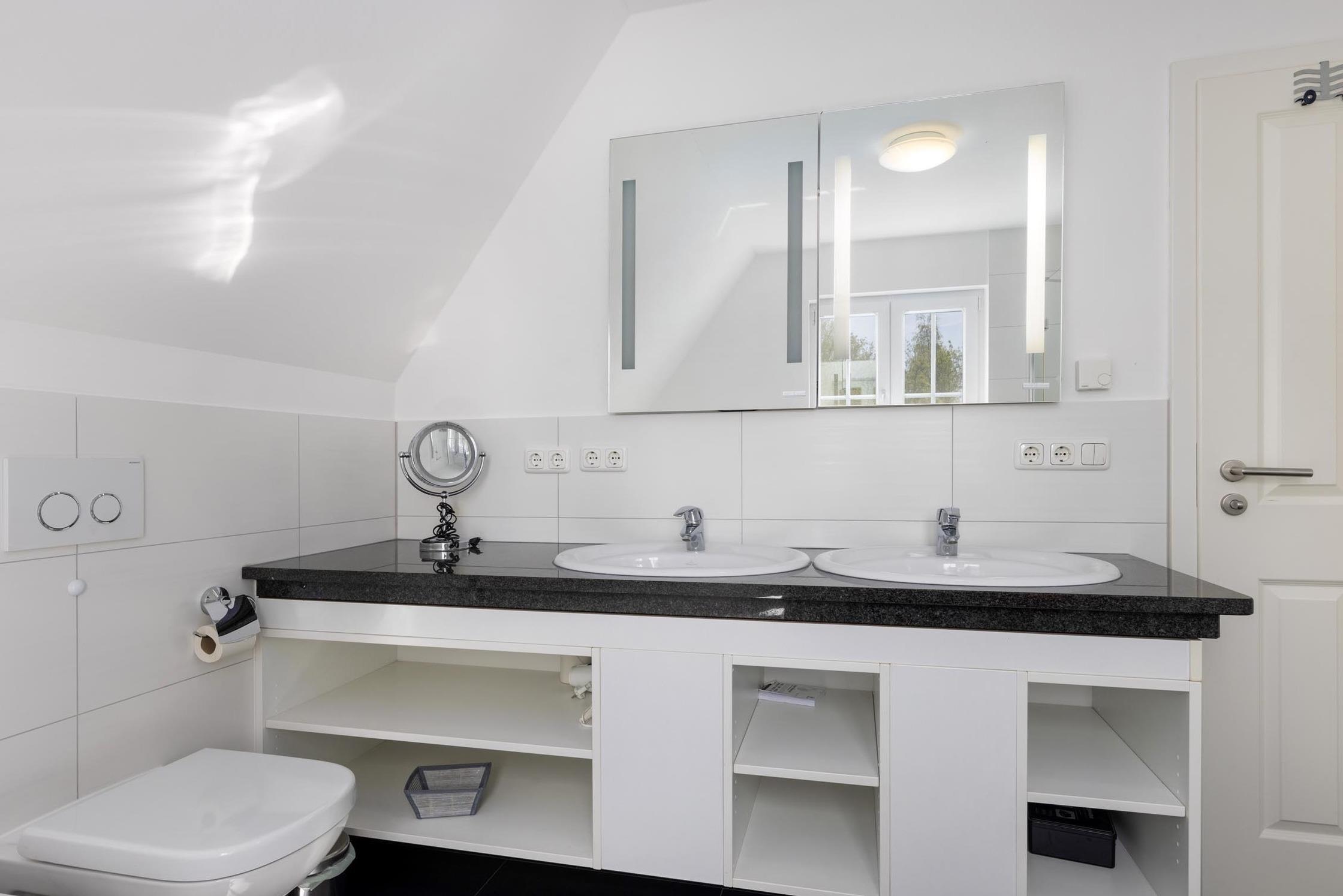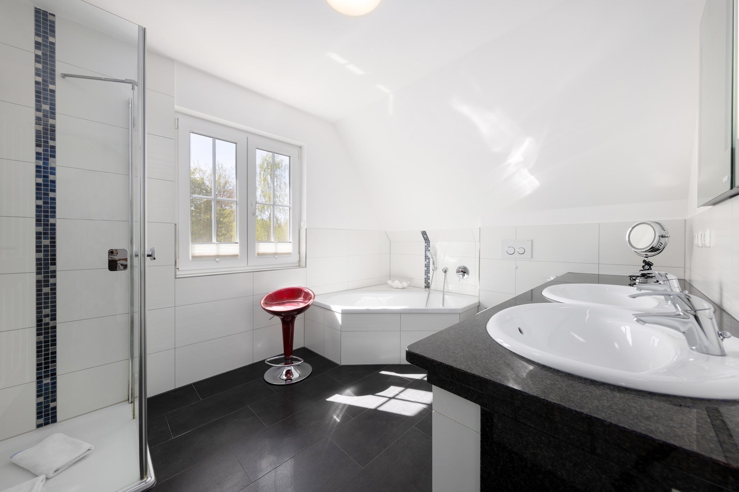 Im Erdgeschoss befindet sich ein Bad mit einer großzügigen, barrierefreien Ganzglasdusche, Doppelwaschtisch und WC. Im Obergeschoss finden Sie ein weiteres Bad mit einer Eckbadewanne, ebenfalls einer Ganzglasdusche, Doppelwaschtisch und WC. Im Dachgeschoss gibt es ein weiteres WC mit Waschtisch.