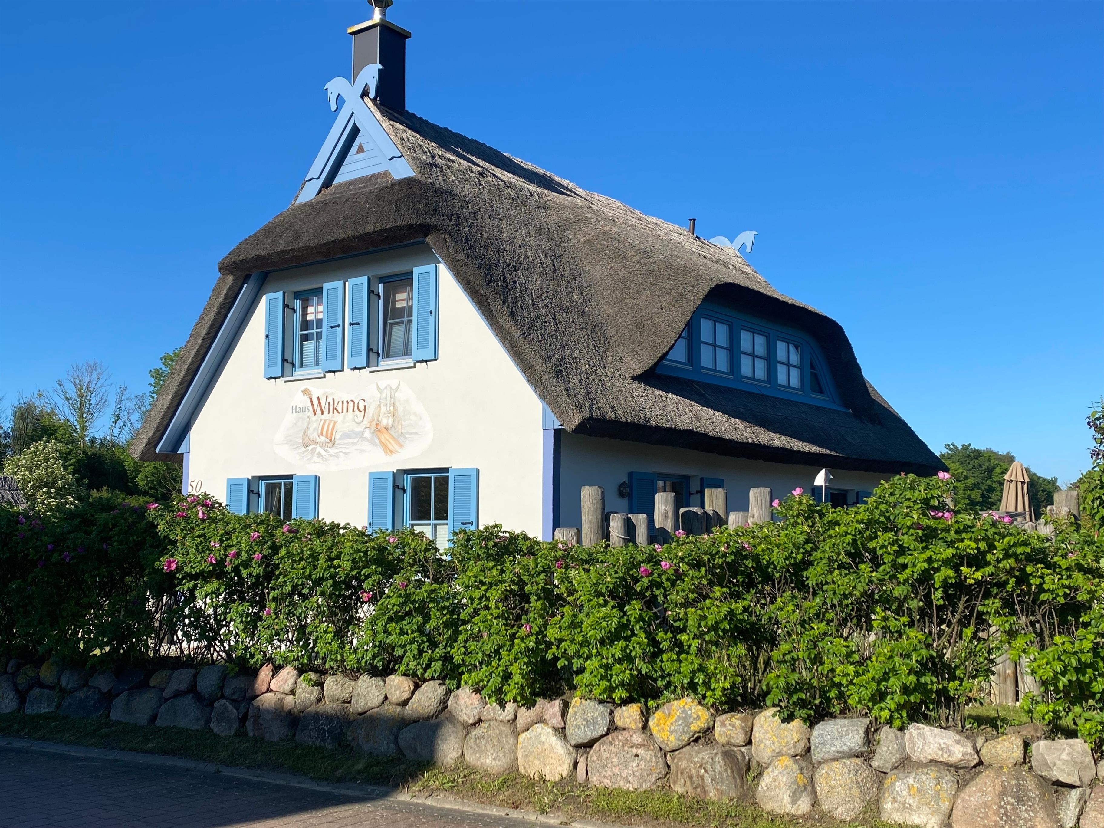 Das Ferienhaus Wiking ist ein modernes Ferienhaus unter Reet mit individueller und gemütlicher Einrichtung. Die Wohnfläche im Ferienhaus beträgt ca. 100 m² auf zwei Etagen. Das Ferienhaus Wiking verfügt über folgende Ausstattungsmerkmale: 2 PKW-Stellplätze – Sonnenterasse mit Terrassenmöbeln und Grillmöglichkeit – 2 Schlafzimmer für bis zu 6 Personen (je Schlafzimmer ein Doppelbett und ein Einzelbett sowie Kleiderschrank) – Küche mit moderner Einbauküche (Herd/Backofen, Kühlschrank mit Gefrierfach, Spülmaschine, Mikrowelle, Kaffeemaschine, Toaster, Wasserkocher) – Wohnzimmer mit Kamin, Esstisch sowie gemütliches Sofa, Sat-TV und Bücher – TV-Flachbild in Wohnzimmer (65 Zoll) sowie beiden Schlafzimmern und Küche – Internet W-Lan – Fußbodenheizung – 2 Bäder mit jeweils Dusche & WC – Badewanne – finnische Sauna – für Kinder Hochstuhl und Kinderbett auf Anfrage.