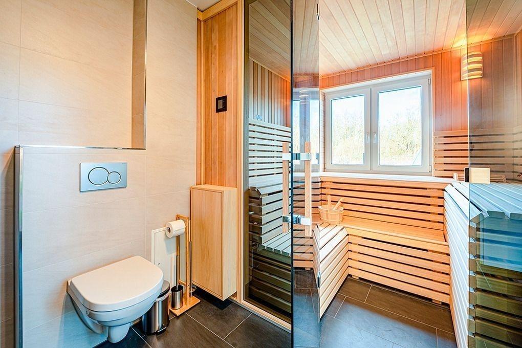Bad mit WC, Dusche und großer Sauna (8 Personen).