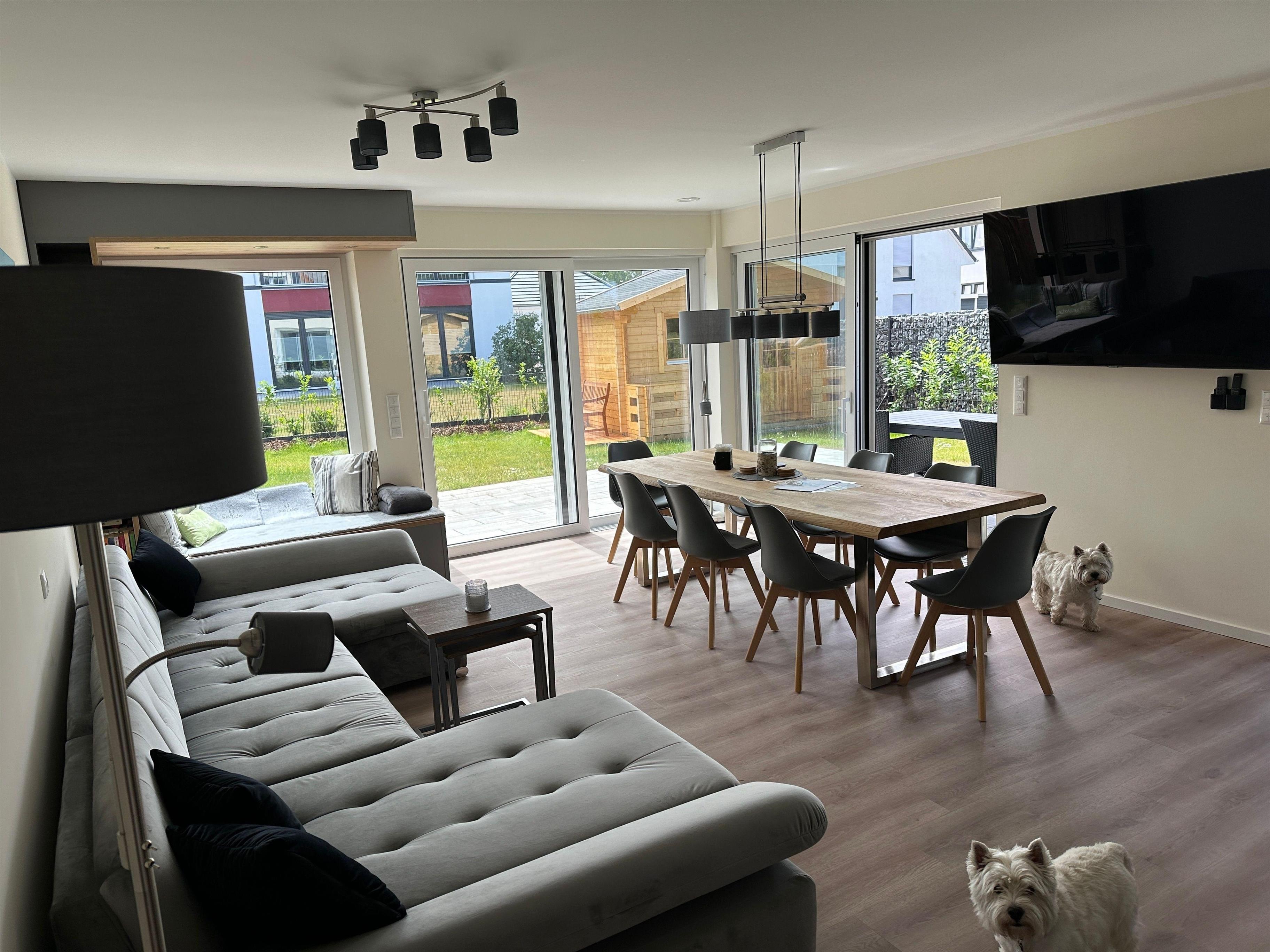 Das lichtdurchflutete Wohnzimmer ist mit einem langen Esstisch, großer Wohnlandschaft, Sitzfenster, einem großen Fernseher und Kamin ausgestattet.