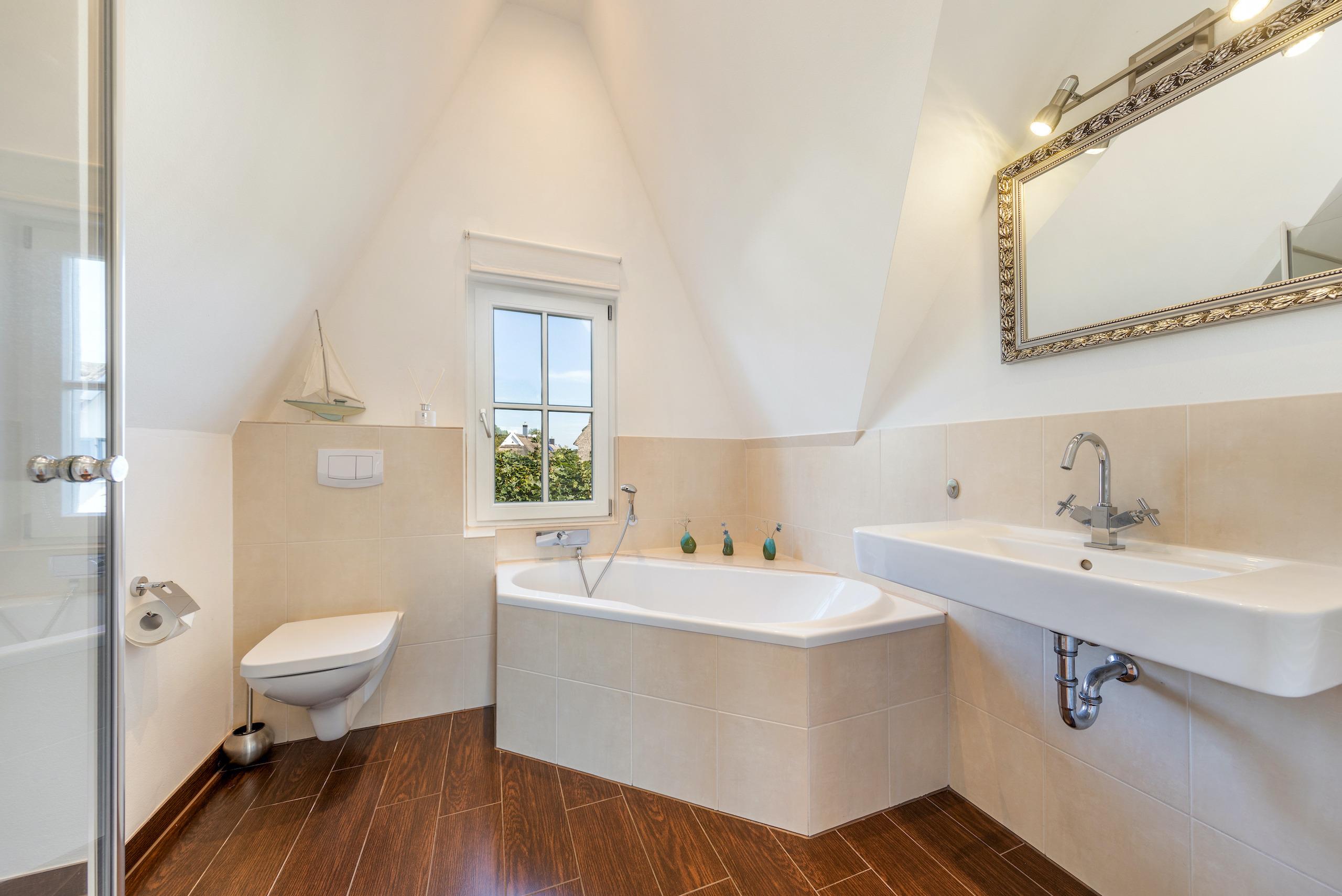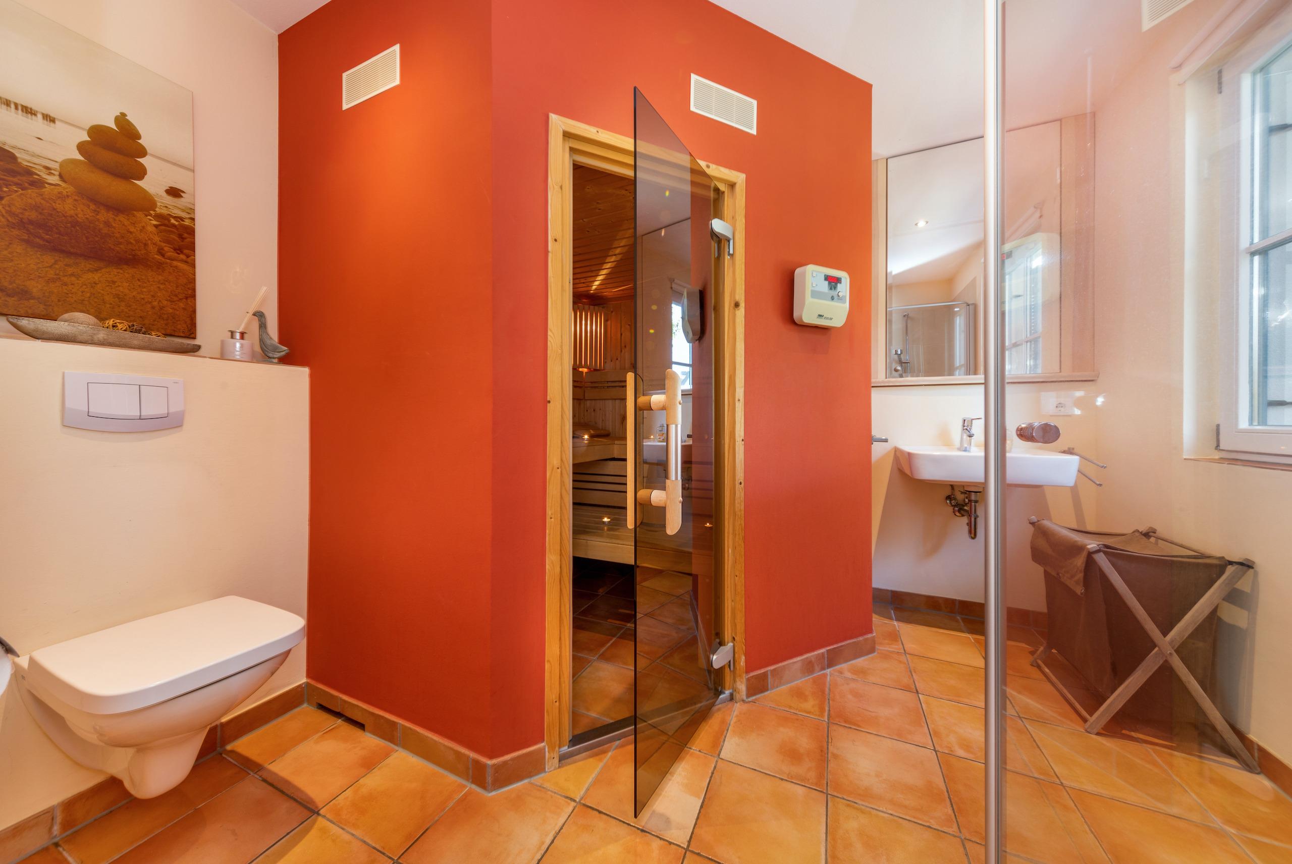 2 Bäder: Das Bad im Obergeschoss bietet eine Dusche und eine separate Badewanne. Das Ferienhaus ist zudem mit einer Sauna und weiteren Dusche ausgestattet, welche sich im großen Baderaum des Untergeschoss befinden.