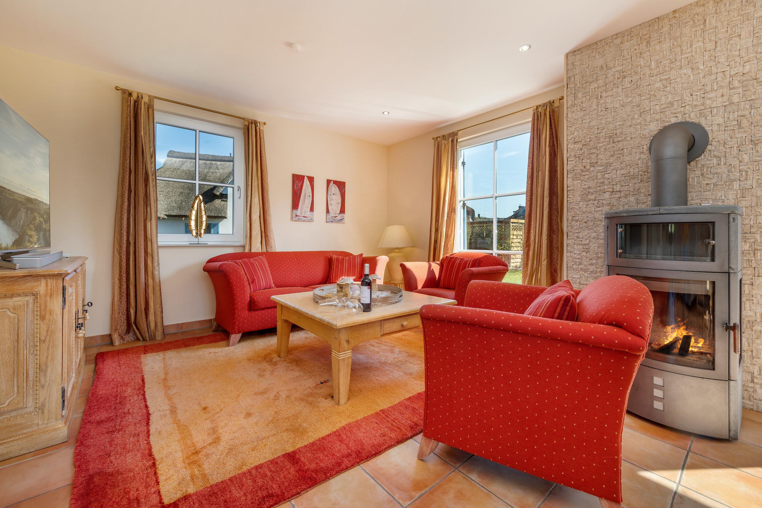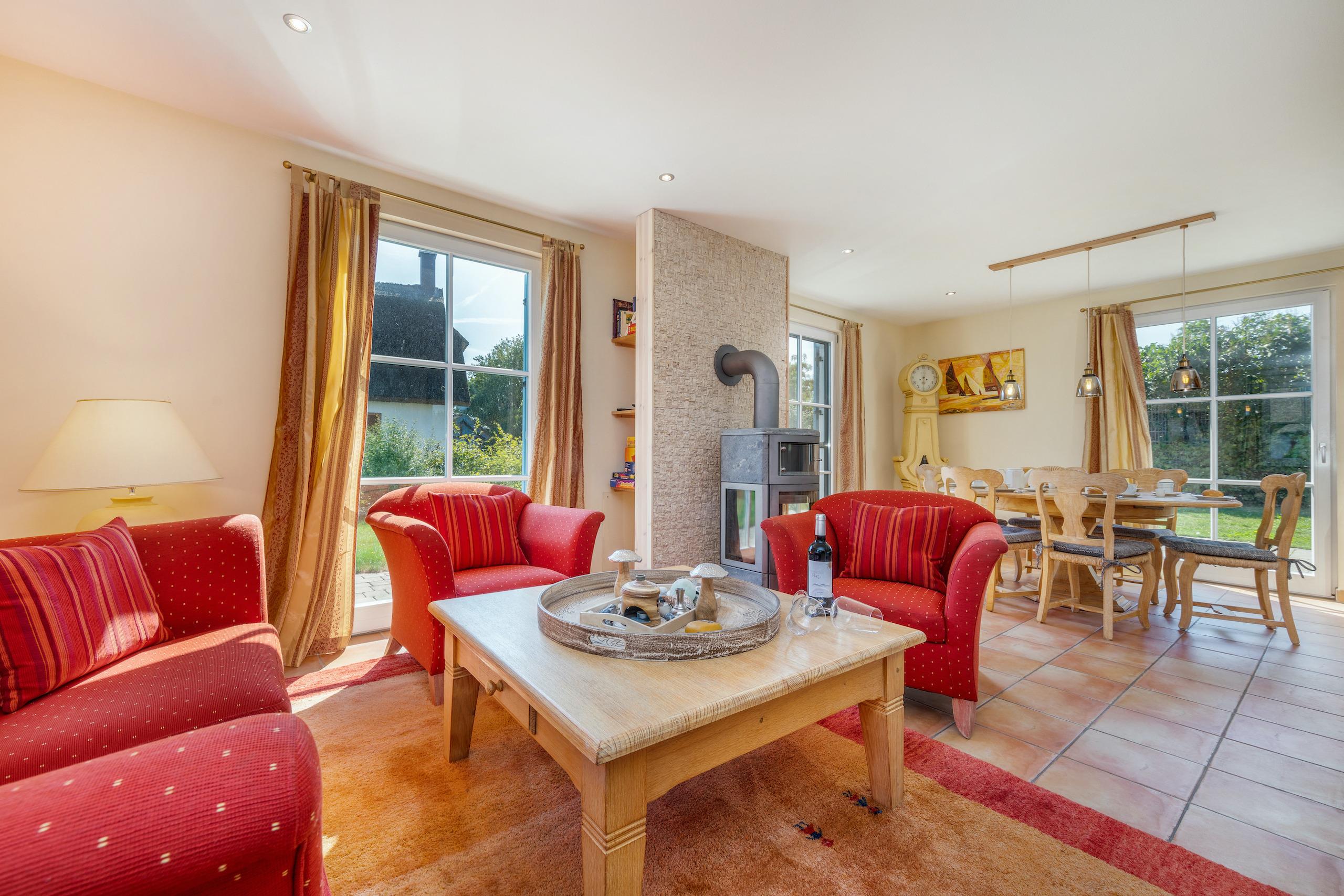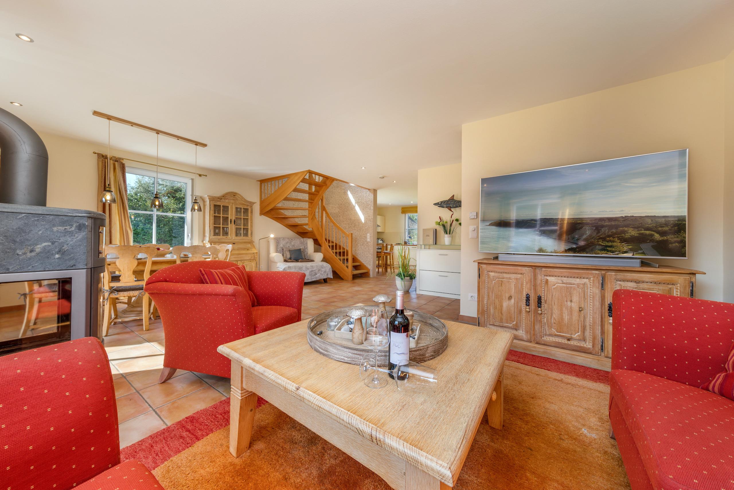 Wohnen: Die hellen Räume des offen gestalteten Wohnbereichs und die warme Holzeinrichtung verleihen dem typisch norddeutschen Reethaus "Nordlicht" eine gleichzeitig moderne sowie gemütliche Landhausatmosphäre. Hier können Sie gemütliche Abende mit Lesen oder Familienspielen vor dem Kamin verbringen, oder den großen 65" Sony 4k Smart TV mit zusätzlicher Bose Soundbar für Fernsehabende nutzen. Der ideale Ort, um alle Sinne zu verwöhnen und den Alltag hinter sich zu lassen.