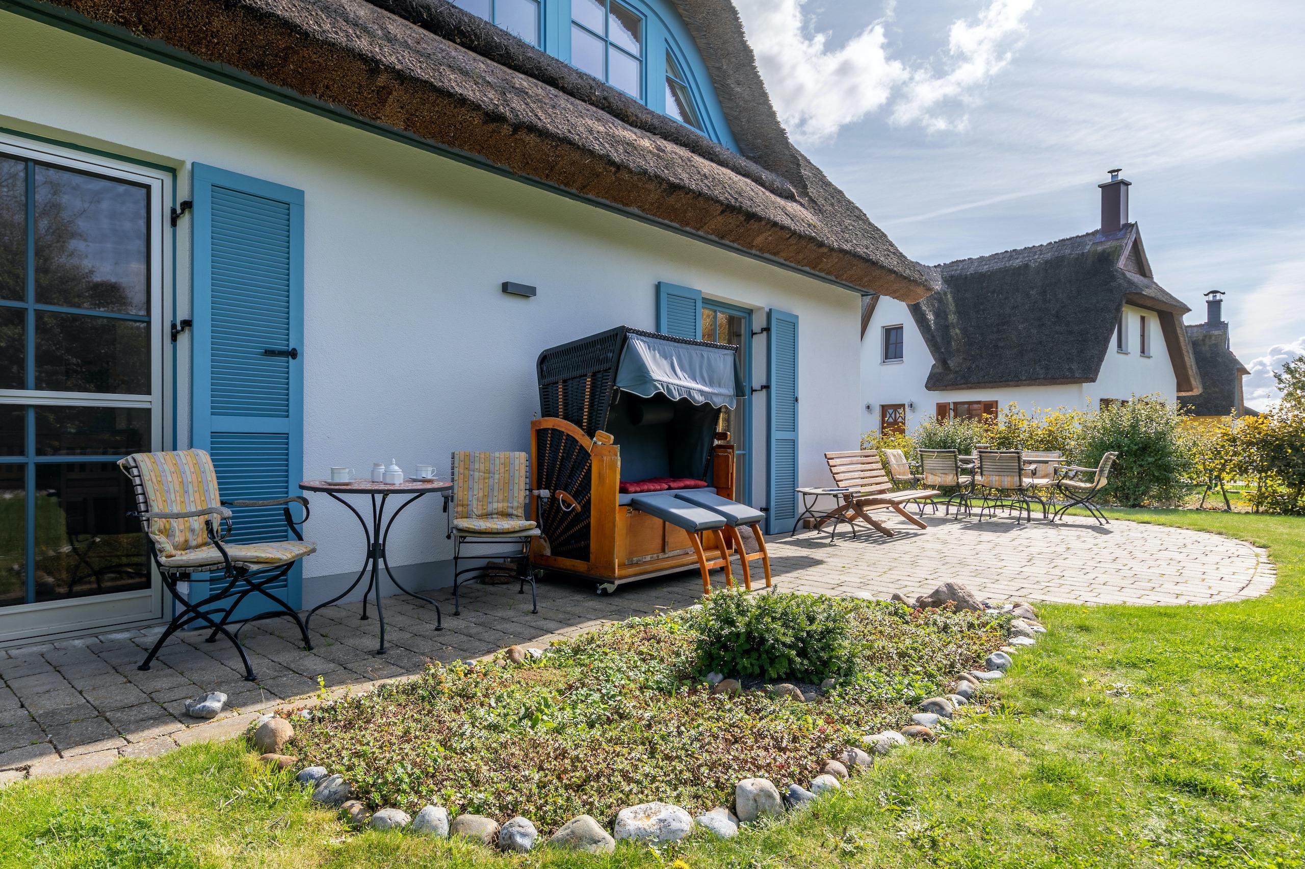 Außenbereich: Der wunderschöne Garten und die 40 Quadratmeter große Terrasse verführen zu endloser Zeit im Freien. Hier können Mahlzeiten mit der Familie eingenommen werden, oder Sie genießen einfach die tolle Umgebung und die Sonnenstrahlen. Für die richtige Entspannung, ganz á la Ostsee, sorgt der echte Strandkorb.