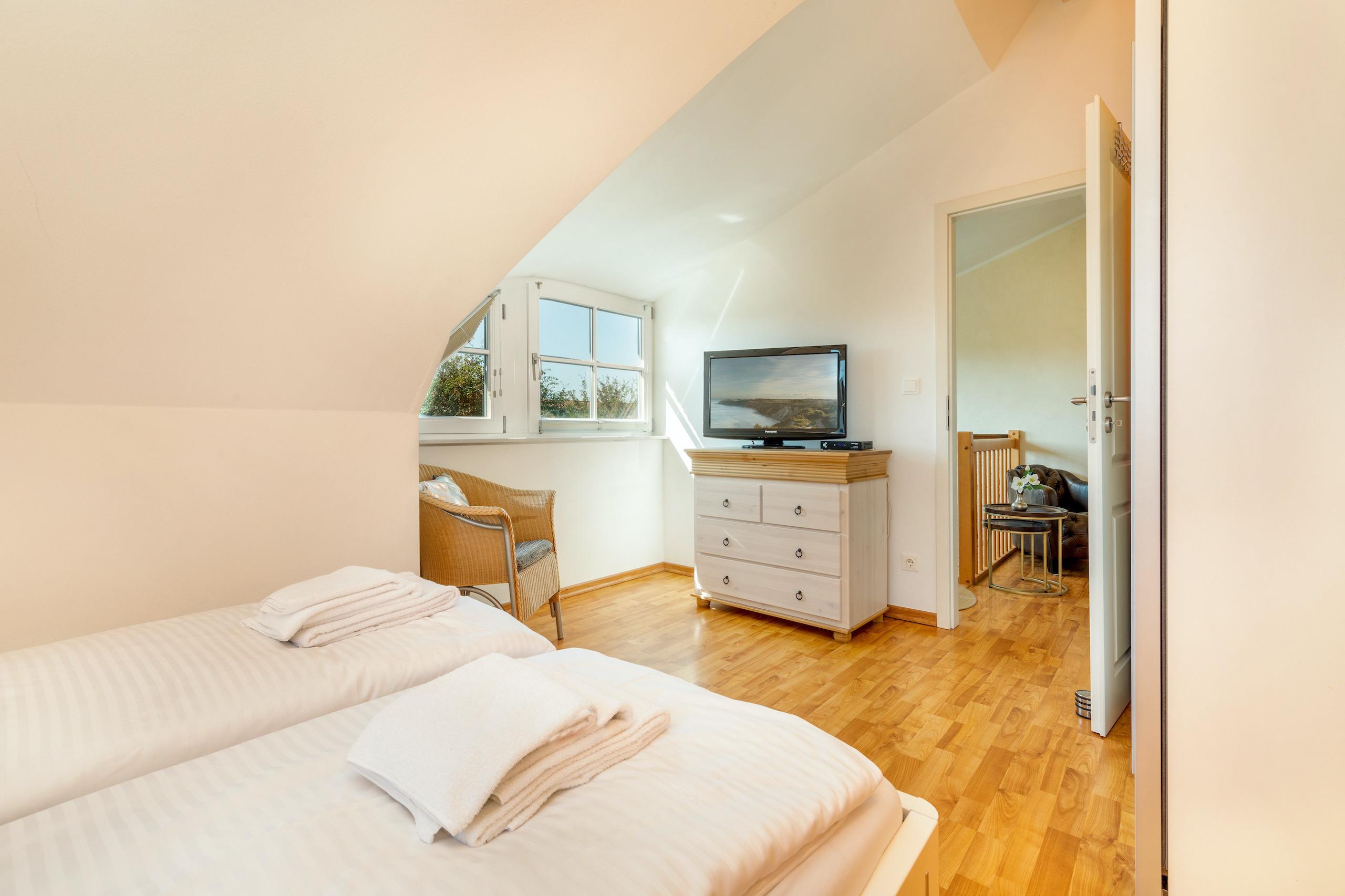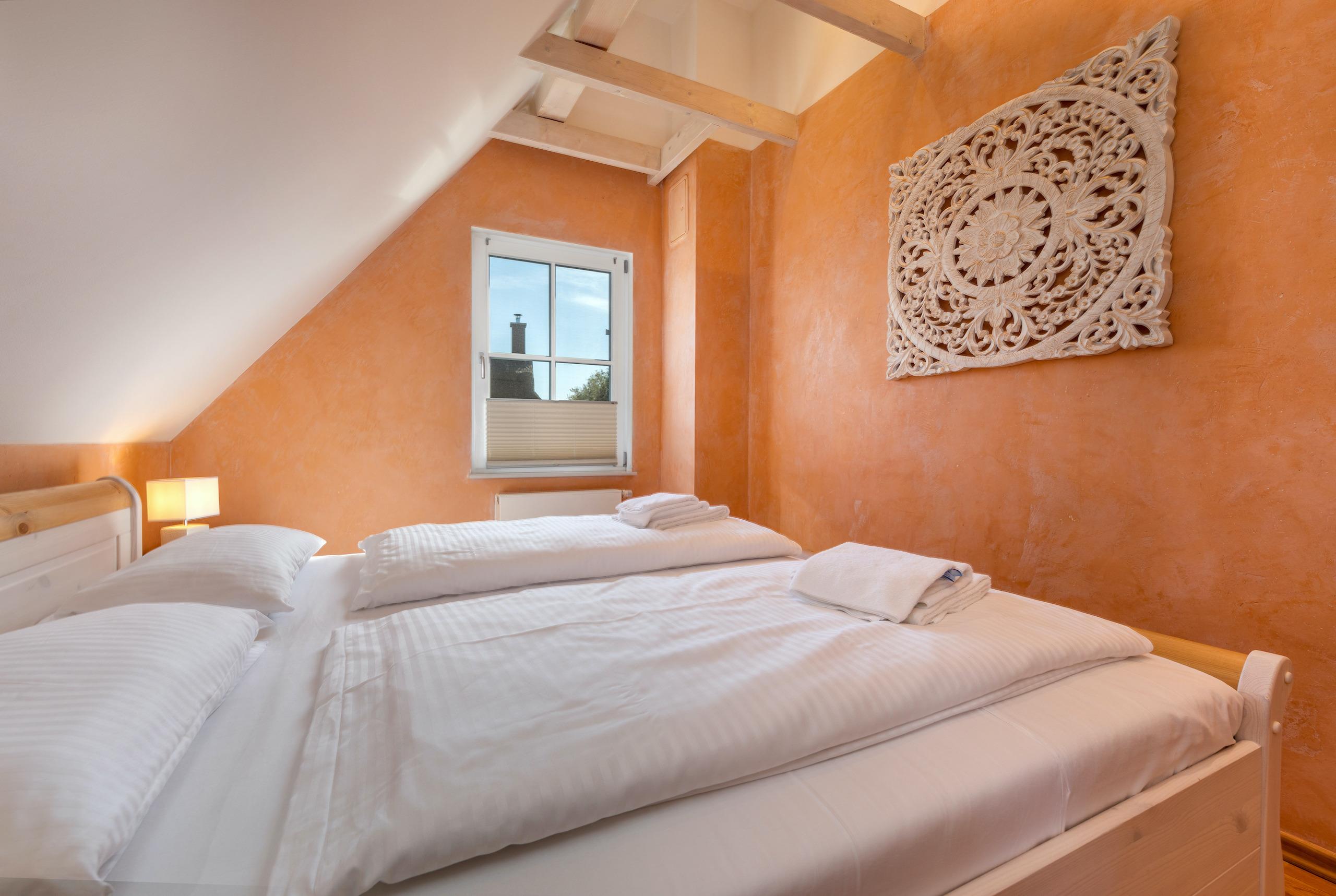 3 Schlafzimmer: Die drei großzügigen Schlafzimmer des Hauses liegen im Obergeschoss unter gemütlichen Dachschrägen. Alle Zimmer sind mit großen Doppelbetten ausgestattet, die einen erholsamen Schlaf garantieren. Die geschmackvoll und zugleich schlichte Einrichtung und die Verwendung natürlicher Materialien (u.a. Volimea Wandbeschichtungen) sorgen für ein gesundes Raumklima, welches zum Träumen einlädt.