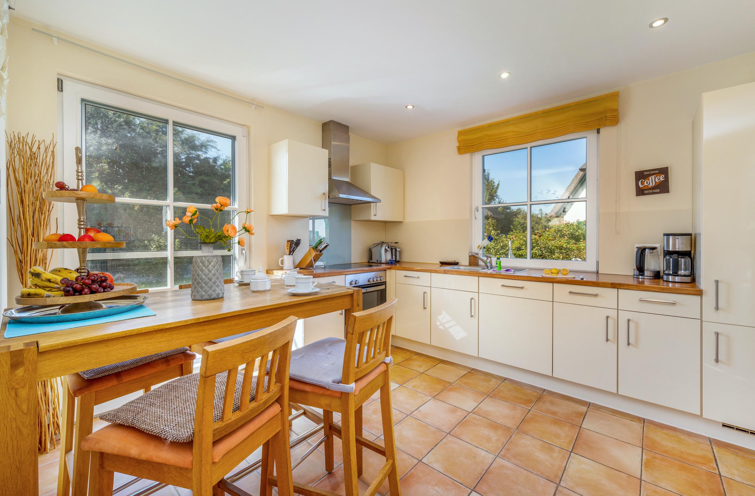 Küche: Die große Küche bietet reichlich Platz für ein gemütliches Familienfrühstück, gemeinsames Kochen und besitzt eine separate Tür zum Garten. Die umfangreiche Ausstattung beinhaltet u.a. einen Kühlschrank inklusive Gefrierfach, 4-Platten-Cerankochfeld, Backofen, Geschirrspüler, Wasserkocher, Kaffeemaschine, zztl. Kaffeepadmaschine sowie Kochutensilien.