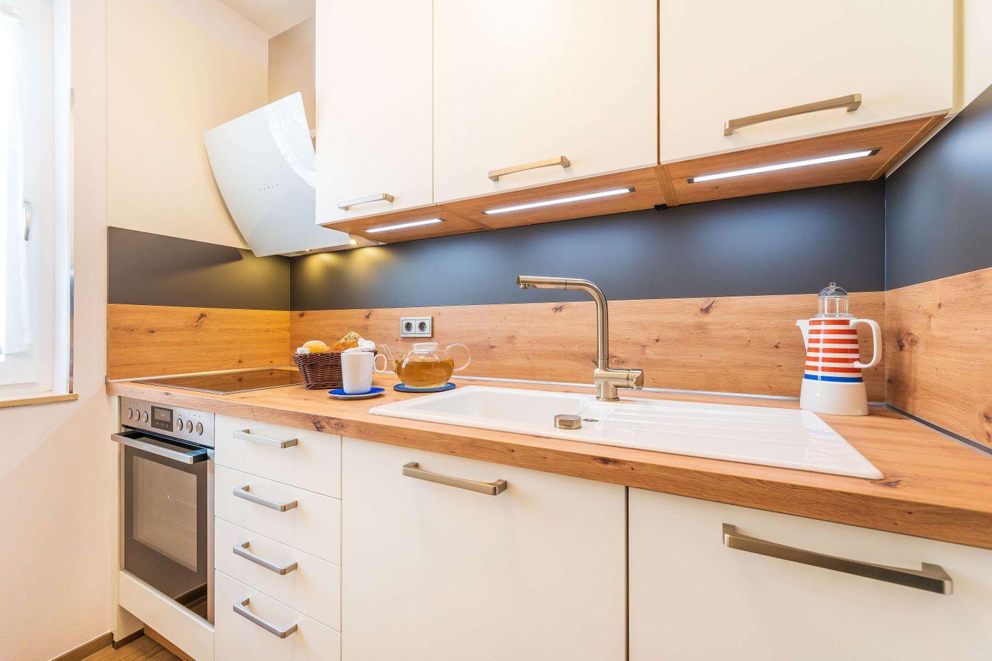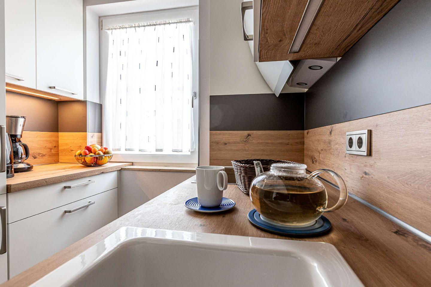KÜCHE // Separate Küche, Induktionsherd, Spülmaschine, Kühlschrank mit Gefrierfach, Backofen, Toaster, Wasserkocher, Kaffeemaschine, Mikrowelle, reichlich Besteck, Geschirr und Küchenutensilien ++