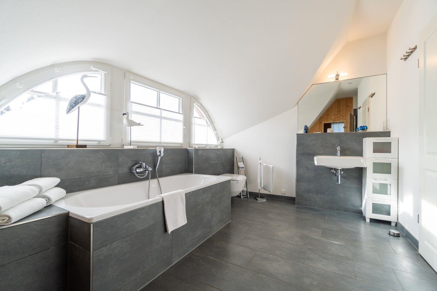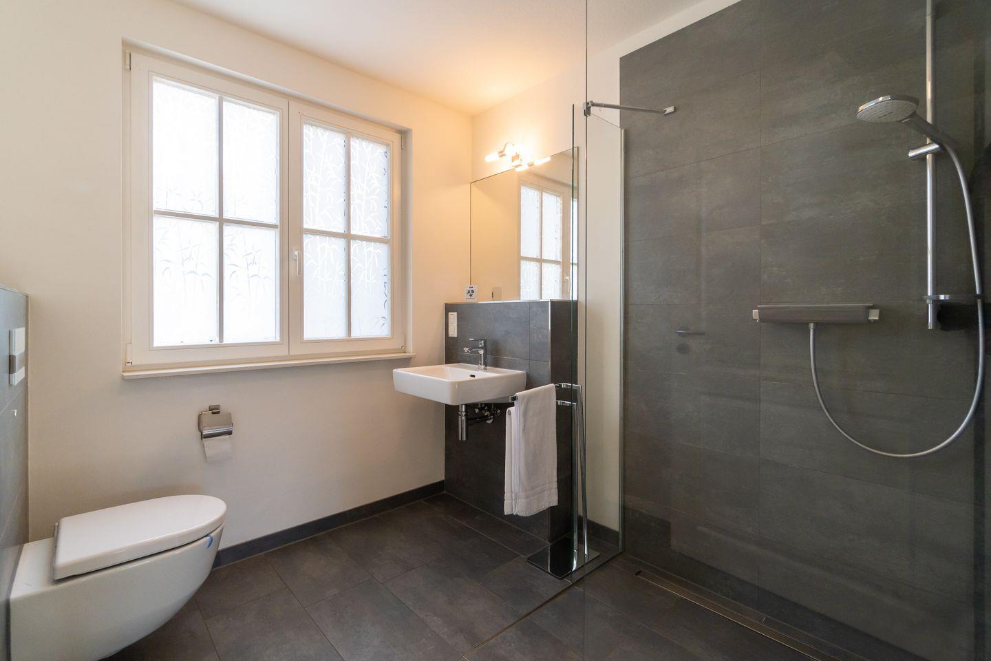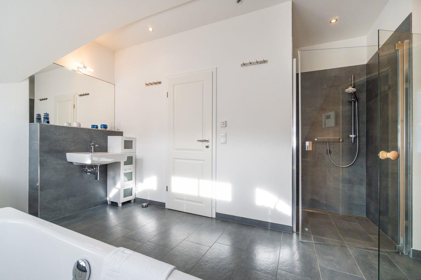 Ein Schlaf- und ein Badezimmer befinden sich im Erdgeschoss, das barrierefrei mit Hilfe einer Auffahrrampe erreicht werden kann. Extra breite Türen und eine ebenerdige Dusche sorgen für Komfort.