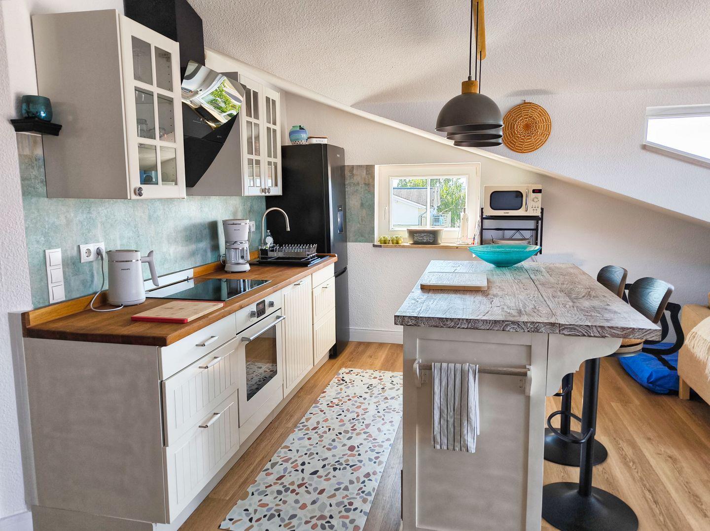 KÜCHE // offene Küche, 4-Platten Ceranfeld, Spülmaschine, Kühlschrank mit Gefrierfach, Backofen, Toaster, Wasserkocher, Kaffeemaschine, reichlich Besteck, Geschirr, Esstisch und Küchenutensilien ++