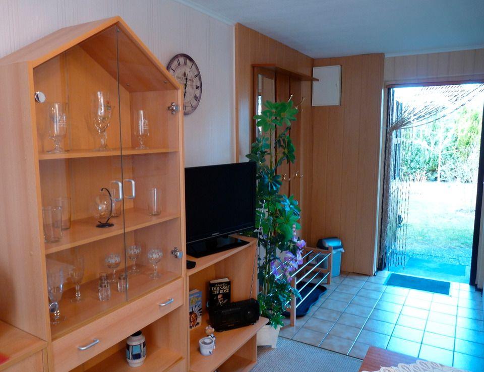 Sie betreten das Haus im Flur mit Garderobe, Spiegel und einem Schuhregal. Der Flur ist offen und geht in das Wohnzimmer über, das mit einer Sitzgruppe aus Couch und Sessel, einem Wohnzimmertisch und einer kleinen Wohnwand mit Fernseher und Radio möbliert ist.