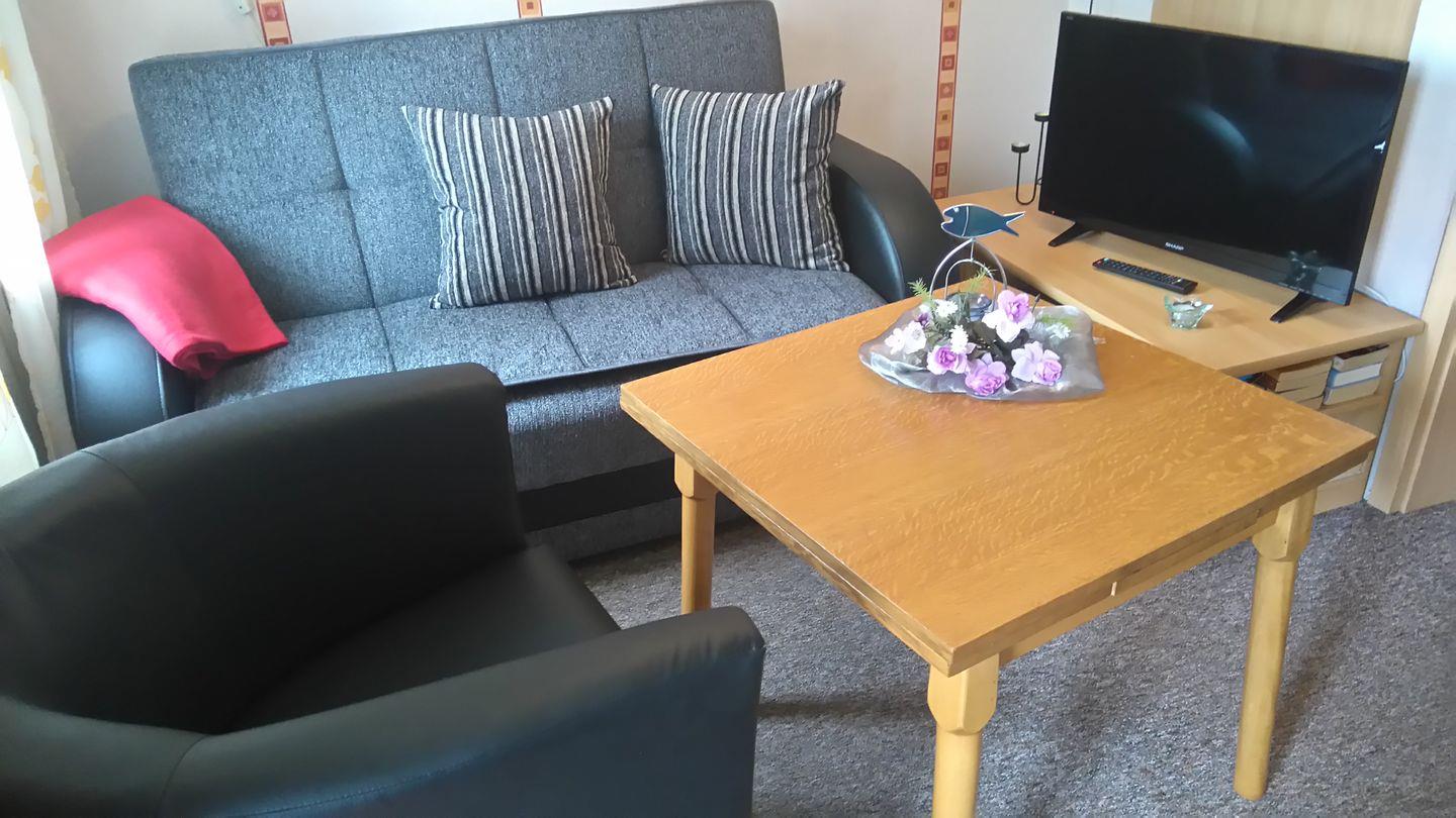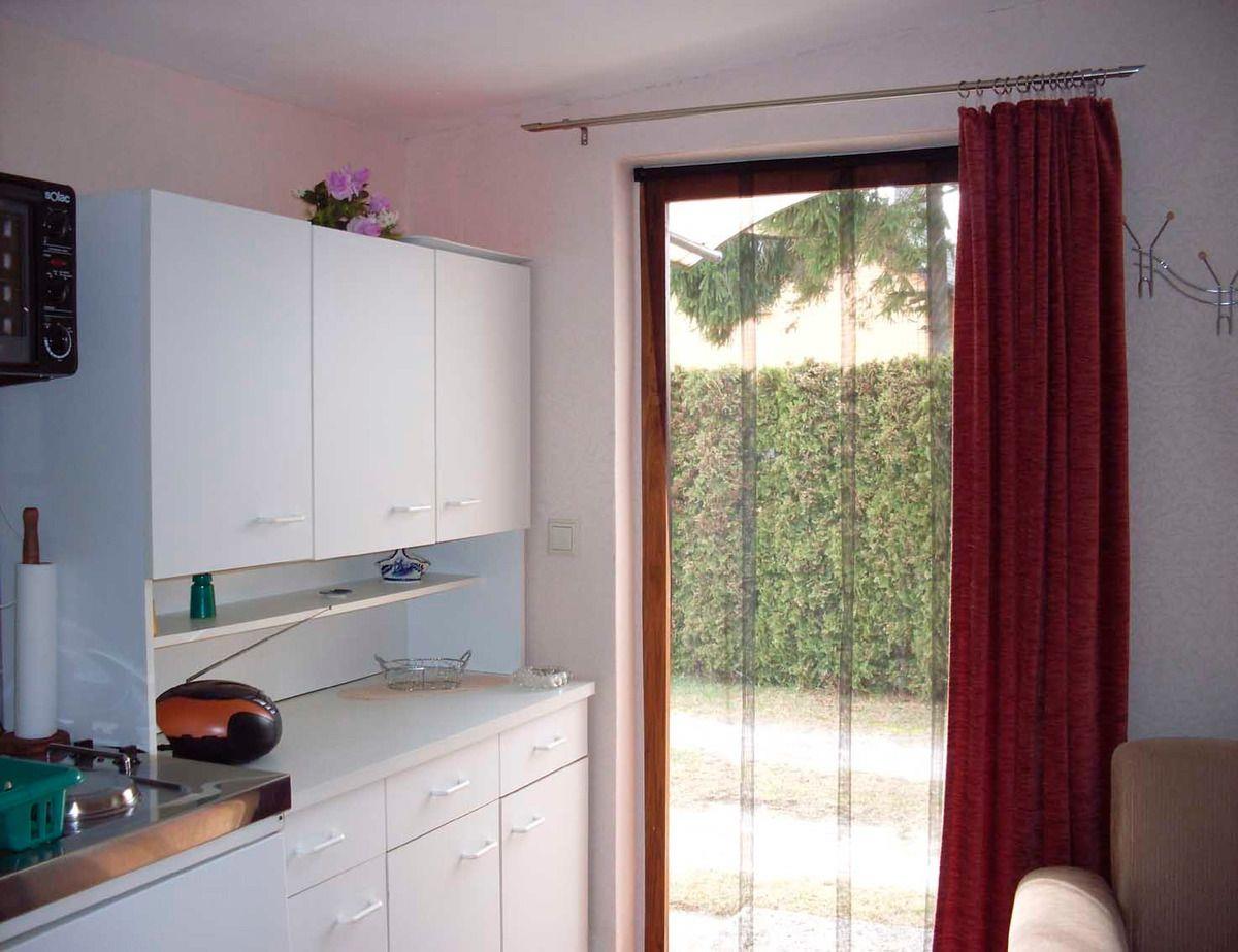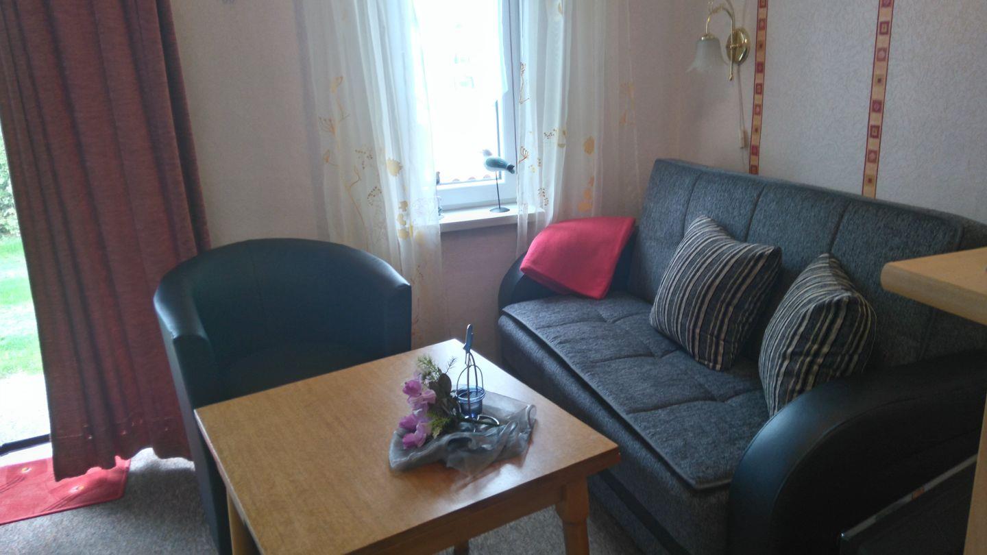 Sie betreten das kleinen 30 m² Ferienhaus gleich im Wohn-und Essbereich. Dieser ist mit einer Couch, einem Sessel, einem kleinen Tisch, einem Regal mit Büchern, Spielen und Informationsmaterial, einem Radio und dem Fernseher eingerichtet. Die offene Küchenzeile besteht aus einem Küchenmodul mit zwei Kochplatten, einer Kaffeemaschine, einem Wasserkocher, einem Toaster, einem Minibackofen mit Grill und einem Kühlschrank mit Tiefkühlfach. Das Schlafzimmer ist mit einem Doppelbett bestehend aus zwei zusammenstehenden Polsterbetten und zwei Kleiderschränken möbliert. Durch das Schlafzimmer gelangen Sie in das Bad mit Dusche und WC. Am Ferienhaus gibt es eine Terrasse mit Gartenmöbel und einem Holzkohlegrill. Hier können Sie beim Frühstück in den Tag starten oder den die Abende beim Wein ausklingen lassen. Für Ihre mitgebrachten Fahrräder gibt es einen Platz zum unterstellen. Ein PKW-Parkplatz ist auf dem Grundstück vorhanden.