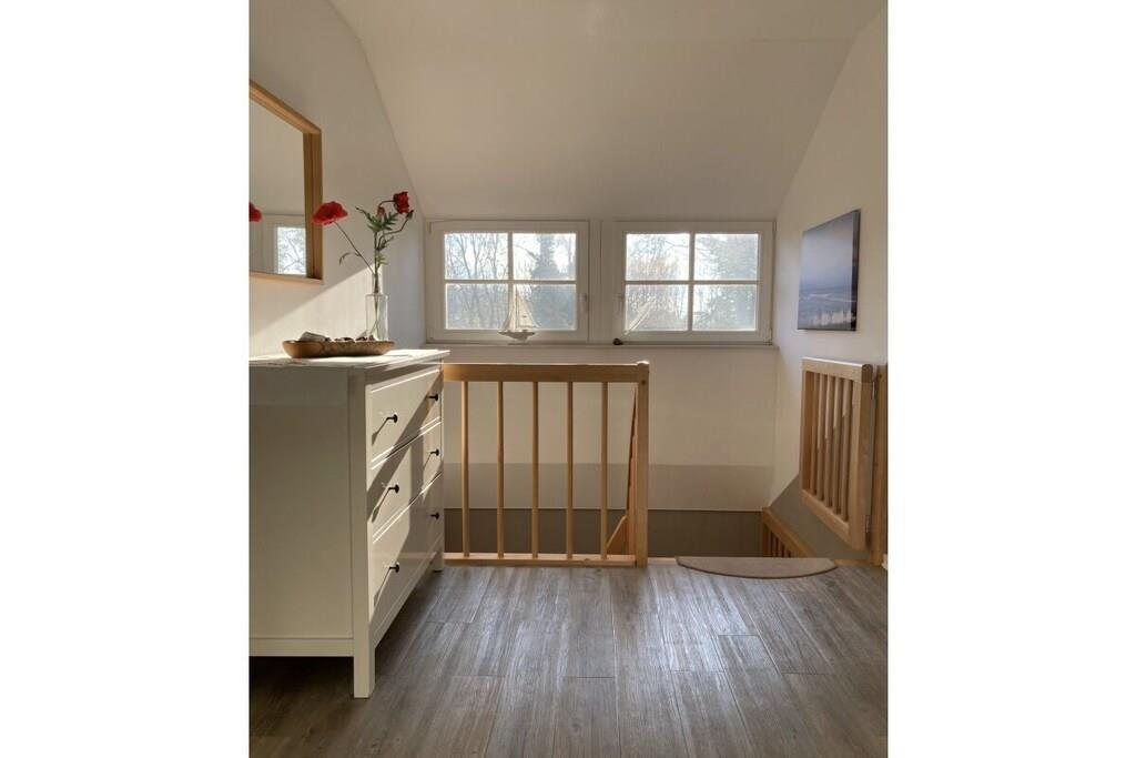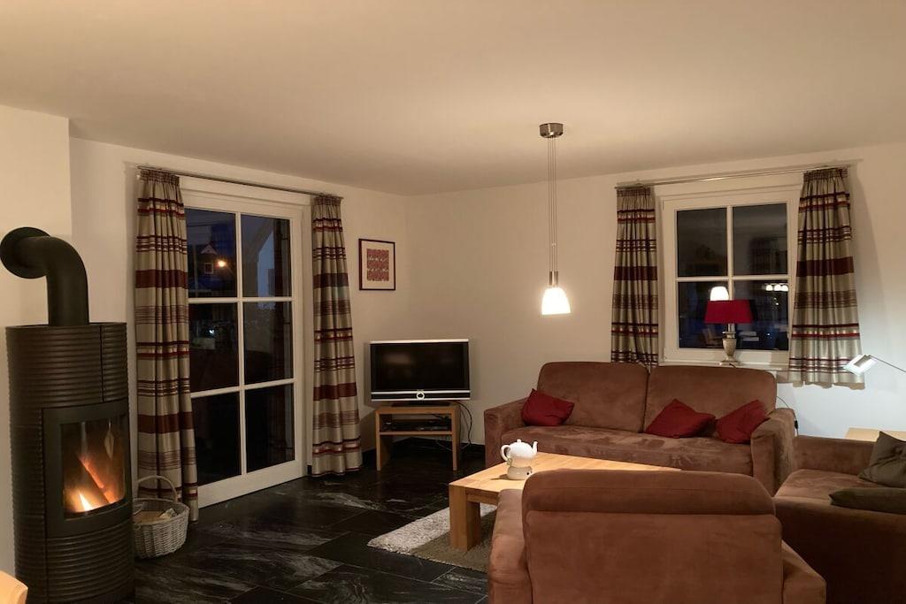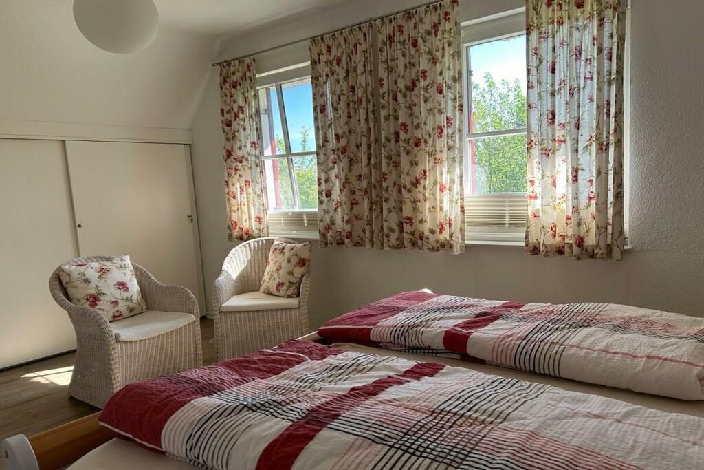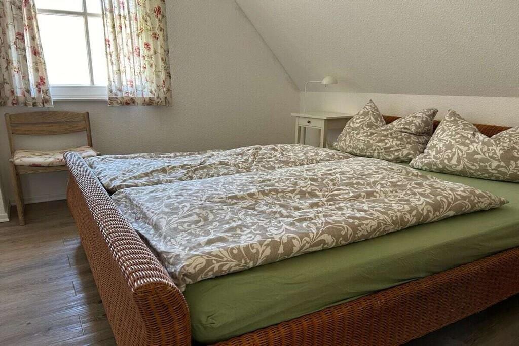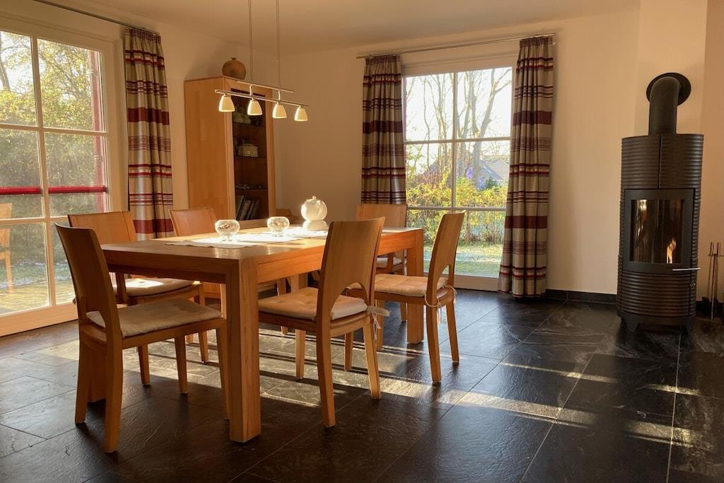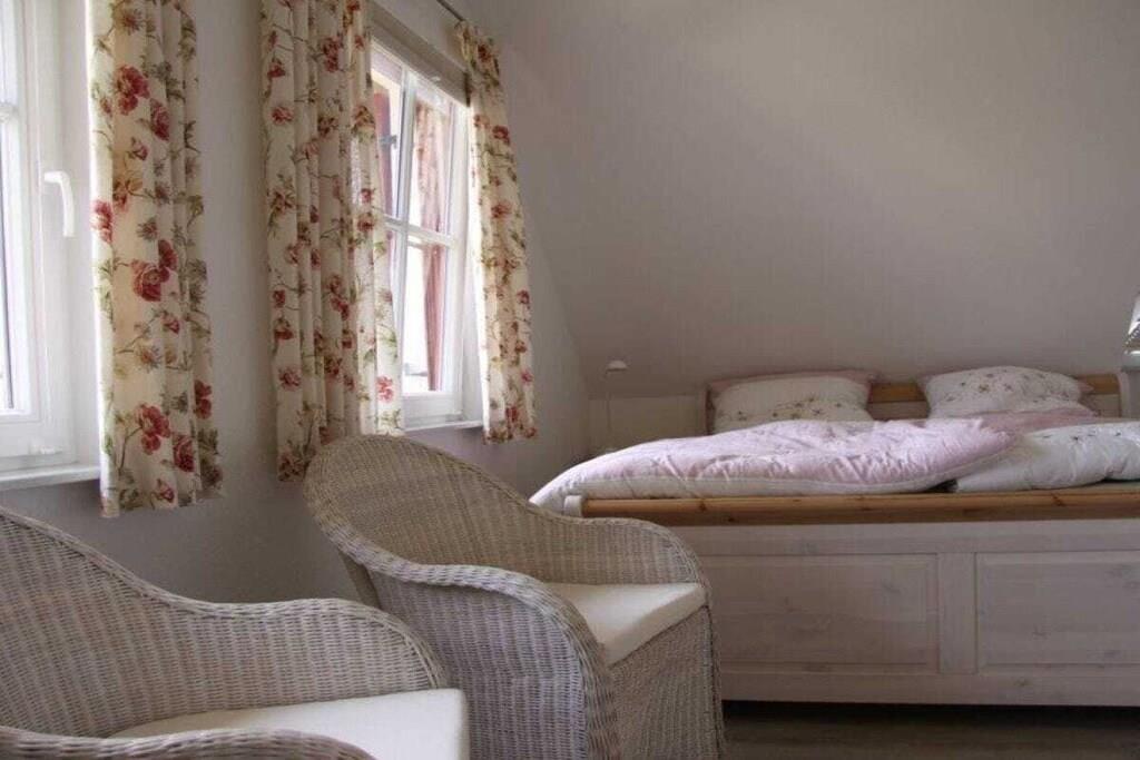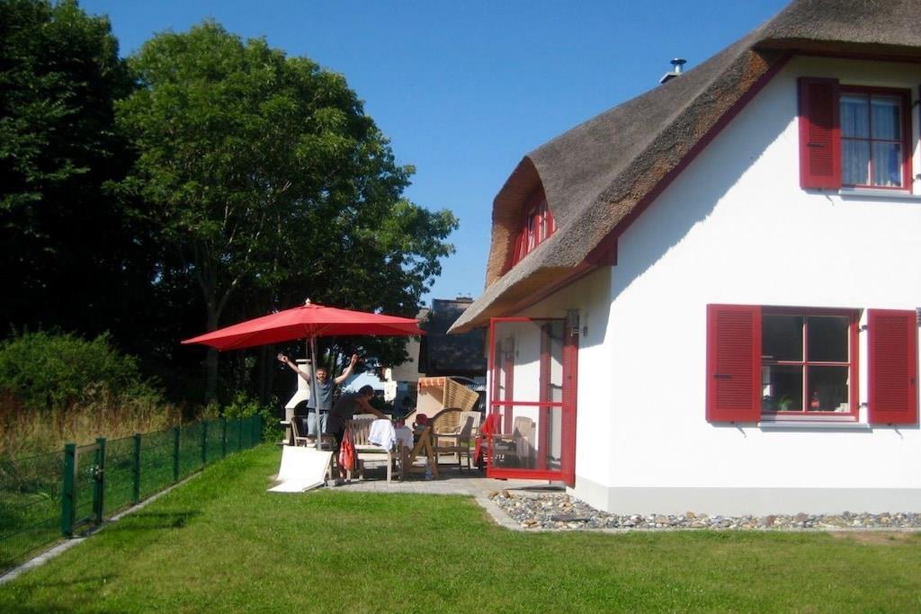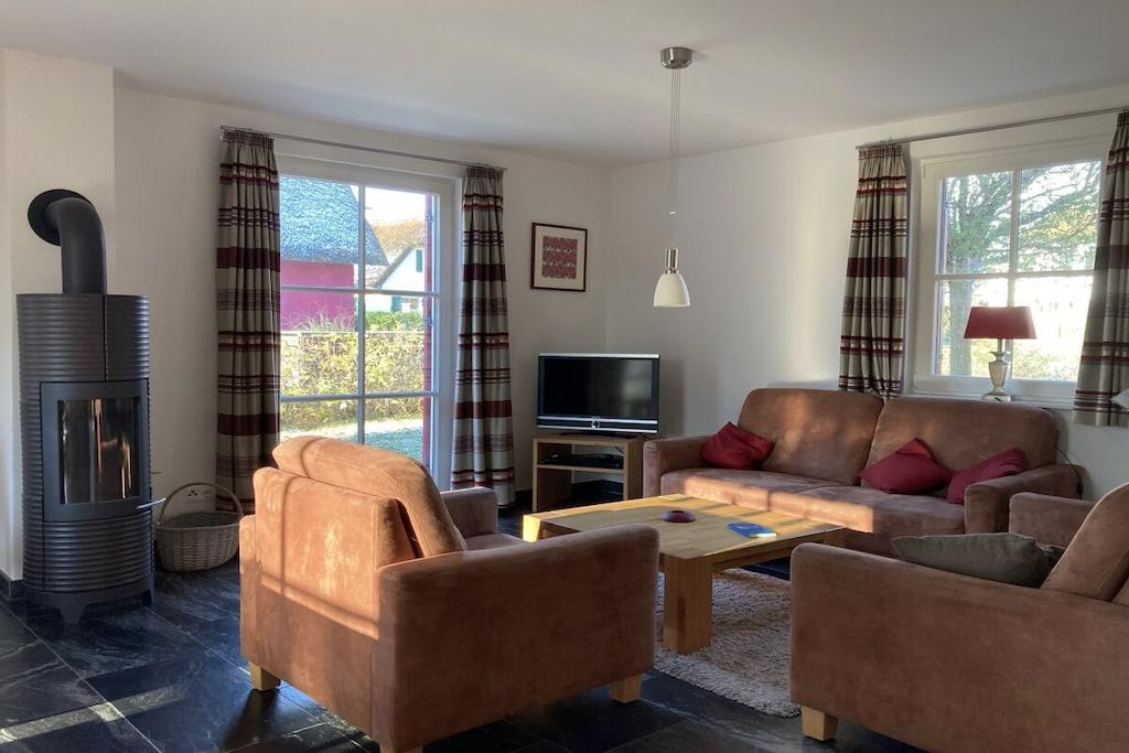 Das gemütliche Reetdachhaus 'Haus Klatschmohn' bietet alles, was das Herz begehrt. Es hat ca. 120 m² und bietet Platz für sechs Personen sowie ein Kleinkind. Der große Garten kann von der Straße nicht eingesehen und durch vier Türen betreten werden. Hier können Sie sich erholen, grillen und viele Sonnenstunden genießen. Das Ferienhaus hat eine Fußbodenheizung sowie einen offenen Kaminofen, den Sie im Wohnbereich finden. Die Sauna lädt zum Entspannen ein. Das Ferienhaus bietet zudem ein Wohn- und Essbereich mit Flachbildfernseher, DVD-Player, Radio/CD-Anlage, Internetanschluss (WLAN) sowie Büchern zum Schmökern und viele Spiele. Die Einbauküche hat ein Induktionskochfeld, eine Spülmaschine, einen Backofen sowie eine Mikrowelle. Im Haus finden Sie zwei Badezimmer, eines mit Dusche und Sauna im Erdgeschoss sowie das zweite mit Eckbadewanne und Dusche im Obergeschoss. Die drei Schlafzimmer haben jeweils ein Doppelbett (ein Schlafzimmer ist zusätzlich mit einem TV ausgestattet). Für die kleinen Gäste bieten wir einen Hochstuhl, ein Kinderreisebett und einen Bollerwagen sowie ein Treppenschutzgitter. Zur Ausstattung gehören ebenfalls ein Föhn, eine Waschmaschine, ein Trockner und ein Bügeleisen sowie Gartenmöbel, ein Strandkorb und ein Grill (der entsprechend der Windrichtung drehbar ist). Für Ihr Auto stehen zwei eigene PKW-Stellplätze zur Verfügung. Die Fahrräder können im Schuppen abgestellt werden. Das Ferienhaus ist ein Nichtraucherhaus und ist komfortabel und gemütlich eingerichtet.