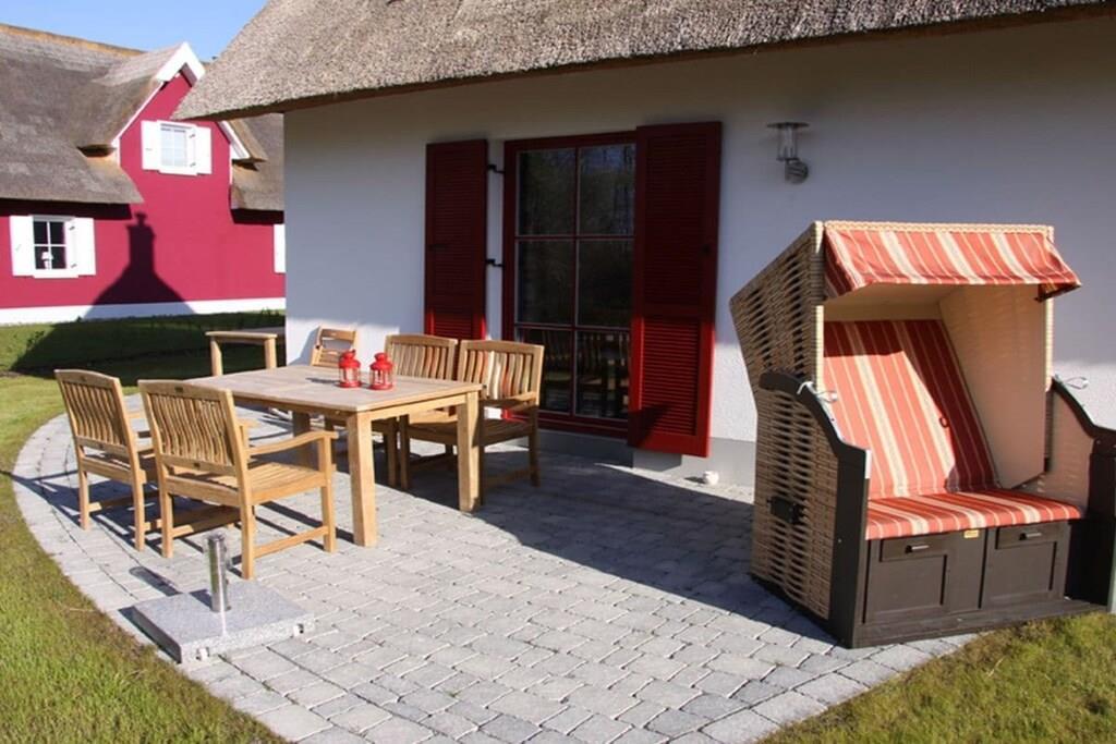 Das gemütliche Reetdachhaus Klatschmohn auf Rügen bietet Sauna, Kamin und großen Garten für erholsame Urlaubstage.