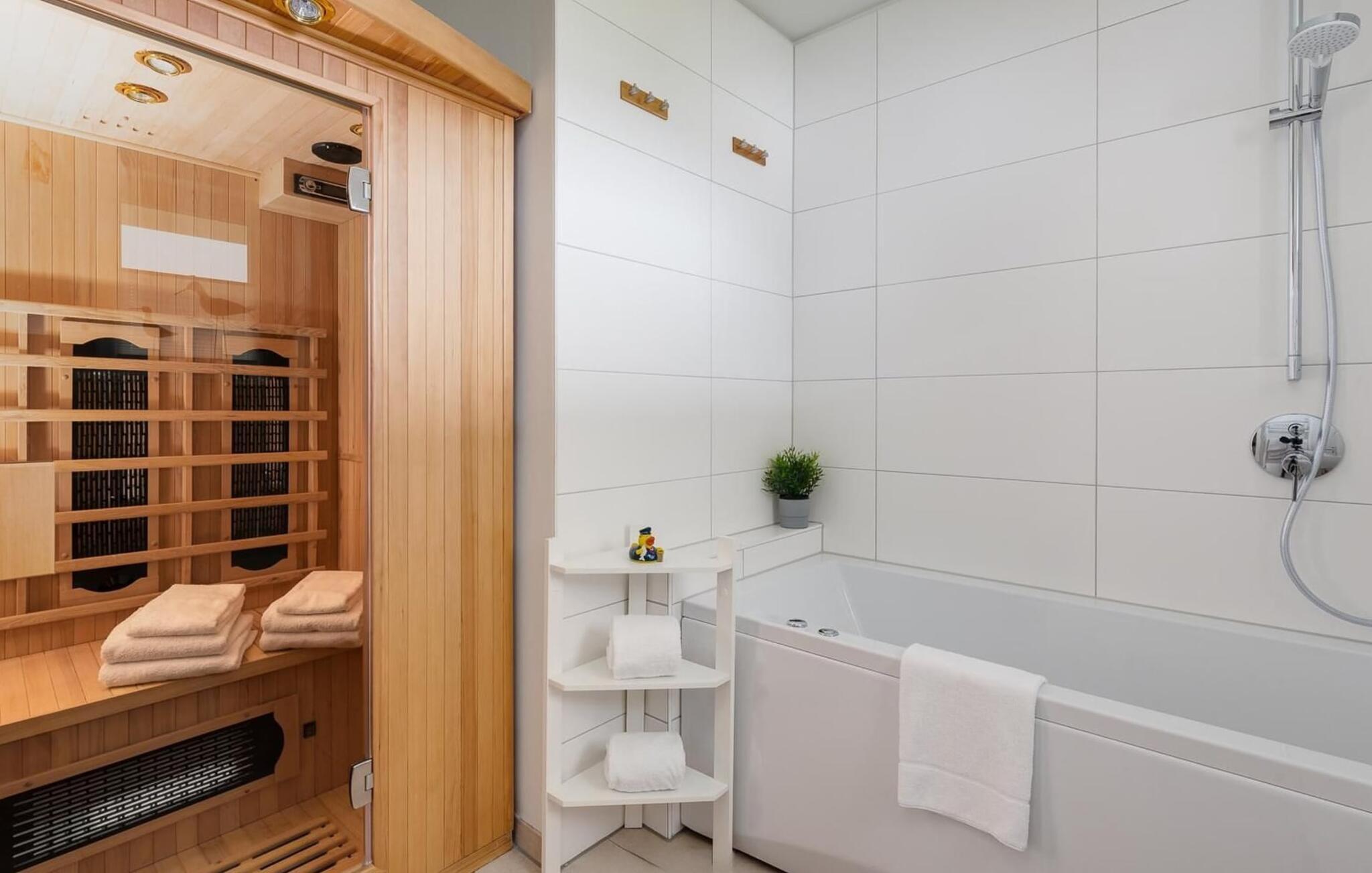 Wellness Liebhaber kommen ganz auf ihre Kosten, ein Infrarot-Wärmekabine mit Hifi-Sound-System und LED-Farblichttherapie sowie eine Relax-Whirlpool-Badewanne laden nach dem Strandspaziergang zum Entspannen ein.