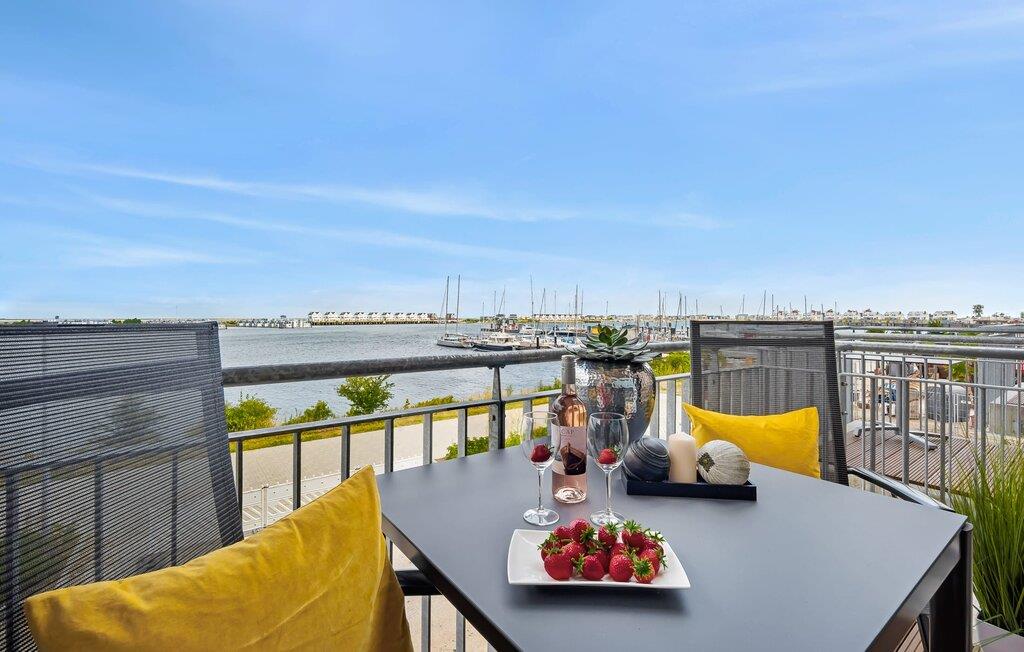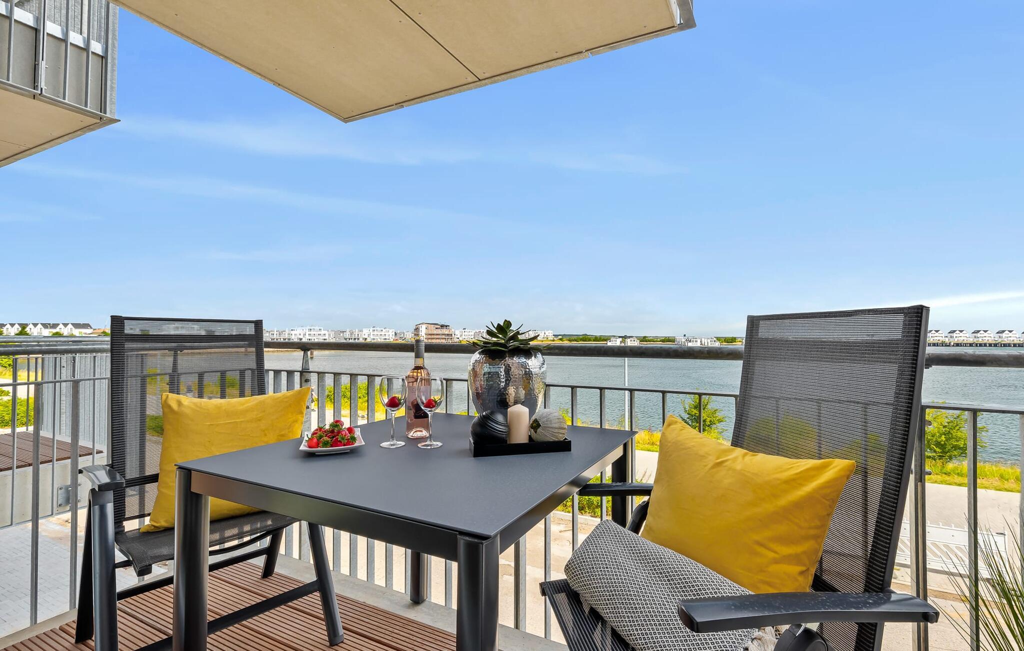Vom Wohnbereich aus geht es direkt raus auf den Balkon. Hier könnt ihr es euch gemütlich machen und das Treiben auf der Promenade und im Hafen beobachten. Der ideale Platz für gemütliche Grillabende und den Sonnenuntergang.