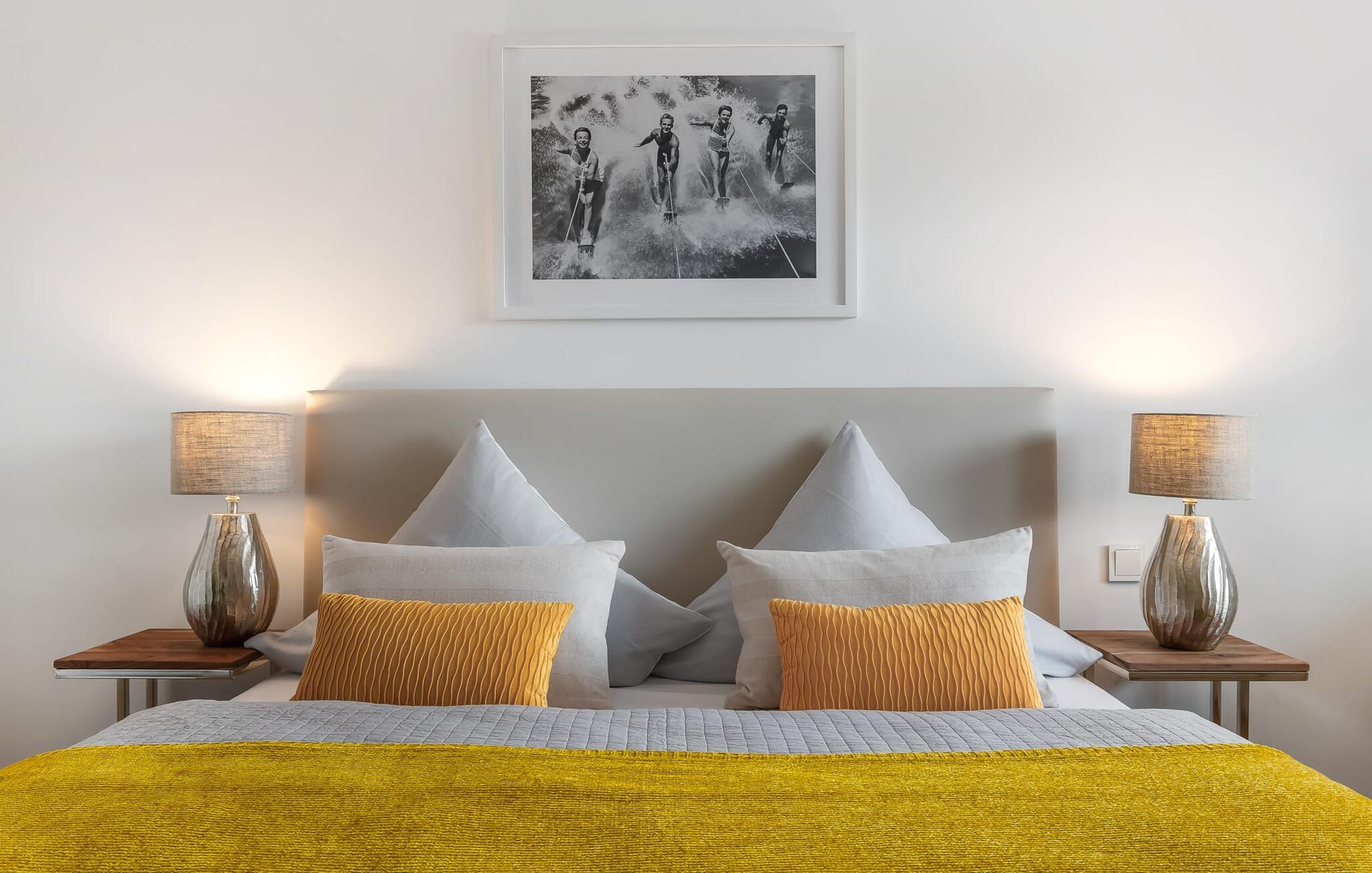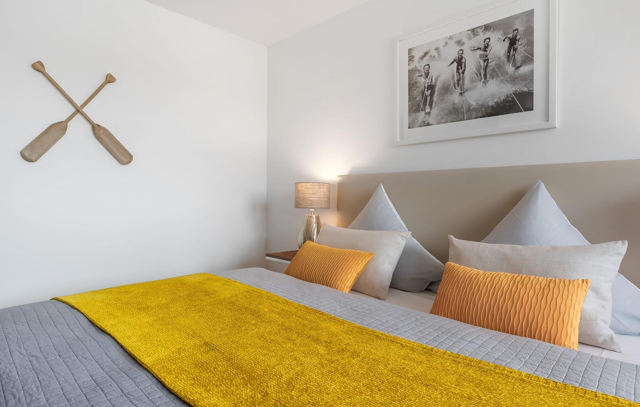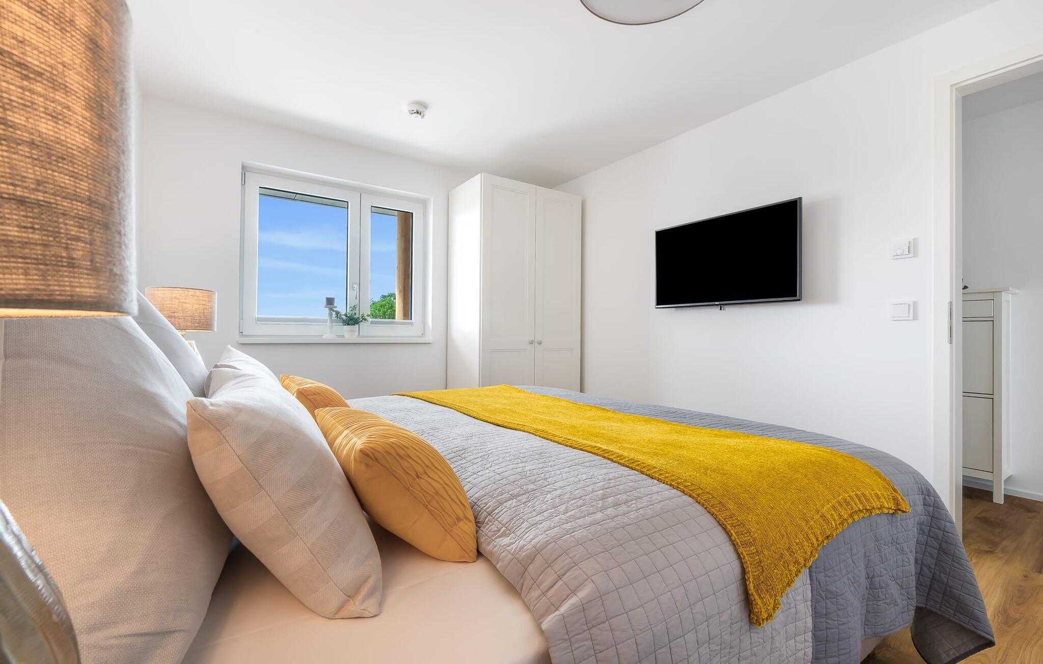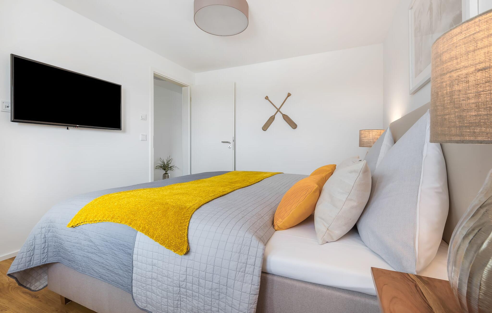 Im Schlafzimmer garantiert ein Doppelboxspringbett für erholsamen Schlaf und ein Fernseher sorgt für alternative Unterhaltung.