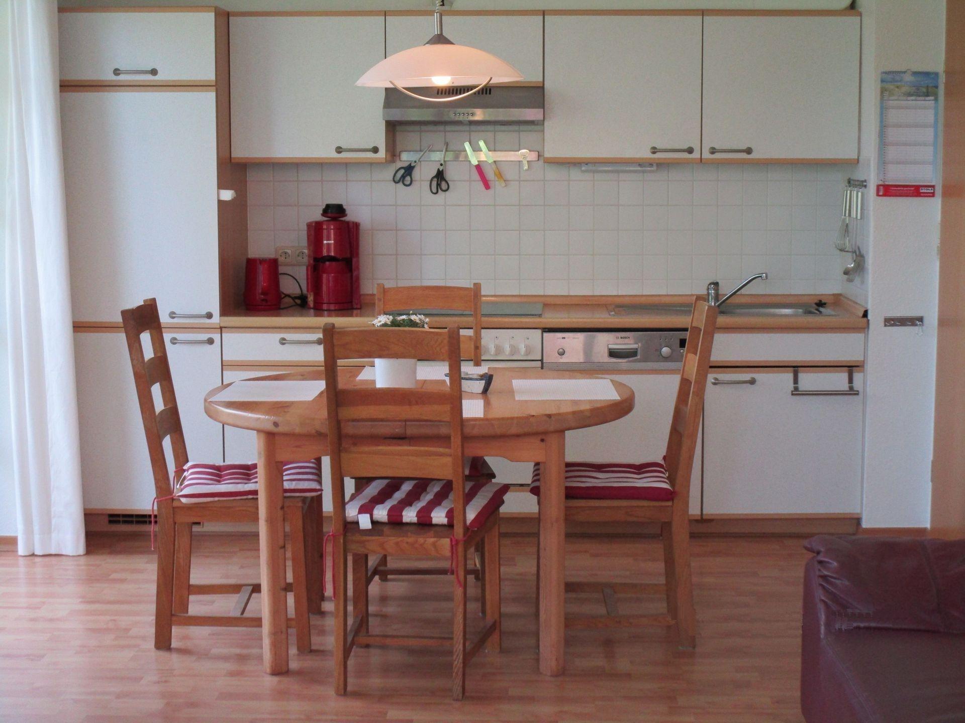Die helle und freundliche Wohnung mit großer Terrasse, die durch eine Hecke geschützt ist, befindet sich im Erdgeschoss. Sie wurde 2019 komplett renoviert und mit hellen Möbeln neu ausgestattet, Gartenmöbel und Liegestühle sind vorhanden. Von einem geräumigen Flur gelangen sie in alle Zimmer. Der Wohnraum mit Küchenzeile und Essbereich hat einen Zugang zur Terrasse. Zwei Schlafzimmer sind vorhanden, eins mit Doppelbett und das andere mit zwei Einzelbetten. Neben dem Duschbad steht den Gästen auch noch ein Abstellraum zur Verfügung.