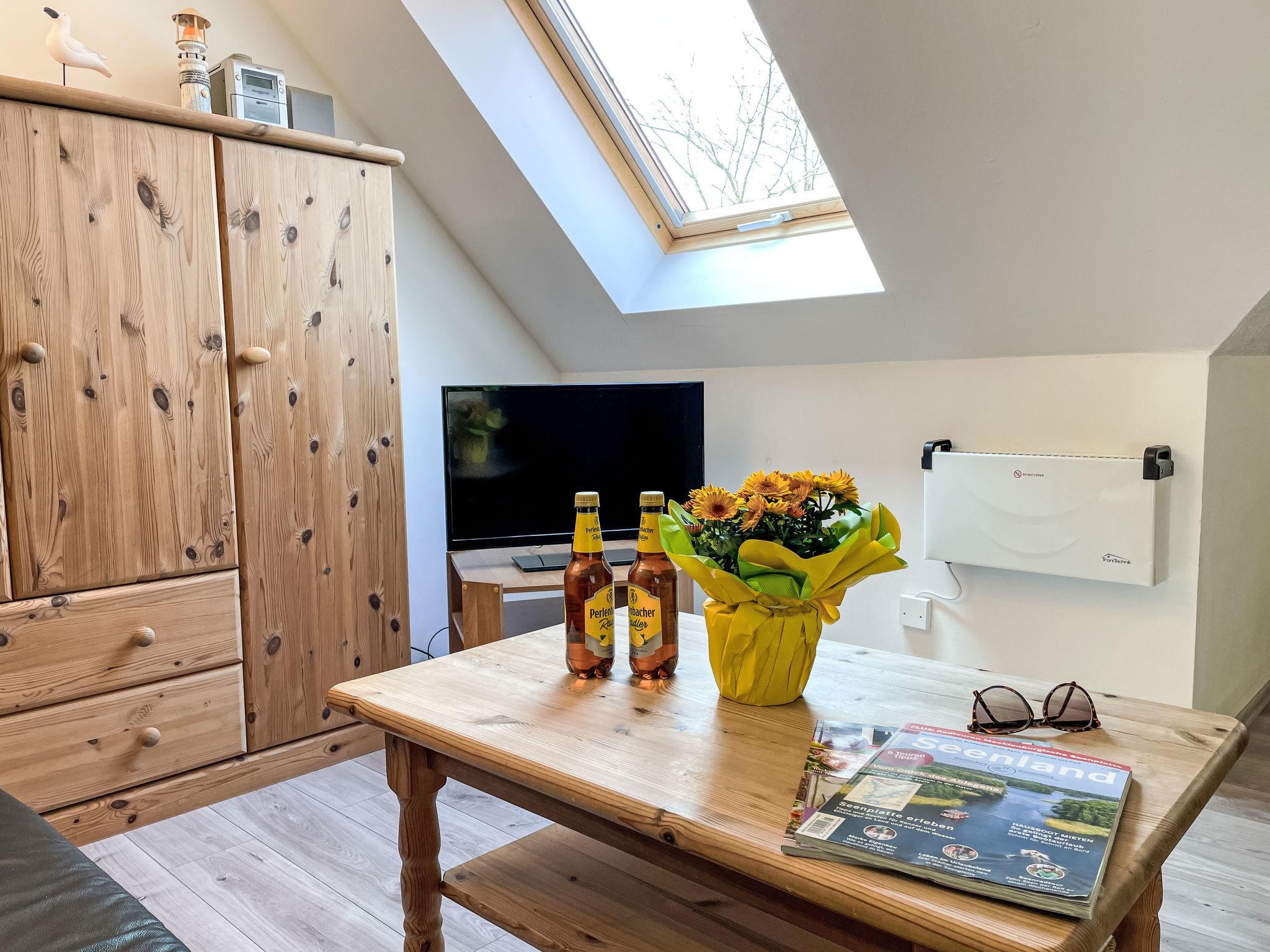 1-Zimmer-Wohnung 24 m2 im 2. Stock. Abgeschrägtes Wohn-/Schlafzimmer mit 1 Doppelbett (180 cm, Länge 200 cm), Sat-TV (Flachbildschirm), DVD. Kochnische (2 Kochplatten, elektrische Kaffeemaschine). Dusche/WC. E-Heizung. Zur Verfügung: Internet (Wireless LAN, gratis). Bitte beachten: Nichtraucher-Unterkunft. Rauchmelder.
