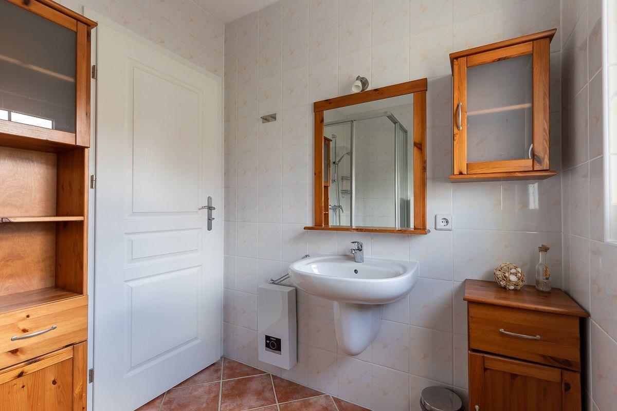 Das Badezimmer mit Dusche, Fenster, Waschtisch, Föhn und WC runden die schöne Ausstattung der Wohnung ab.