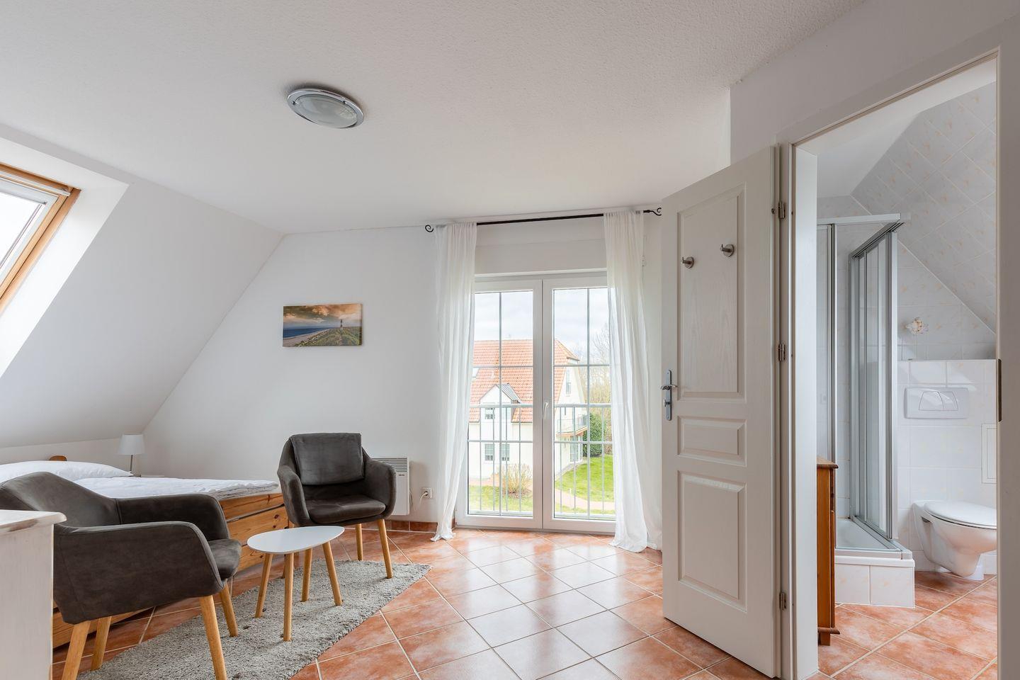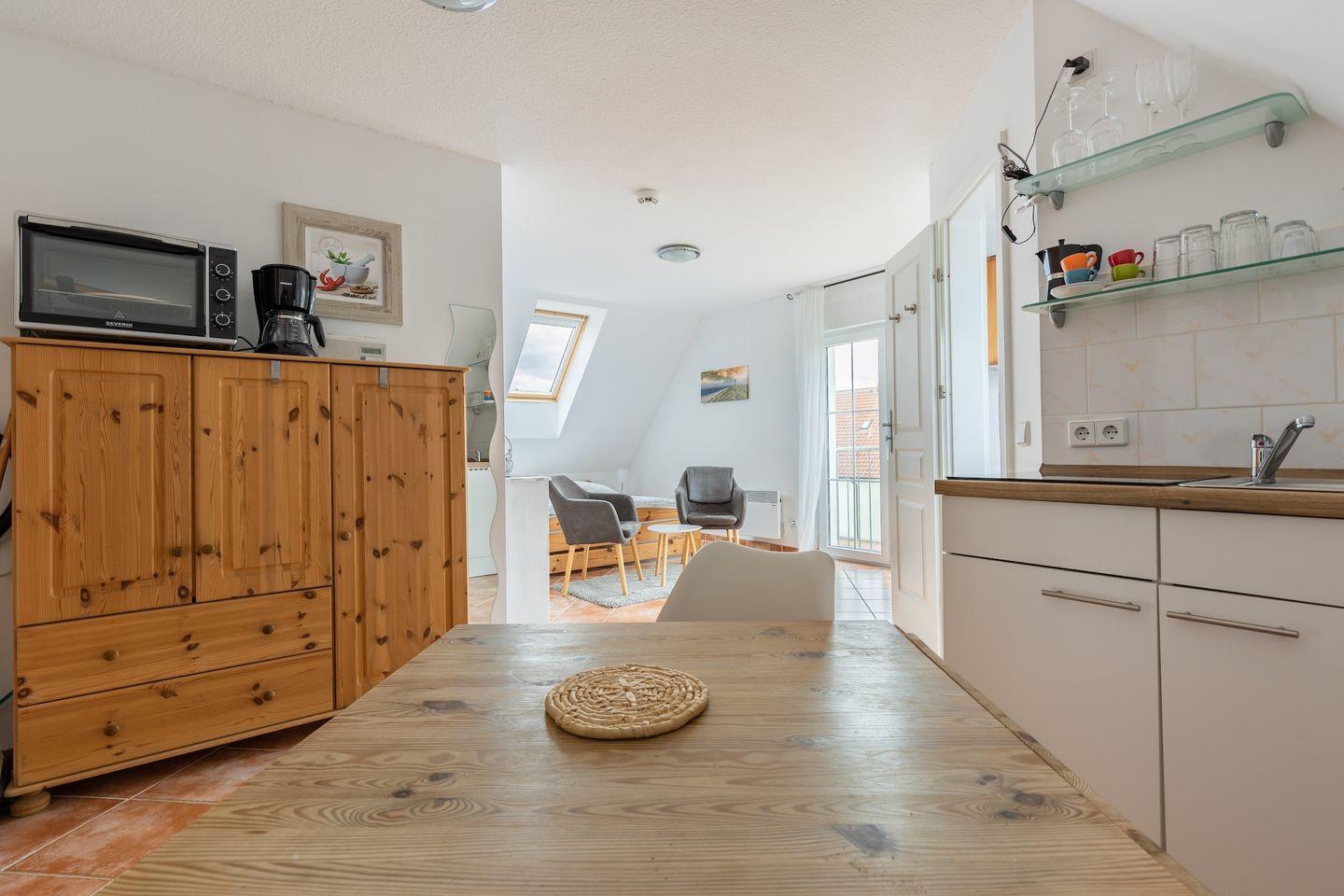 Sie verfügen über einen Essbereich mit kleiner Küchenzeile, die gut ausgestattet ist und einen Esstisch an dem Sie bequem Ihre Mahlzeiten einnehmen können. Weiterhin bietet die Wohnung ein komfortables Doppelbett, einen Sitzbereich und ein TV-Gerät.