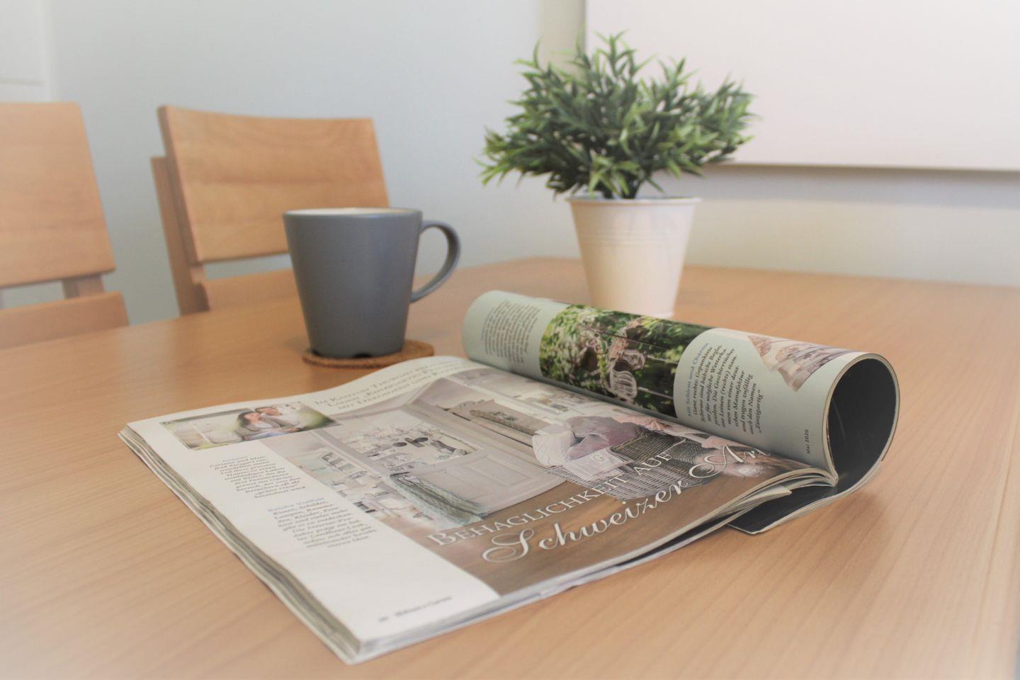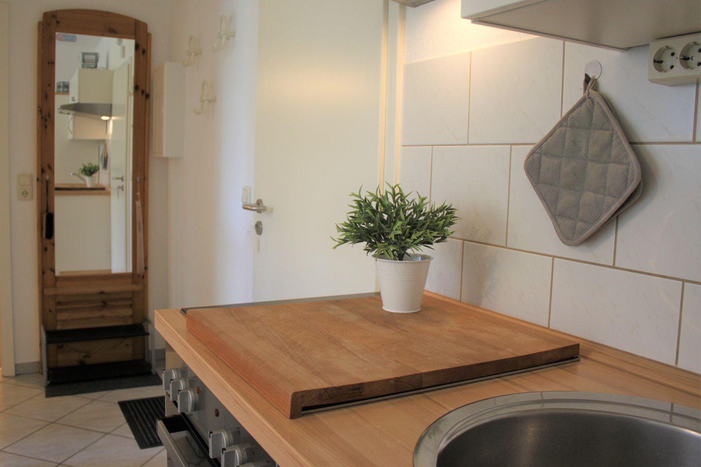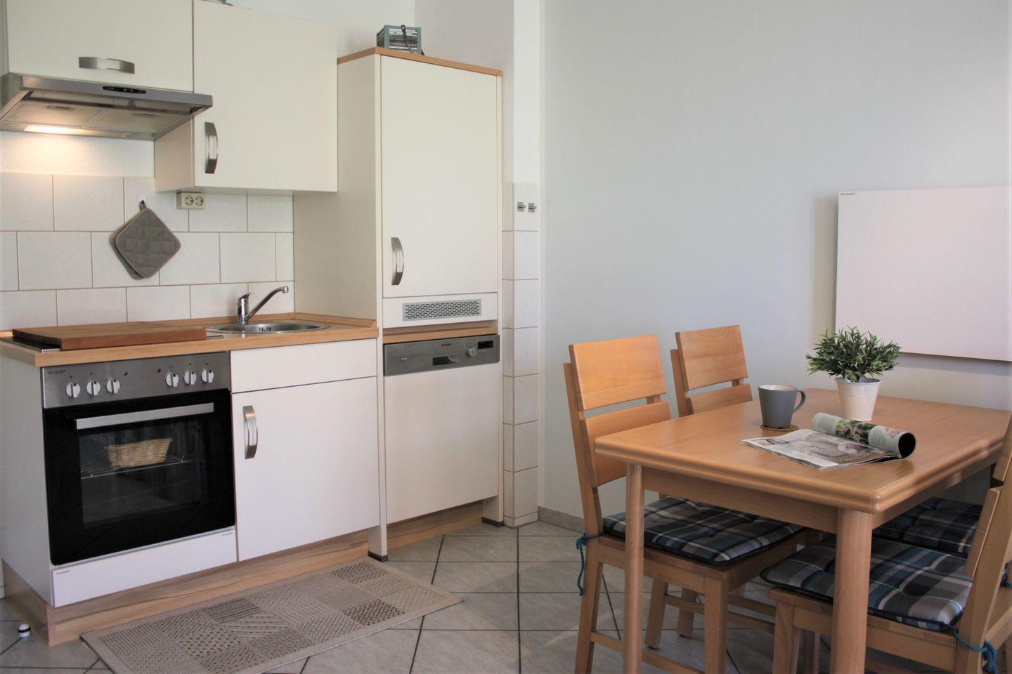 Im Wohnzimmer erwartet Sie eine gemütliche Einrichtung mit Sofa, Lesesessel, TV-Gerät und Esstisch. Die moderne Küche ist ebenfalls im Wohnzimmer integriert und verfügt über alle technischen Geräte, die Sie für eine Selbstversorgung benötigen. Dazu gehören unter anderem ein Herd mit Backofen, eine Geschirrspülmaschine, eine Mikrowelle, Kaffeemaschine, Wasserkocher und Kühlschrank. Genügend Küchenutensilien stehen ebenfalls bereit.