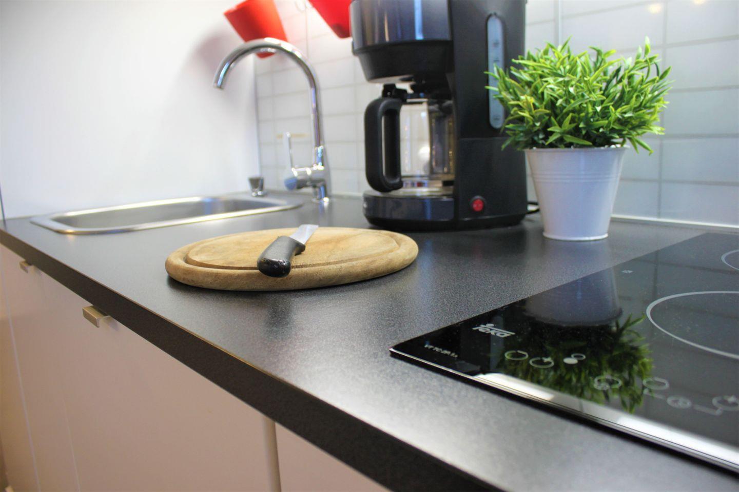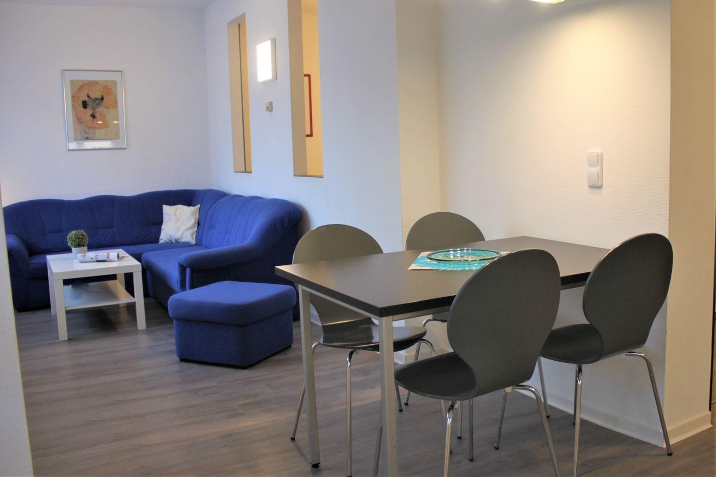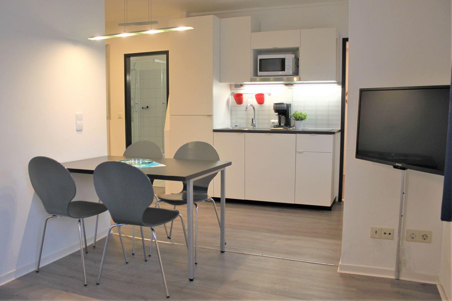 Das in offener Bauweise gestaltete Wohn- und Esszimmer ist mit einem Sofa, TV-Gerät, WLAN und Esstisch mit Stühlen möbliert. Die moderne Küchenzeile ist integriert und gut ausgestattet und verfügt unter anderem über einen Herd (2 Platten Ceran), Kühlschrank, Spülmaschine, Kaffeemaschine, Wasserkocher, Toaster und diversen weiteren Küchenutensilien.