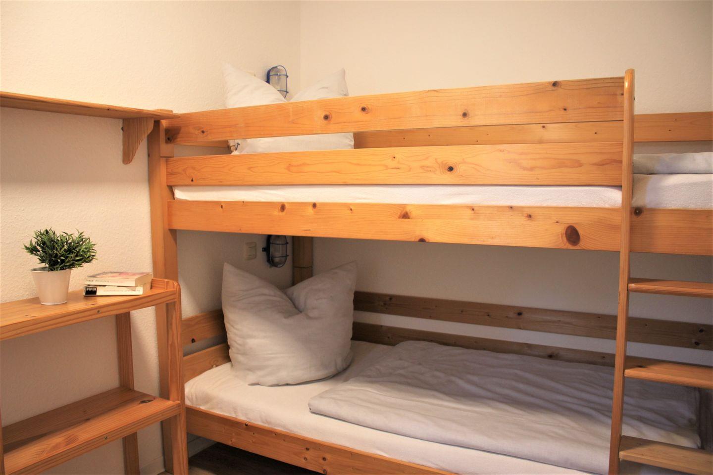 Die Wohnung bietet weiterhin zwei separate Schlafzimmer, die entweder mit einem Doppelbett oder einem Etagenbett ausgestattet sind. Das Badezimmer ist innenliegend und mit einer Dusche, Waschtisch und WC ausgestattet.
