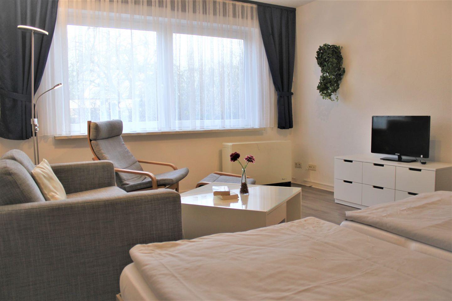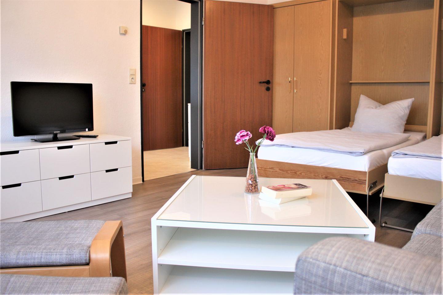 In diesem 1-Zimmer-Appartement können bis zu 2 Erwachsene und ein Kind einen schönen Urlaub verbringen. Ihnen stehen im separaten Wohnzimmer eine gemütliche Sofaecke mit TV-Gerät, WLAN, und zwei Einzelbetten (Schrankbetten) zur Verfügung. Der offen gestaltete Küchen-/Flurbereich bietet einen Esstisch und eine gut ausgestattete, integrierte Küchenzeile und bei Bedarf ein weiteren Schlafplatz (Einzelbett als Schrankbett).
