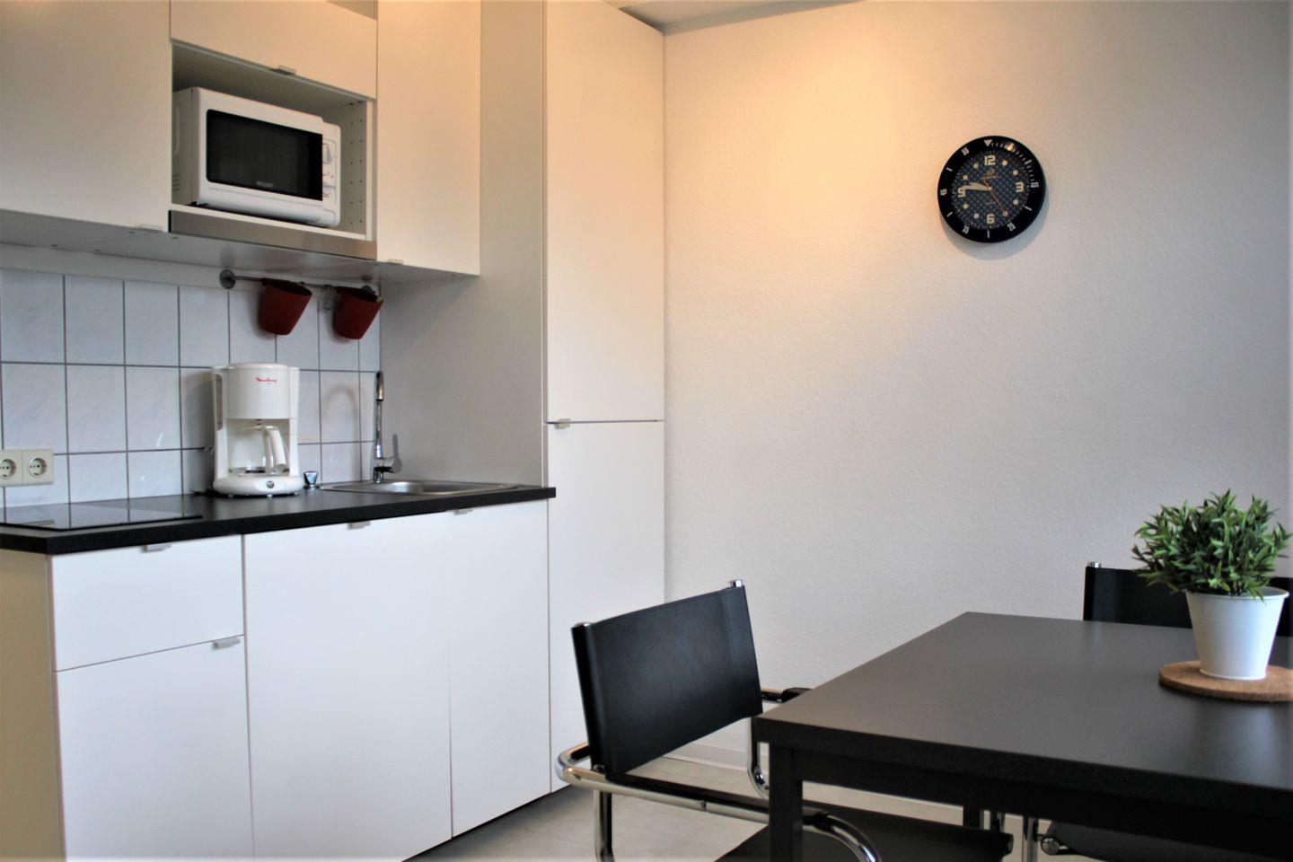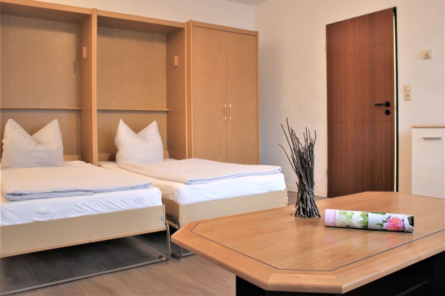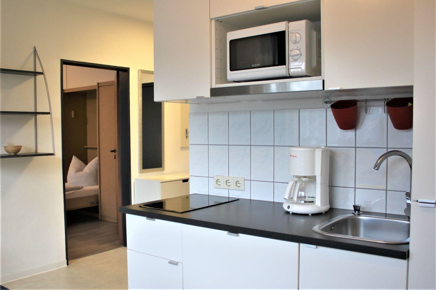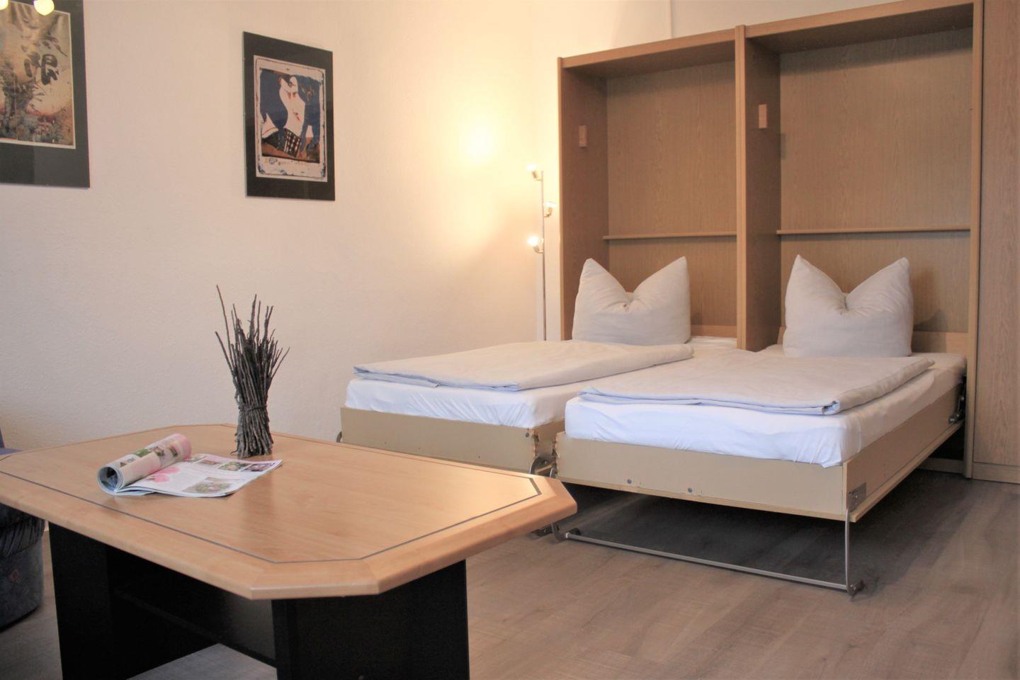 In diesem 1-Zimmer-Appartement können bis zu 2 Erwachsene einen schönen Urlaub verbringen. Das separate Wohnzimmer ist mit einer gemütlichen Sofaecke, TV-Gerät, WLAN und zwei Einzelbetten (Schrankbetten) möbliert. Im angrenzenden offen gestalteten Küchenbereich stehen Ihnen ein Esstisch und eine gut ausgestattete, integrierte Küchenzeile zur Verfügung.