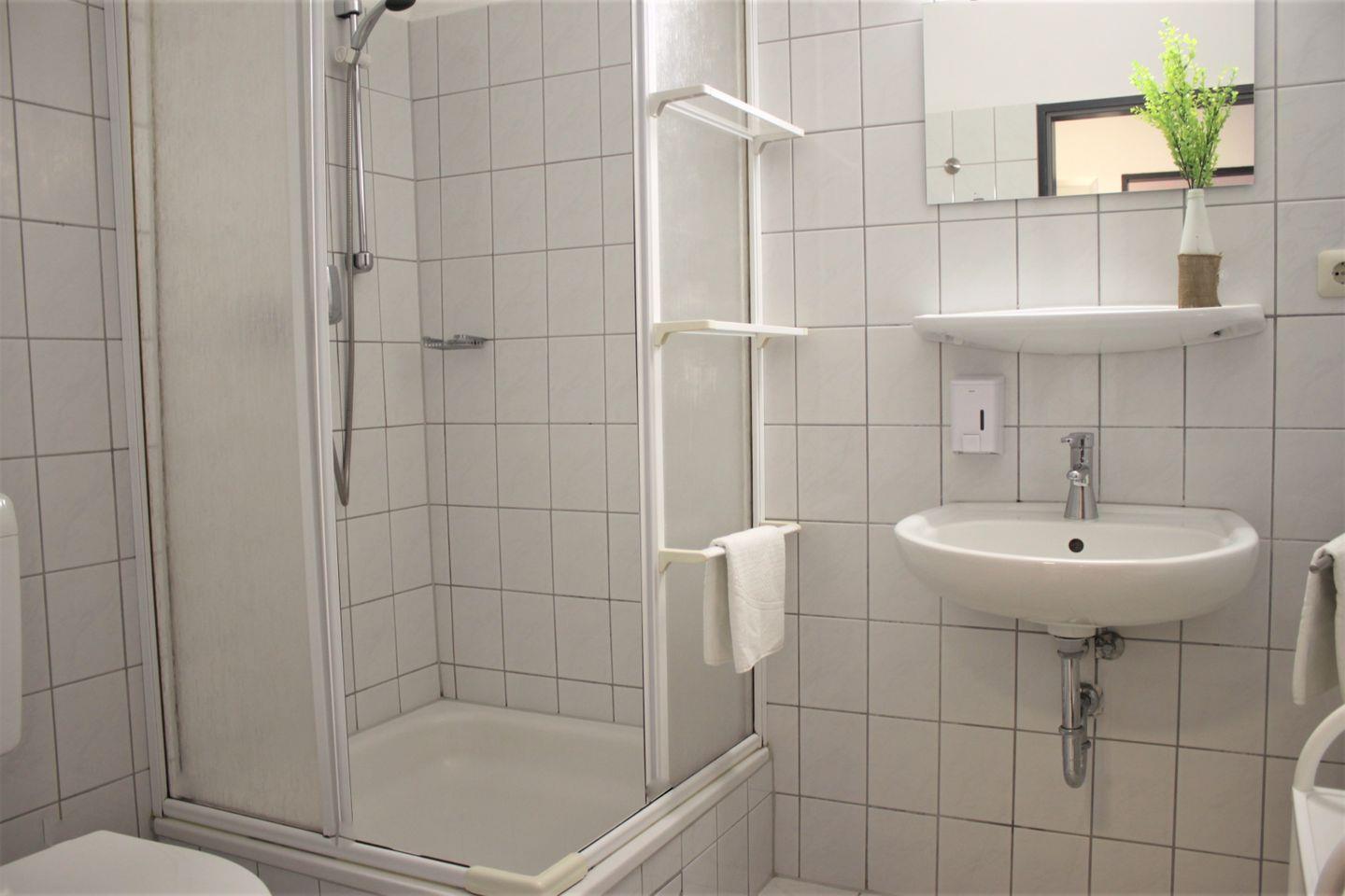 Das Badezimmer ist innenliegend und bietet eine Dusche, Waschtisch und WC.