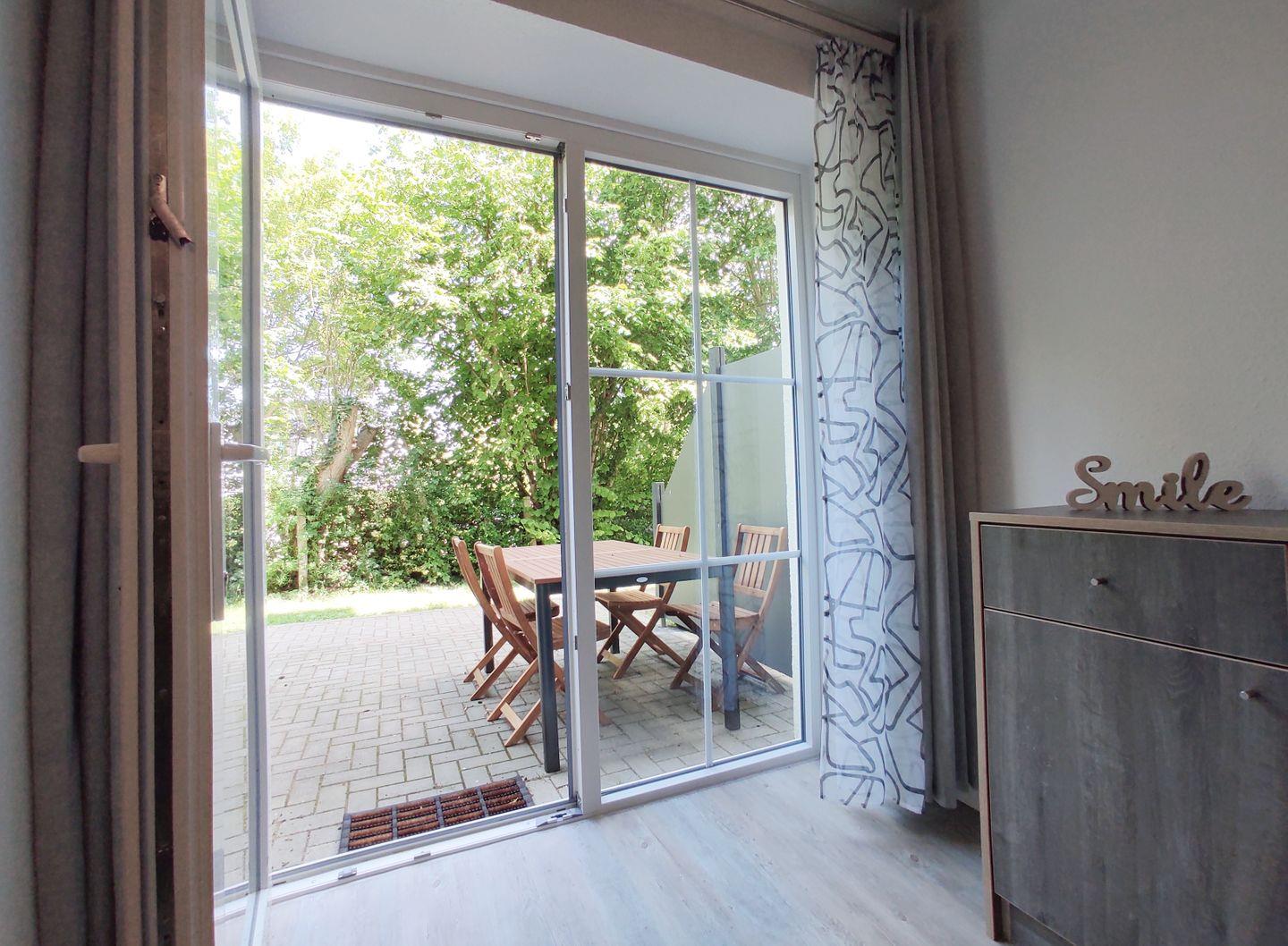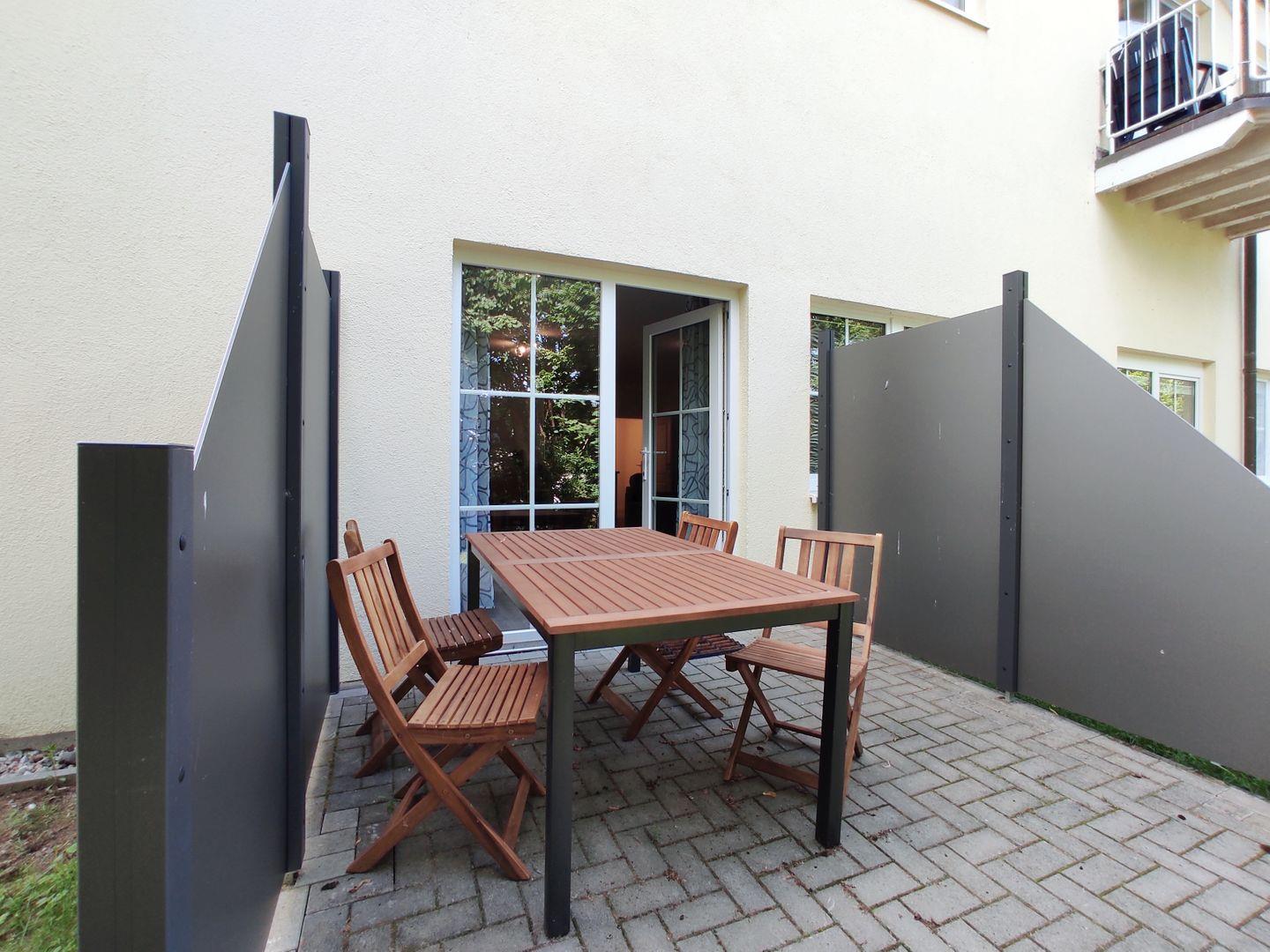 Die Terrasse der Ferienwohnung ist ein echtes Highlight. Hier können Sie die frische Luft genießen und sich auf den bequemen Gartenmöbeln entspannen. Ein Windschutz sorgt für Privatsphäre und Gemütlichkeit, während Sie den Tag im Freien verbringen.