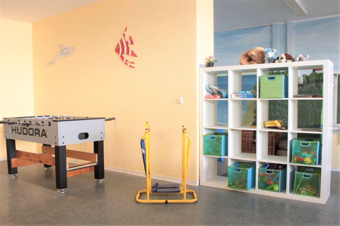 Für die Schlechtwettertage können Sie gerne den gemeinschaftlichen Aufenthaltsraum mit Kicker, Tischtennisplatte und Spielecke für die Kleinen nutzen.