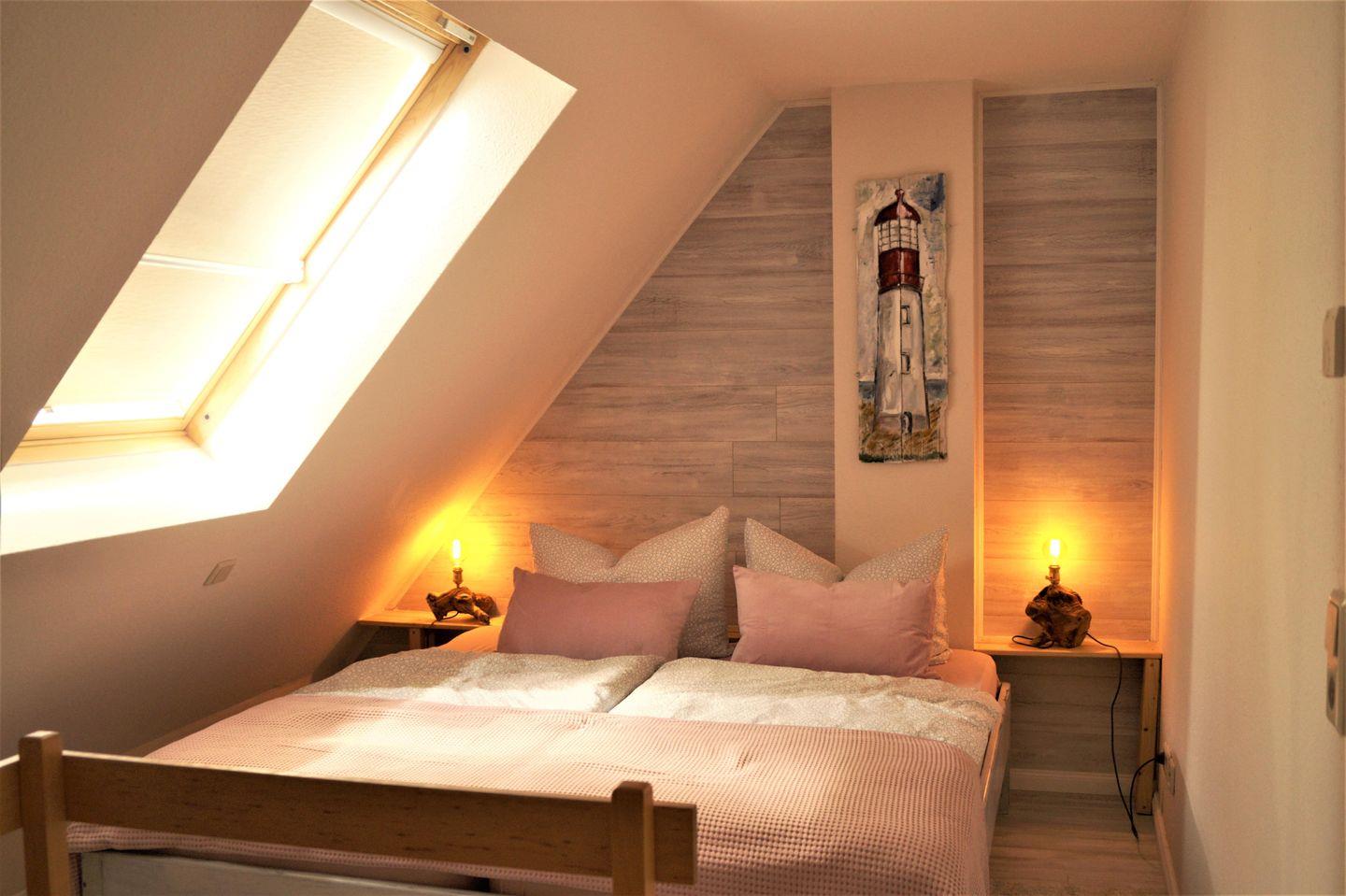 Das Schlafzimmer lädt mit einem gemütlichen Doppelbett und einem geräumigen Kleiderschrank zum Wohlfühlen ein. Hier können Sie nach einem erlebnisreichen Tag zur Ruhe kommen und den Klang der Wellen im Hintergrund genießen. Zur Unterhaltung stehen Ihnen ein Fernseher, ein DVD-Player und ein Radio zur Verfügung.