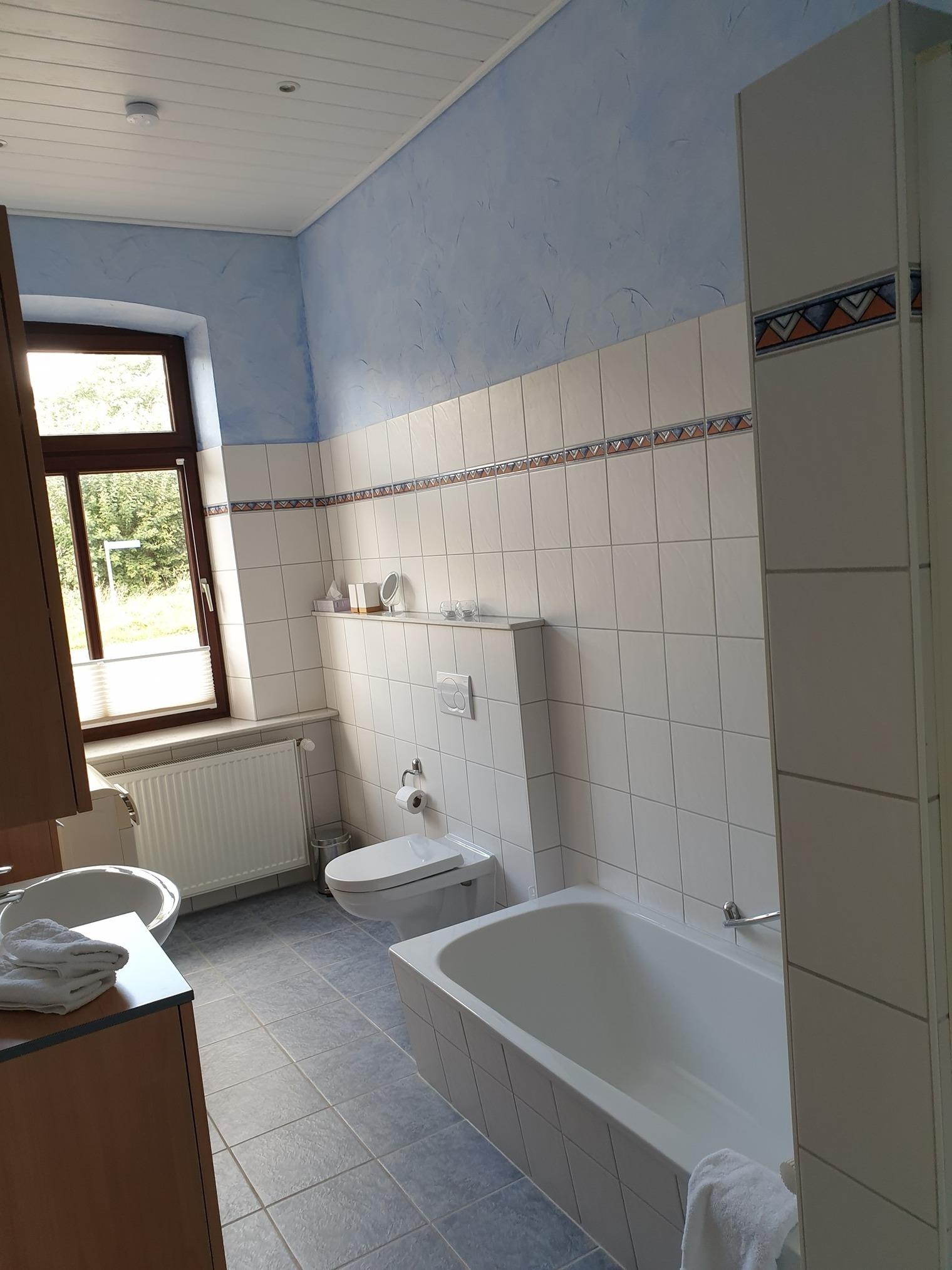 Das Bad verfügt sowohl über eine große Dusche als auch über eine Badewanne.