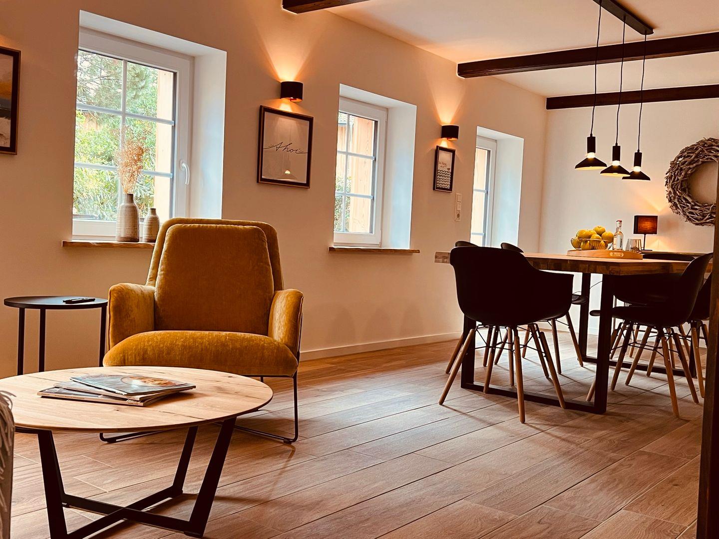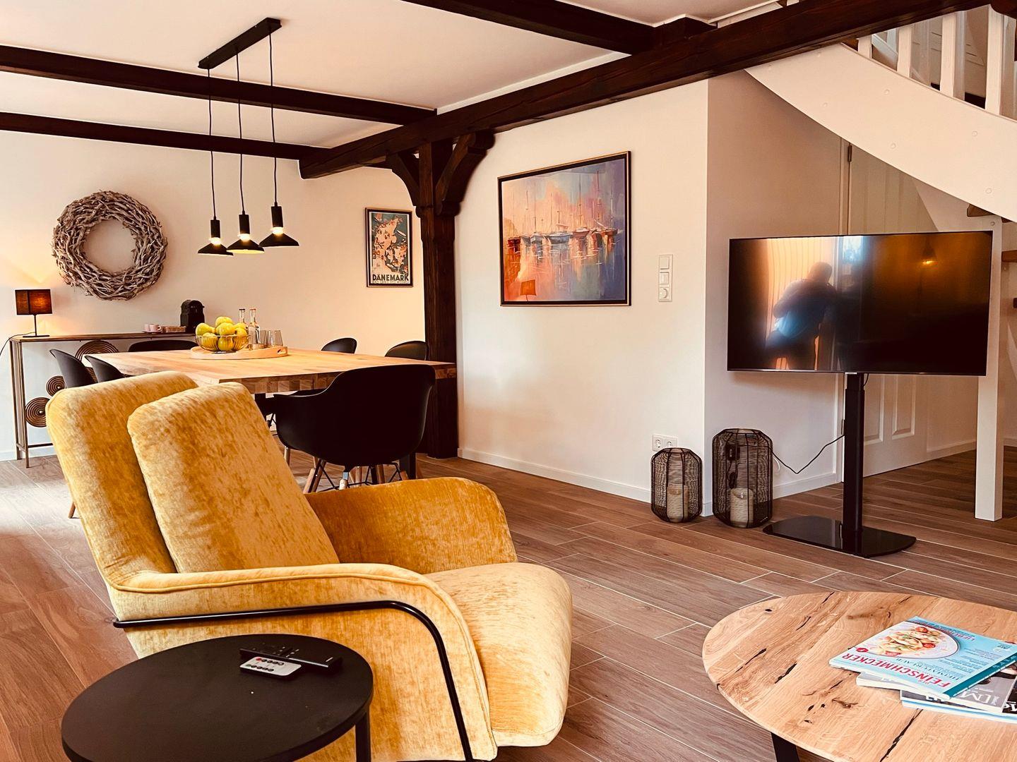 Der kombinierte Wohn- und Essbereich ist das Herzstück der Wohnung. Hier finden Sie einen einladenden Esstisch, der Platz für bis zu 8 Personen bietet – perfekt für gesellige Abende. Gemütliche Sofas und Sessel laden zum Entspannen ein. Die offene Küche ist mit hochwertigen Geräten ausgestattet, darunter ein Induktionskochfeld, Backofen, Kühlschrank mit Gefrierfach, Spülmaschine sowie eine Nespresso-Kapselmaschine. Für zusätzlichen Komfort stehen Ihnen auch ein Wasserkocher, Toaster und Handrührgerät zur Verfügung.