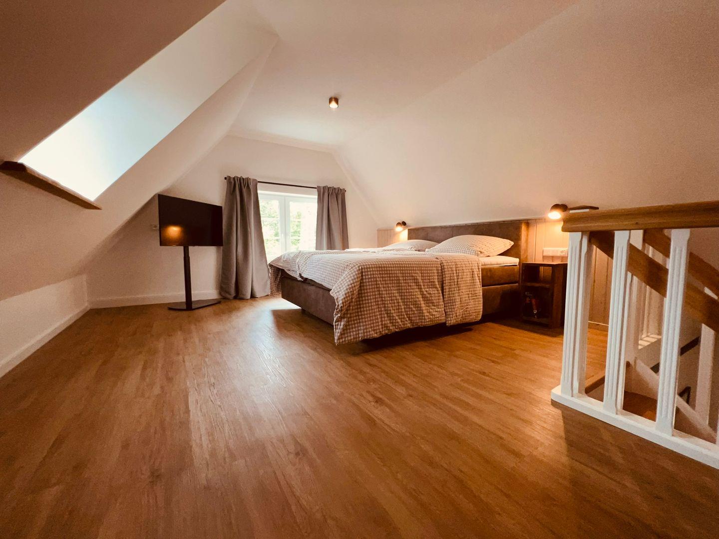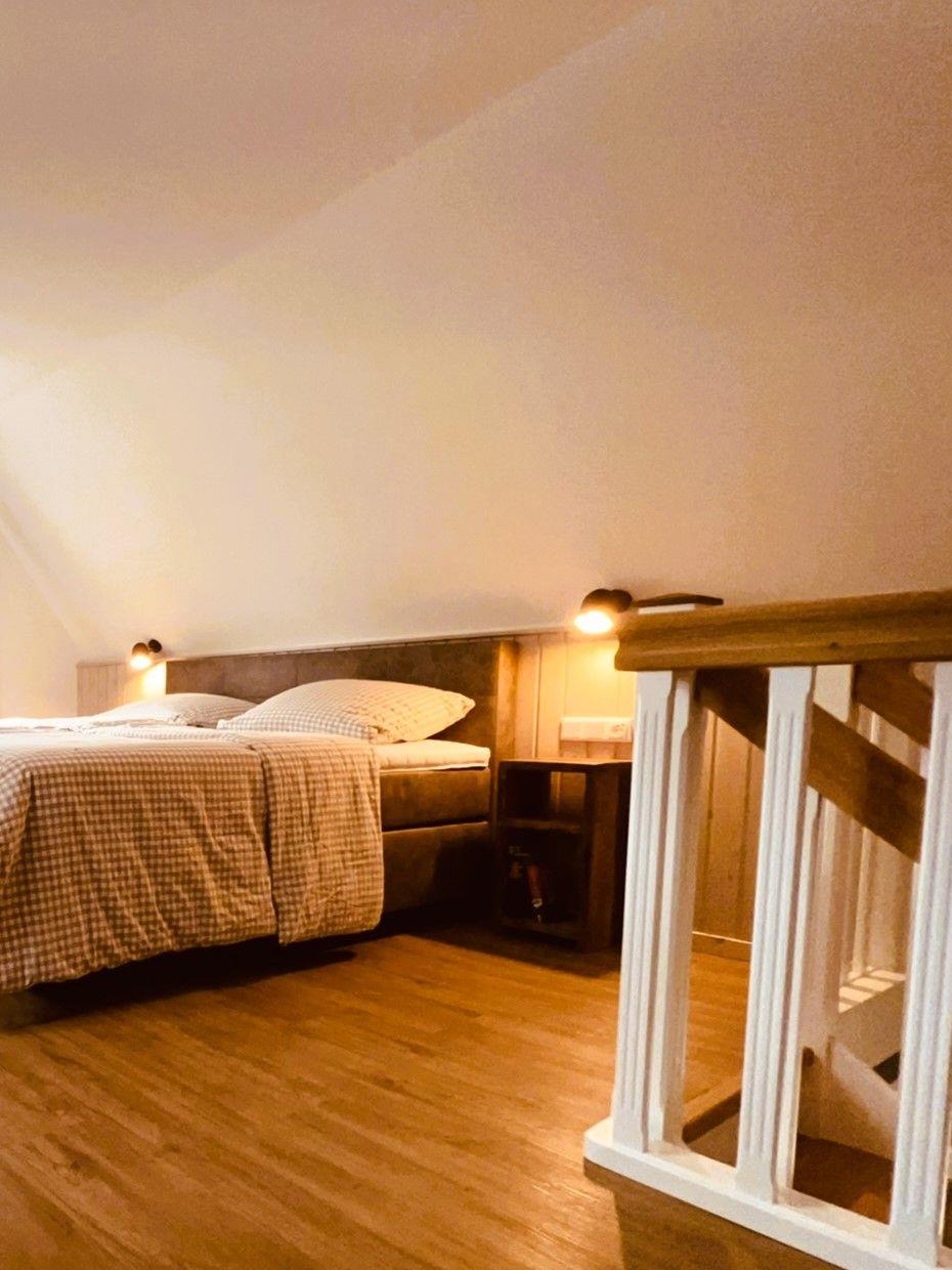 Das Schlafzimmer befindet sich auf einer offenen Galerie und verfügt über ein komfortables Boxspringbett (180x200) mit offenem Fußende. Ein Kleiderschrank sorgt für ausreichend Stauraum, während Verdunklungsmöglichkeiten für erholsame Nächte sorgen. Das moderne Badezimmer ist mit einer ebenerdigen Dusche, WC, Haartrockner sowie einem Waschbecken ausgestattet und bietet durch ein Fenster Tageslicht.