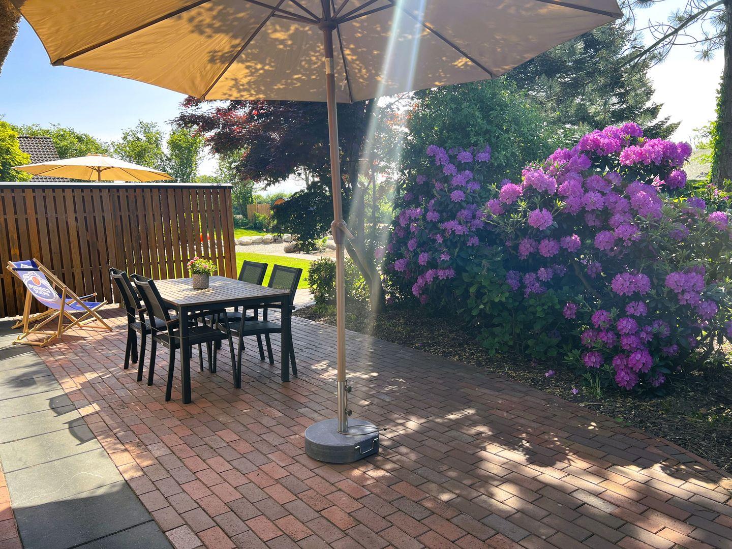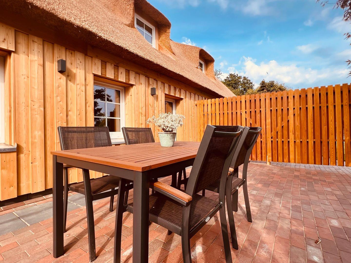 Genießen Sie die Sonne auf Ihrer eigenen Terrasse mit Südausrichtung, ausgestattet mit Gartenmöbeln, Sonnenschirm und Windschutz. Der Gemeinschaftsgarten lädt zum Verweilen ein, während die Gartensauna (Fasssauna - kostenpflichtig - 6,00 € pro Stunde) zur gemeinsamen Nutzung bereitsteht (Münzautomat)– ideal für entspannende Stunden nach einem aktiven Tag. Bitte beachten Sie, dass das Grillen aufgrund des Reetdaches nicht gestattet ist.
