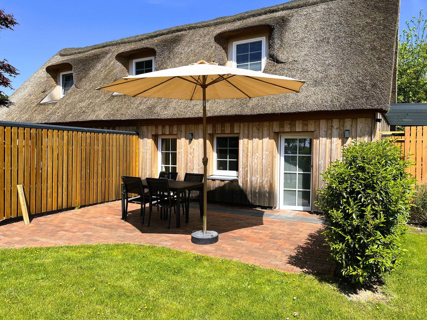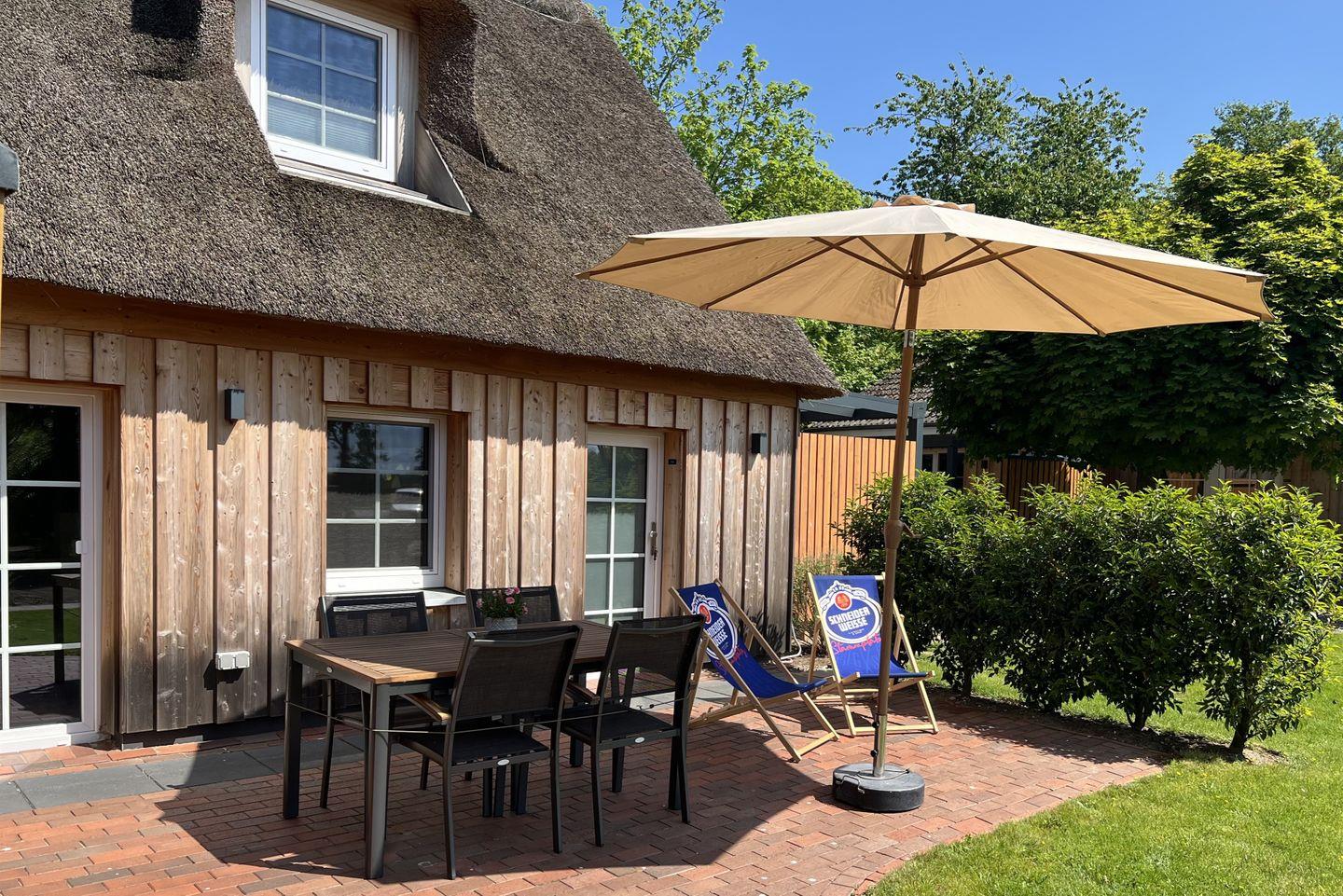 Im Außenbereich steht den Gästen eine Gartensauna (Fasssauna) zur Gemeinschaftsnutzung zur Verfügung, ergänzt durch eine Außendusche. Die Nutzung der Sauna kostet 6,00 € pro Stunde (Münzautomat). Der Gemeinschaftsgarten mit Liegewiese sowie die eigene Terrasse sind perfekt zum Entspannen geeignet; Gartenmöbel, Sonnenschirm und Windschutz sind vorhanden. Bitte beachten Sie, dass aufgrund des Reetdaches das Grillen nicht gestattet ist.