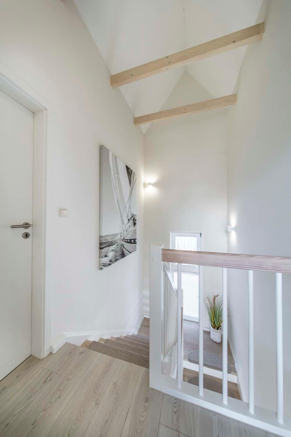 Auf zwei Wohnebenen spürst du im Strandhaus pure, ganz gelassene Ferienstimmung. Der Einrichtungsstil ist frisch und elegant: helles Weiß, warme Naturtöne, kombiniert mit stilvollen maritimen Schwarz-Weiß-Fotografien an den Wänden.