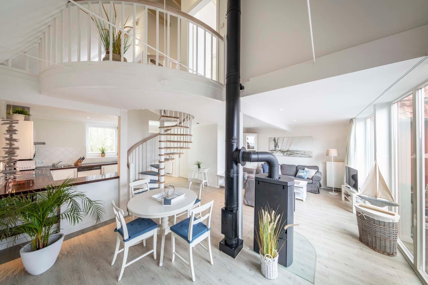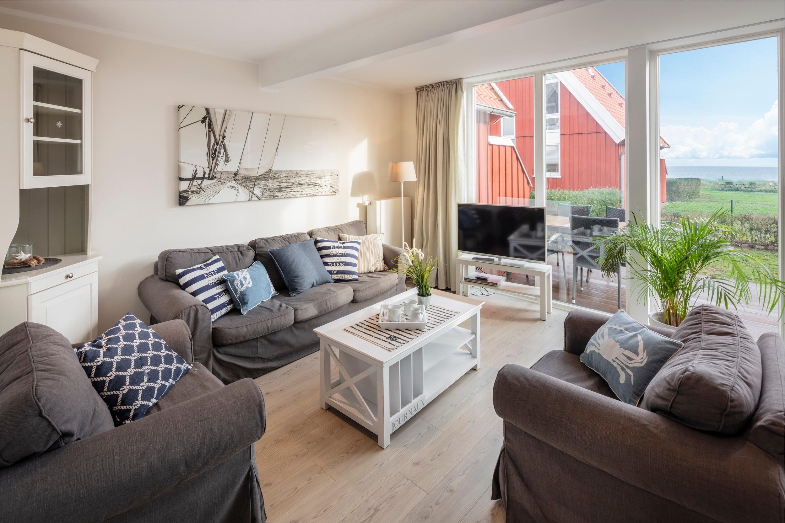 Auf zwei Wohnebenen spürst du im Strandhaus pure, ganz gelassene Ferienstimmung. Der Einrichtungsstil ist frisch und elegant: helles Weiß, warme Naturtöne, kombiniert mit stilvollen maritimen Schwarz-Weiß-Fotografien an den Wänden.