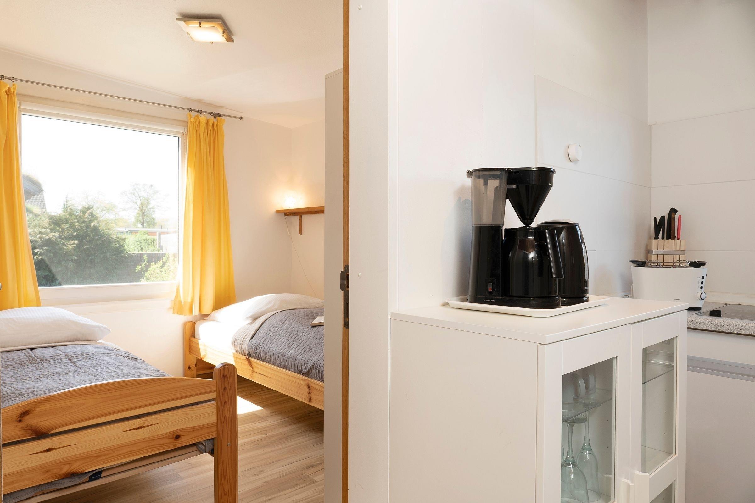 Ihr Ferienhäuschen empfängt Sie mit einem großzügigen Wohnzimmer mit Essplatz und einer gemütlichen Schlafcouch (80x200 cm). Das separate Schlafzimmer ist mit 2 Einzelbetten (je 90x200 cm) ausgestattet. Die gut ausgestattete Küchenzeile lädt zum Kochen ein und im hellen Badezimmer starten Sie erfrischt in den neuen Urlaubstag! Der WLAN-Zugang ist inklusive.