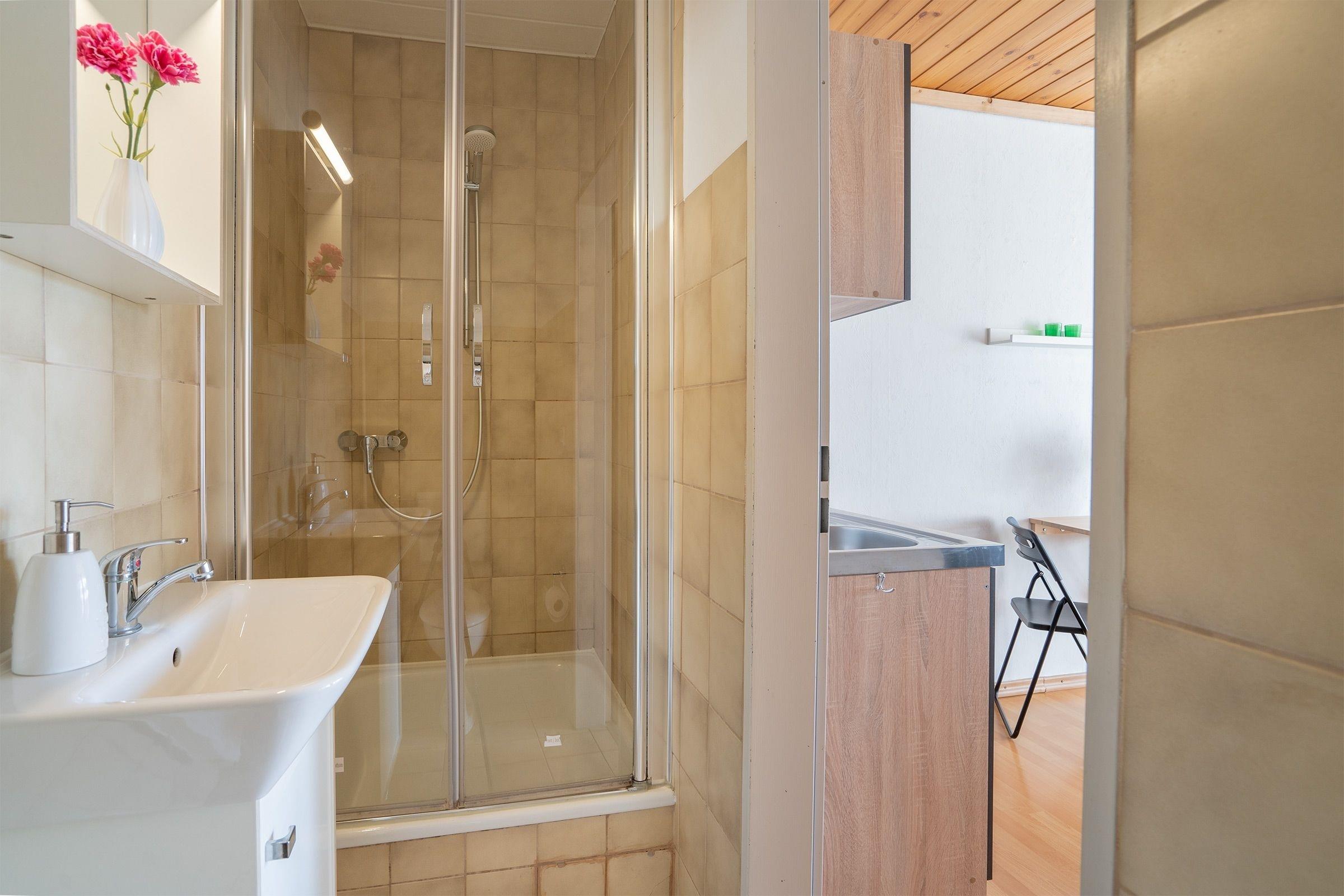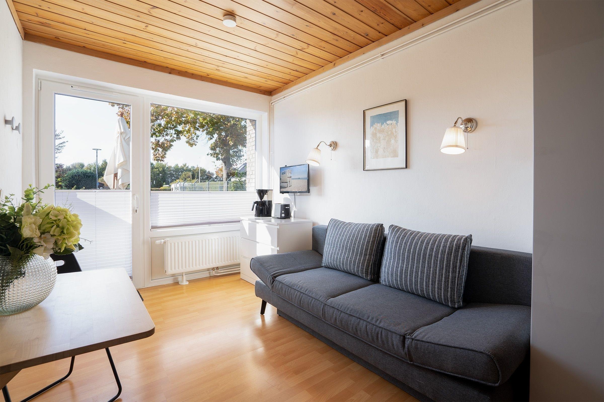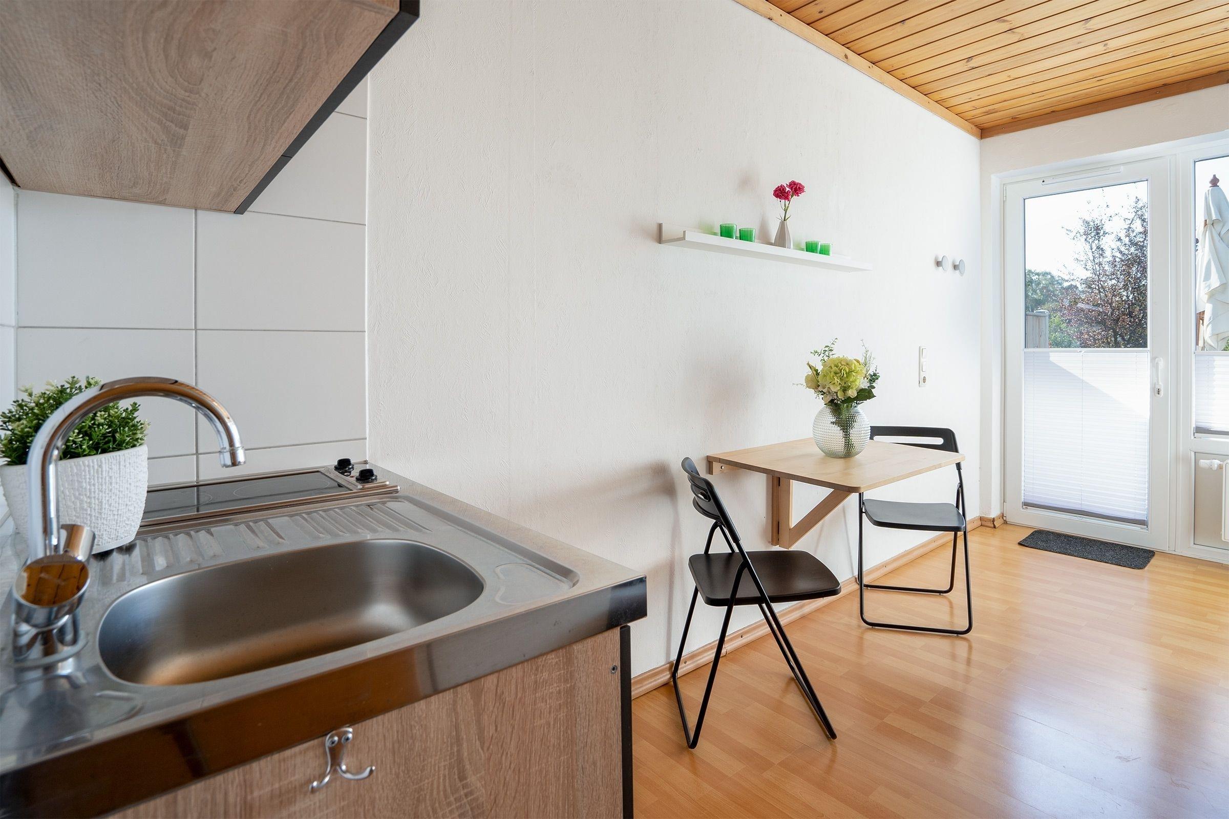 Das 1-Zimmer Apartment im Erdgeschoss verfügt über eine kleine Pantryküche, die ausgestattet ist mit einem Herd, Kühlschrank mit Gefrierfach, Wasserkocher, Toaster und Kaffeemaschine, ein Badezimmer mit Dusche, ein Wohnschlafzimmer mit Schlafsofa (140x195 cm), TV und direkten Zugang zur Terrasse. Als Highlight verfügt dieses Haus über einen großen Gemeinschaftsgarten.