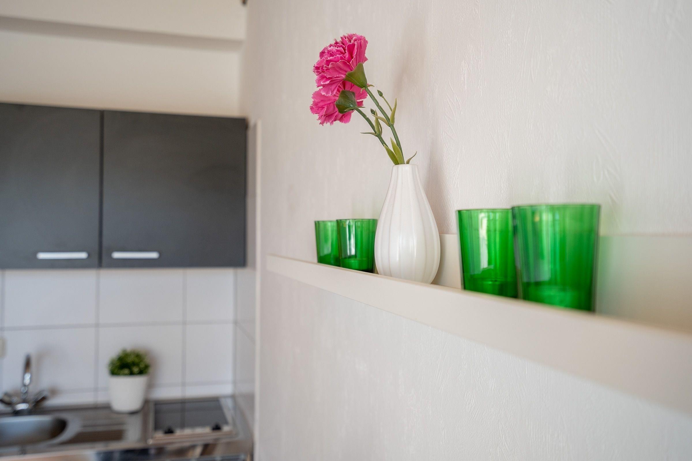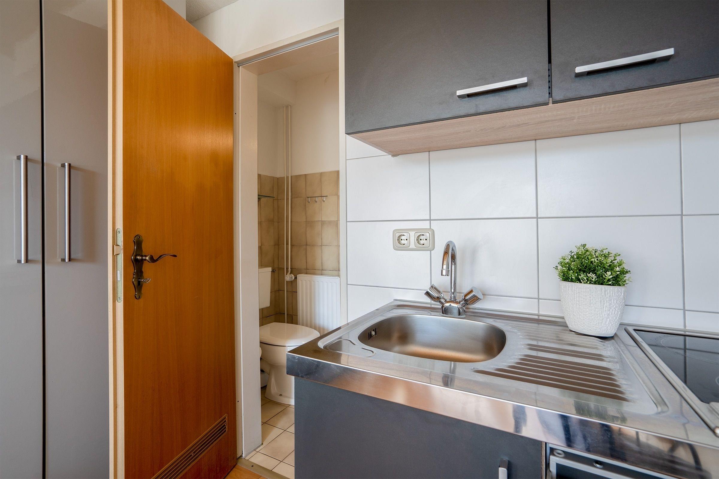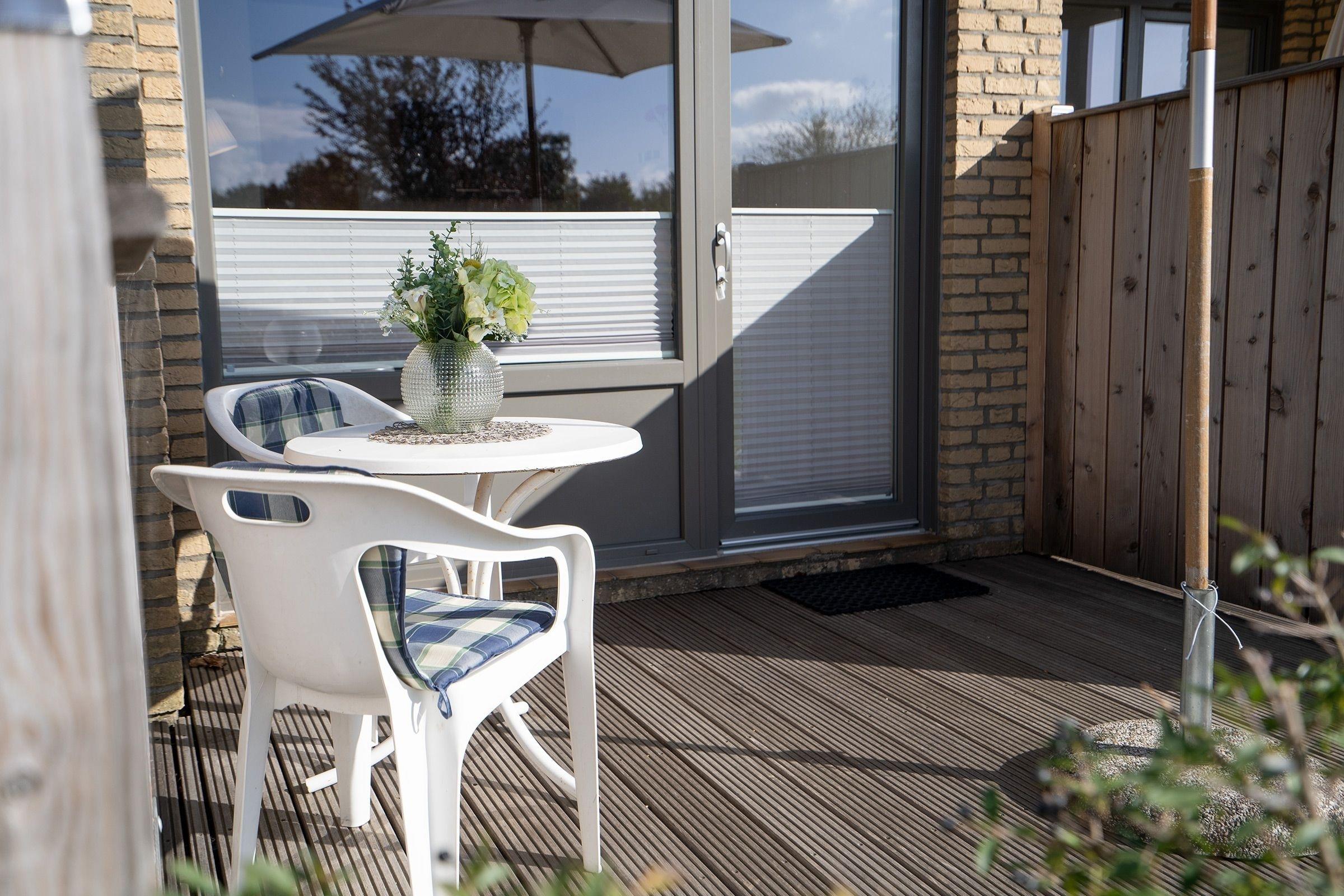 Das 1-Zimmer Apartment im Erdgeschoss verfügt über eine kleine Pantryküche, die ausgestattet ist mit einem Herd, Kühlschrank mit Gefrierfach, Wasserkocher, Toaster und Kaffeemaschine, ein Badezimmer mit Dusche, ein Wohnschlafzimmer mit Schlafsofa (140x195 cm), TV und direkten Zugang zur Terrasse. Als Highlight verfügt dieses Haus über einen großen Gemeinschaftsgarten.
