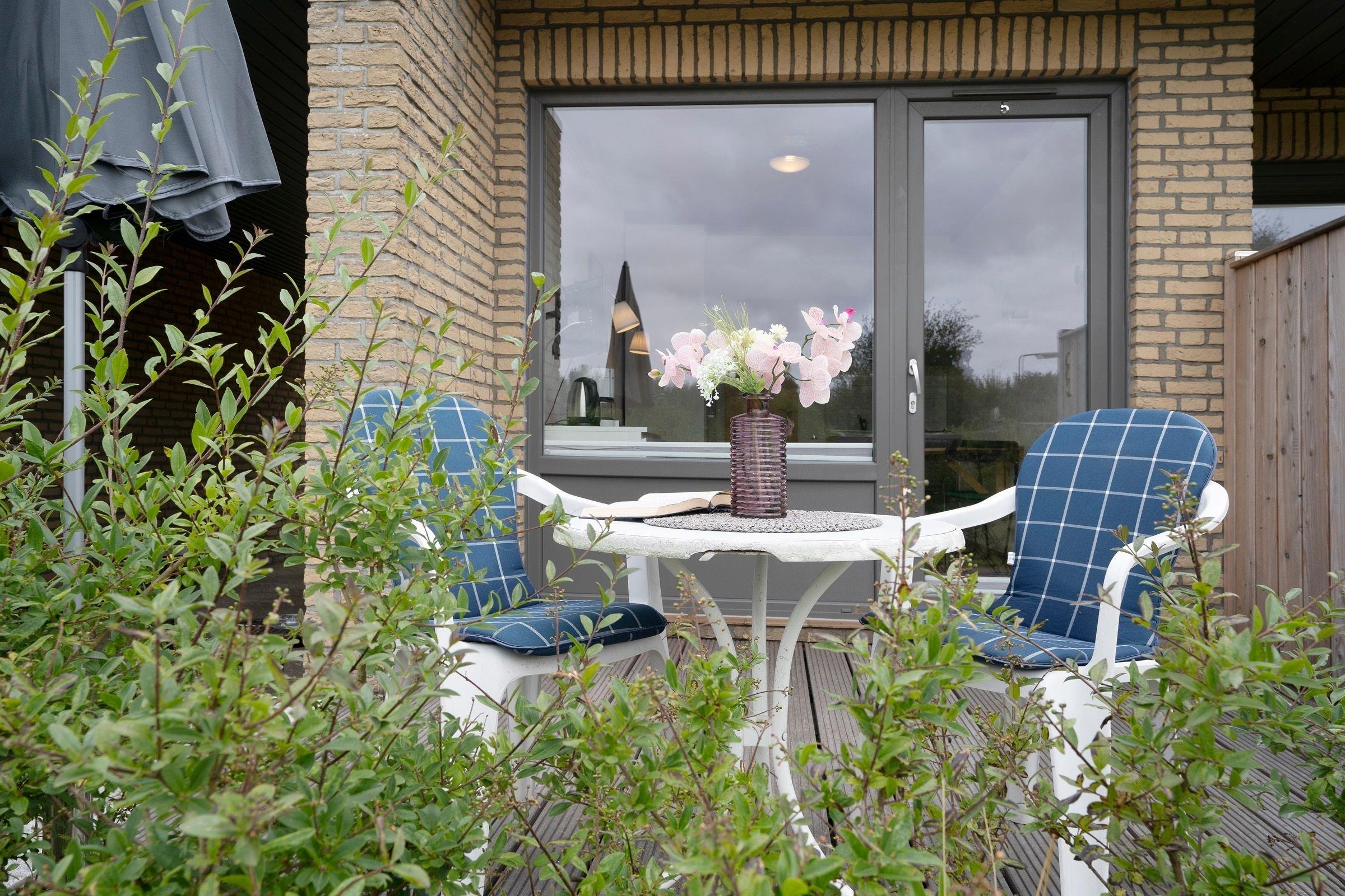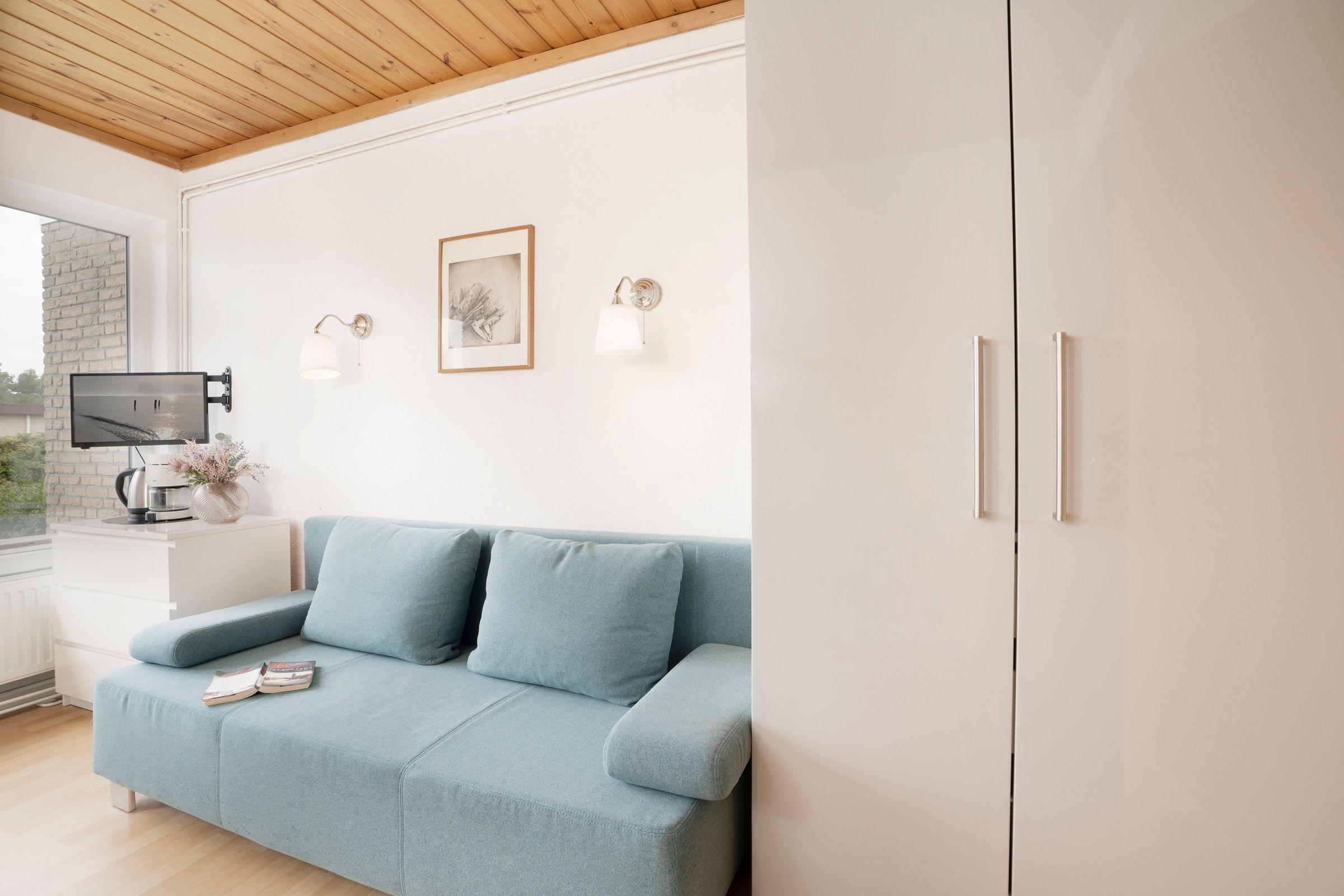 Das 1-Zimmer Apartment im Erdgeschoss verfügt über eine kleine Pantryküche, die ausgestattet ist mit einem Herd, Kühlschrank mit Gefrierfach, Wasserkocher, Toaster und Kaffeemaschine, ein Badezimmer mit Dusche, ein Wohnschlafzimmer mit Schlafsofa (140x190 cm), TV und direkten Zugang zur Süd-Terrasse. Als Highlight verfügt dieses Haus über einen großen Gemeinschaftsgarten.