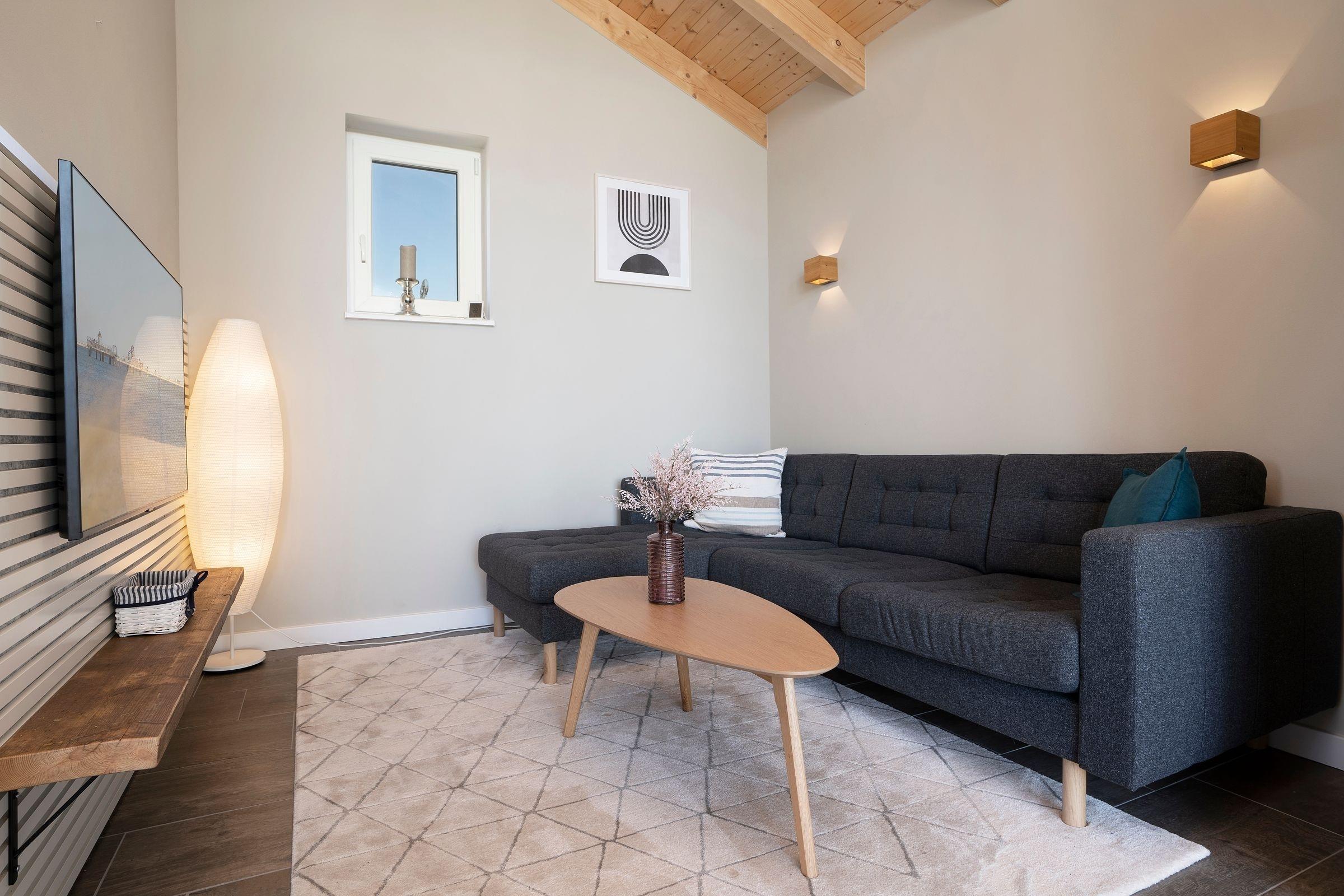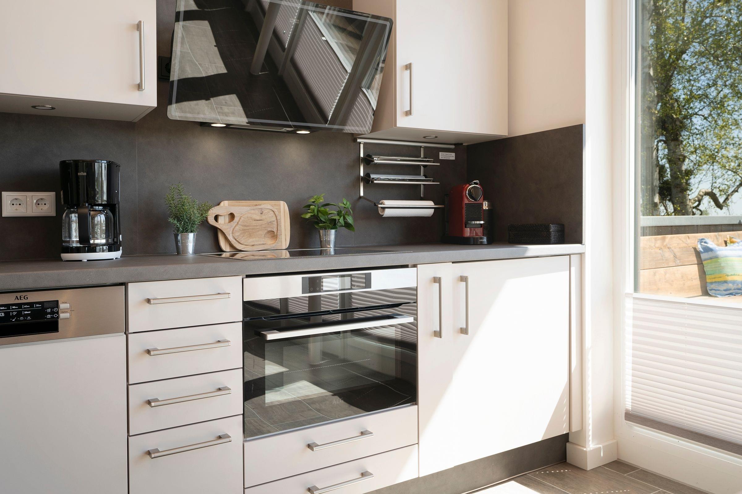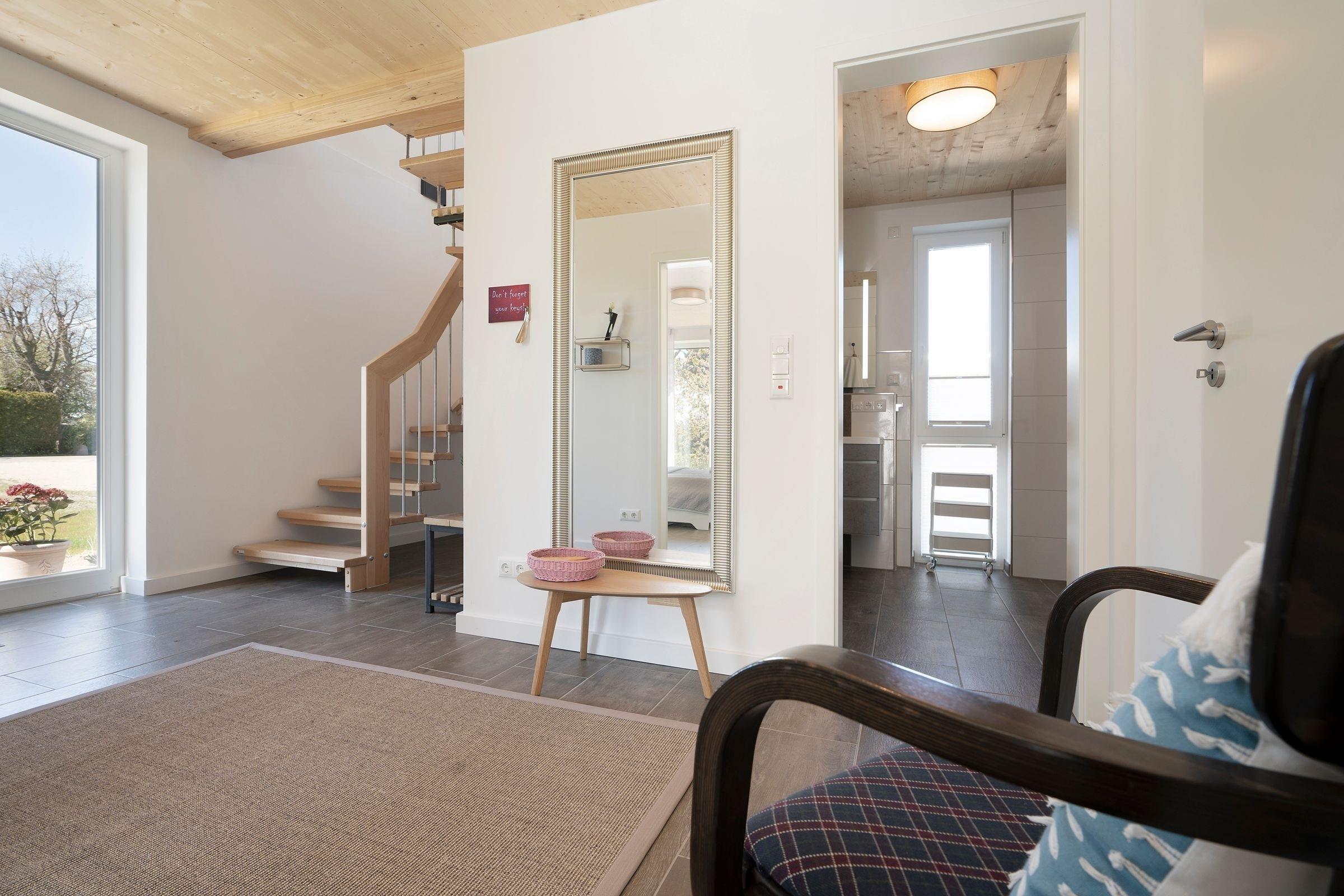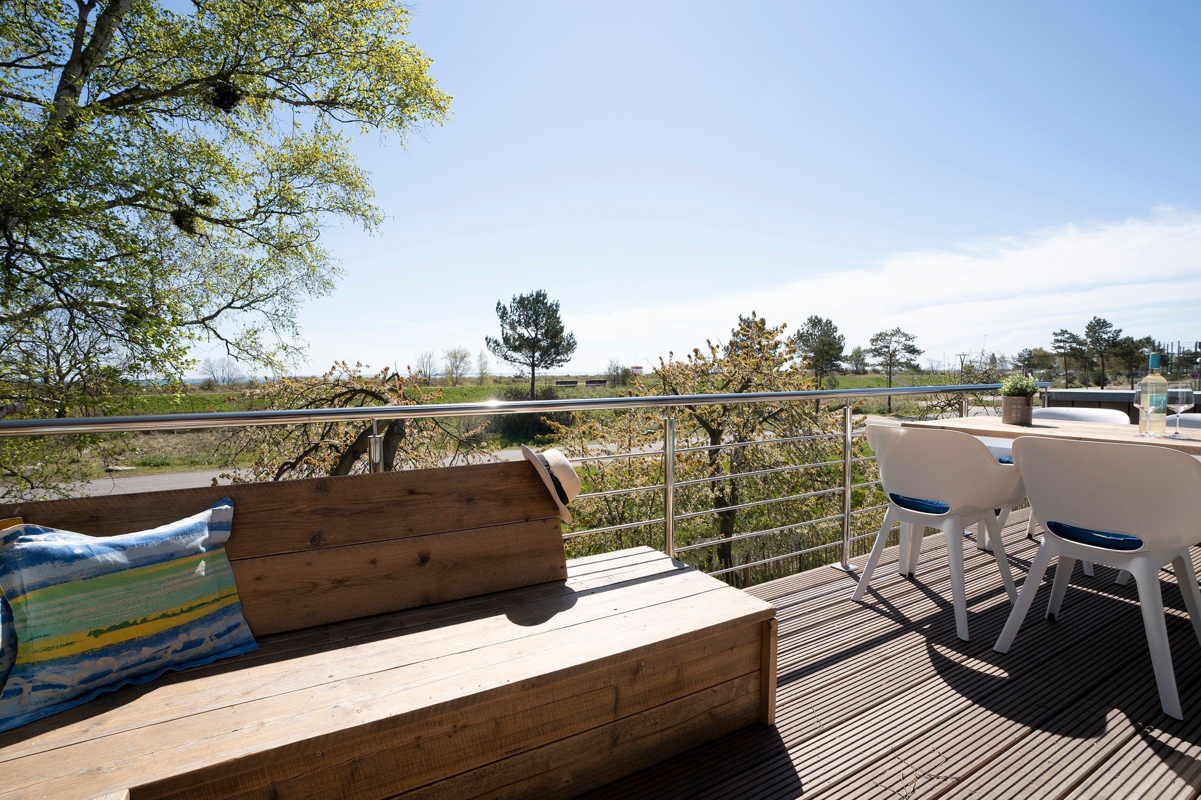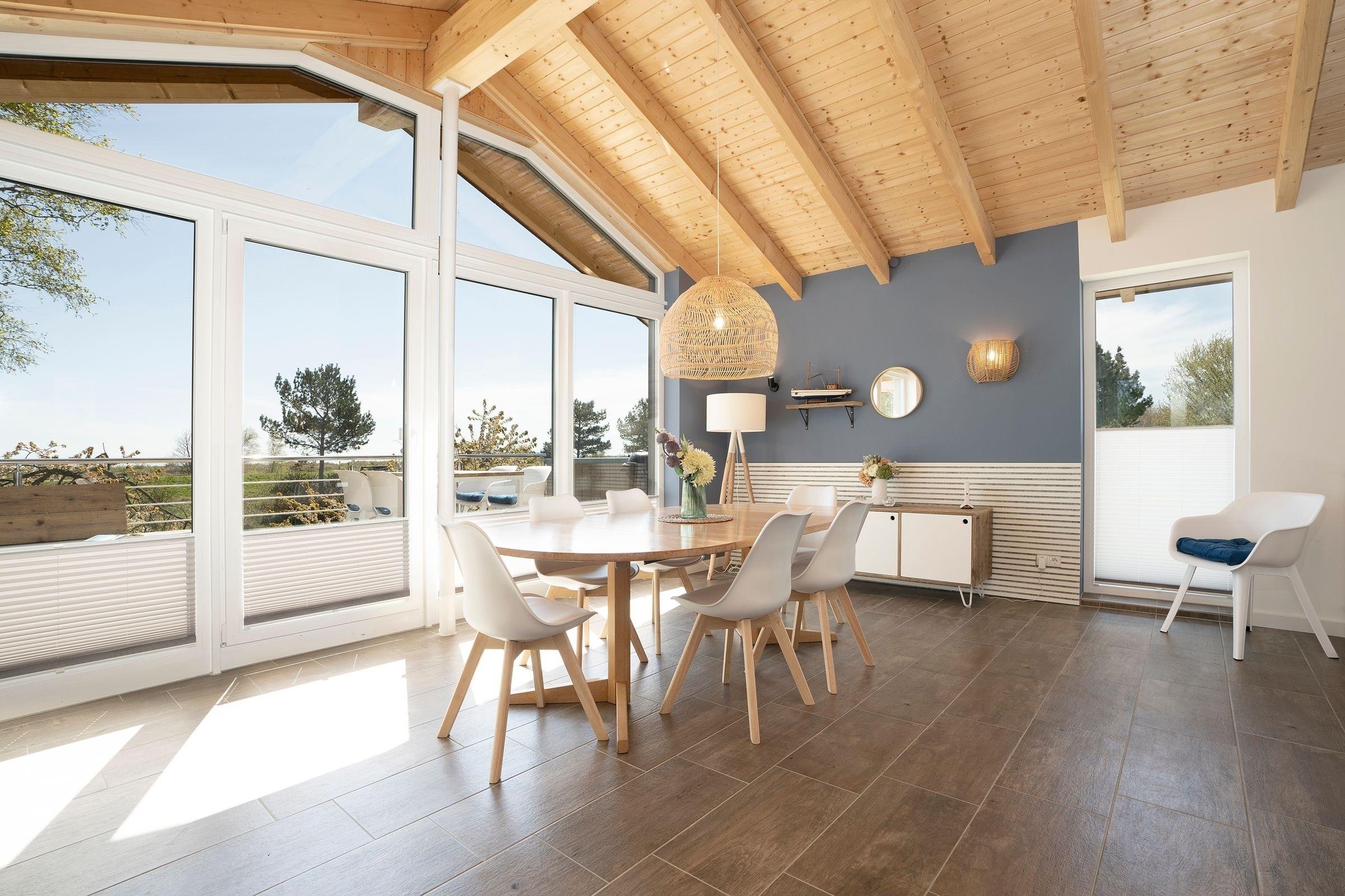 Das Wohnkonzept dieses modernen Ferienhauses wurde der tollen Lage ideal angepasst. Über eine Treppe gelangen Sie in den offenen, lichtdurchfluteten Wohnbereich im ersten Obergeschoss. Die Küche mit großzügigem Essplatz, der vor der Fensterfront mit fantastischem Blick auf die Ostsee platziert ist, lädt zum Kochen, Essen und gemeinsamer Familienzeit ein. Ein gemütlicher Fernsehbereich mit Sofa integriert sich charmant in den Raum. Auf der großen Holzdachterrasse können Sie viele Sonnenstunden genießen - eine Sitzgruppe für Mahlzeiten, ein Elektrogrill sowie eine rustikale Holzbank laden zum Verweilen ein.
