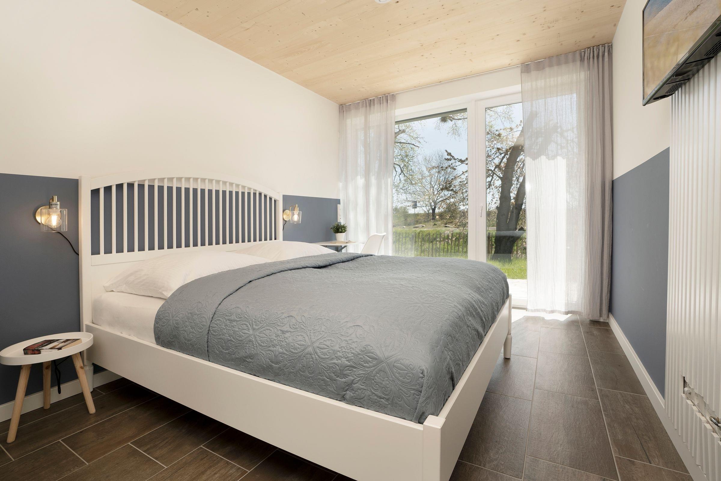 Schlafzimmer 1 (EG): Doppelbett (ca. 160x200cm), Kleiderschrank, TV, Verdunkelung (Außenjalousien), Platz für Kinderreisebett vorhanden